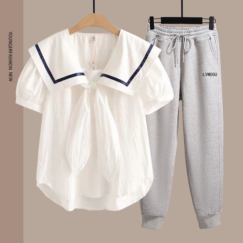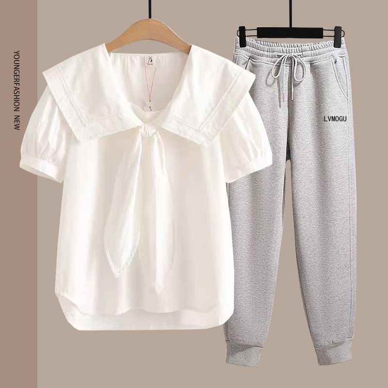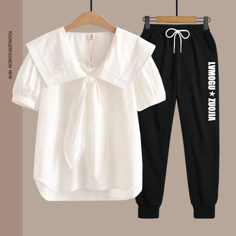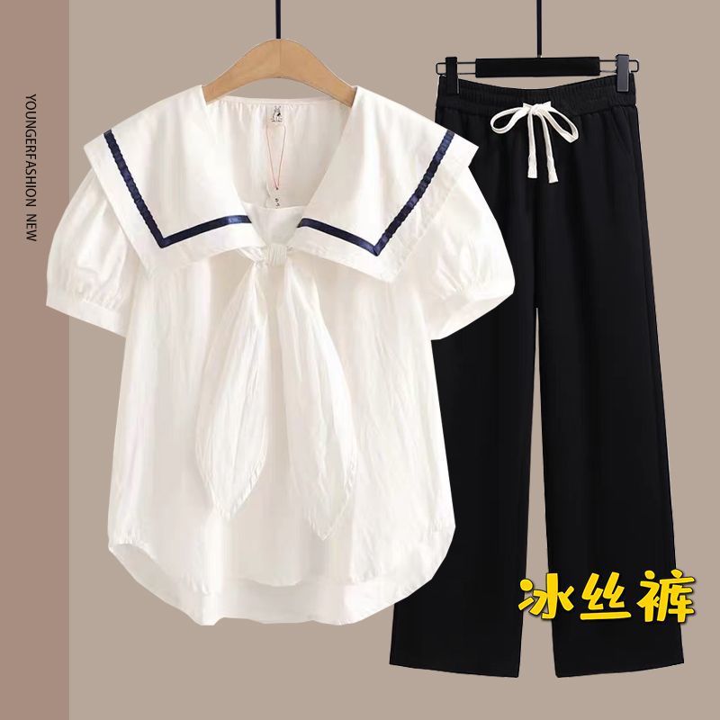 여름 여성 반팔 양복 중학생 소녀 반팔 티셔츠 양복 대학 스타일 얇은 얼음 실크 바지 싱글/세트