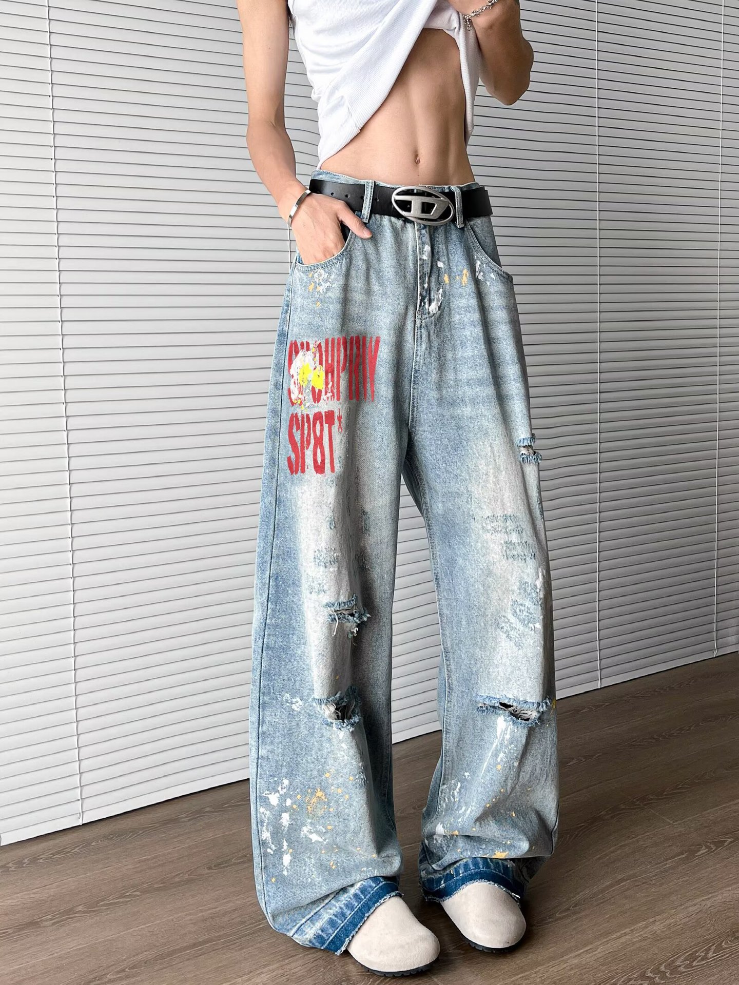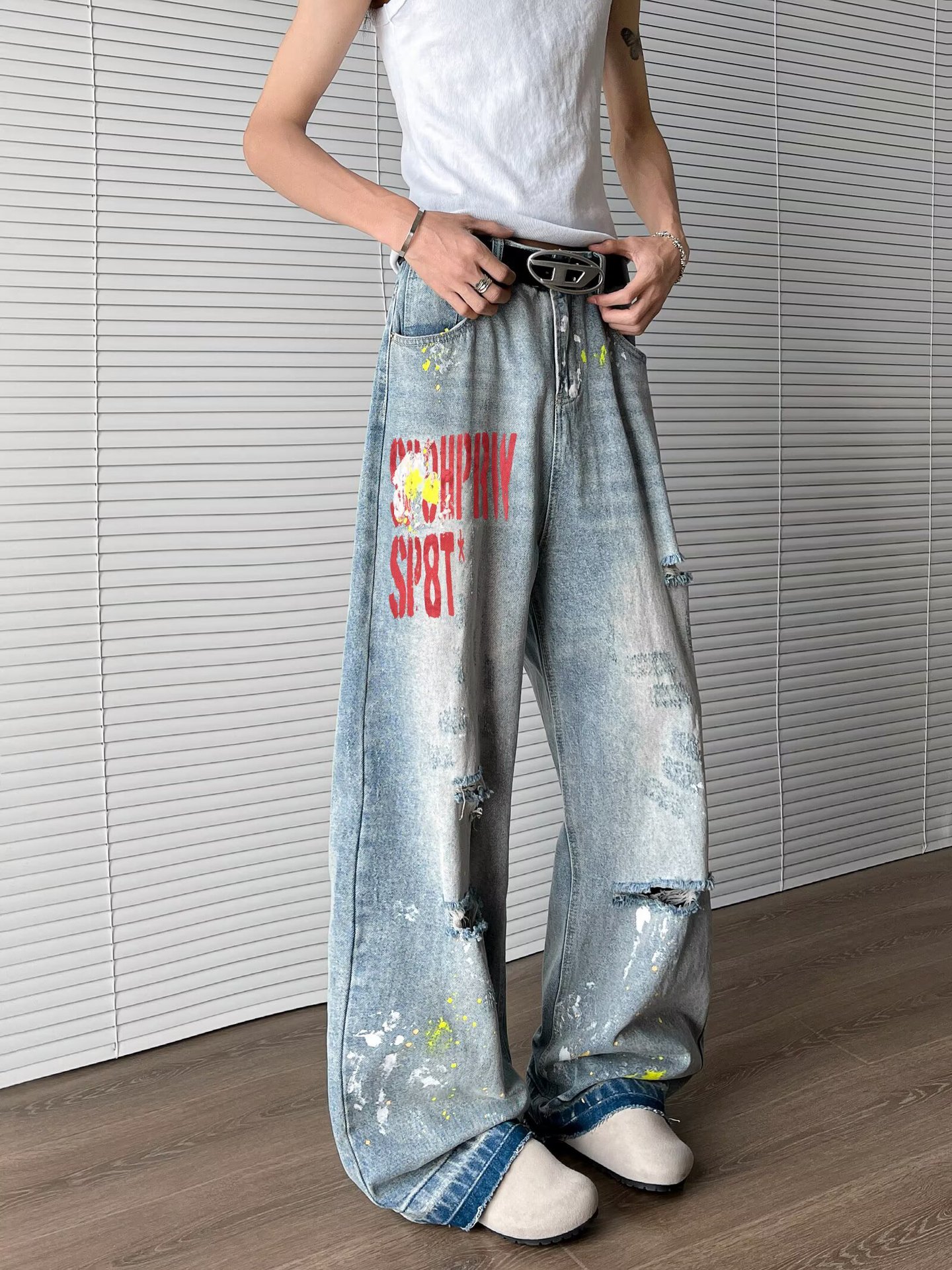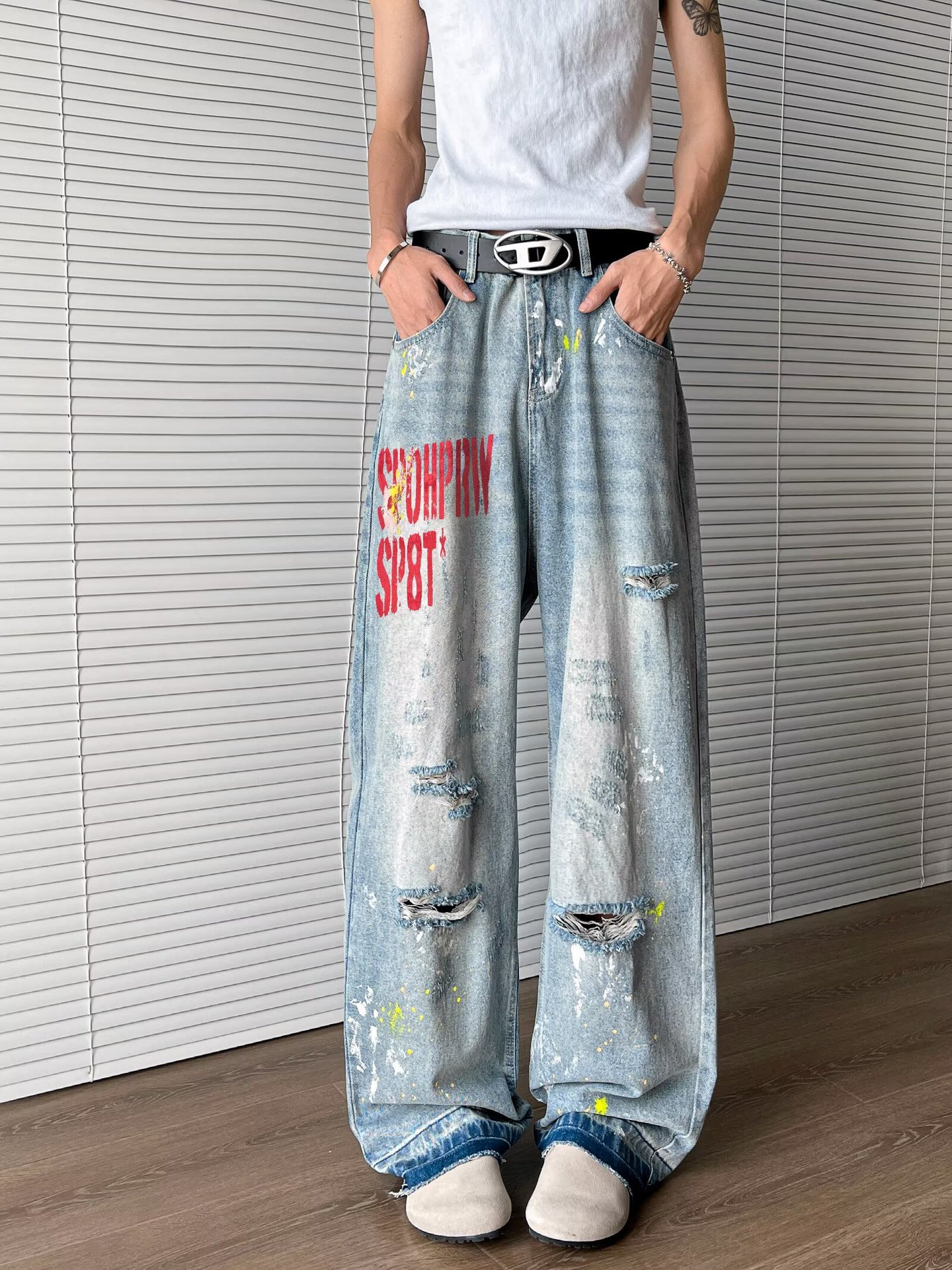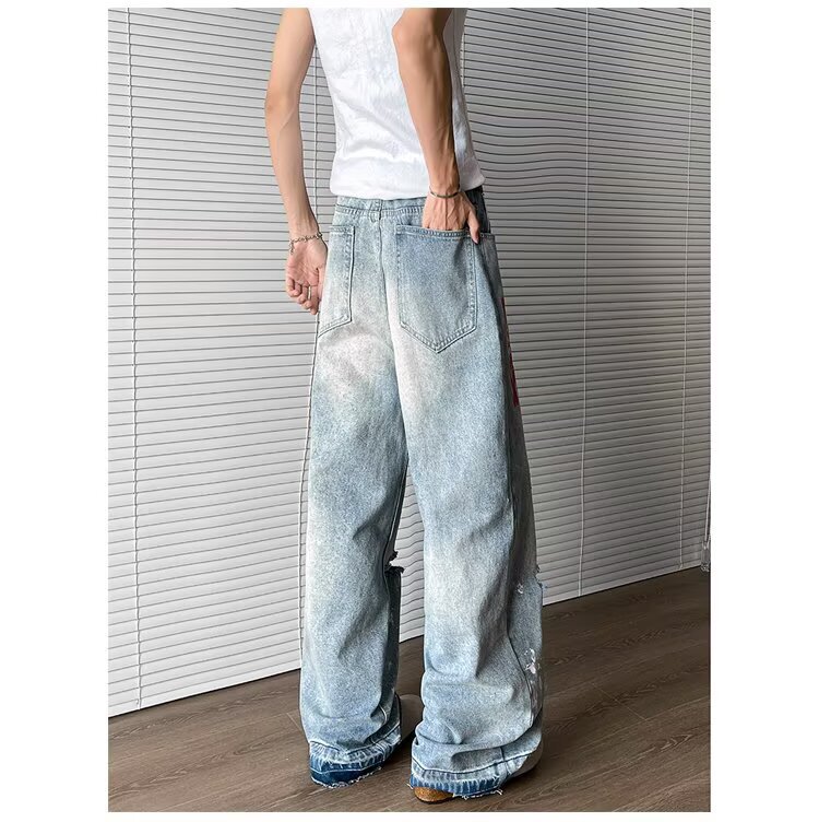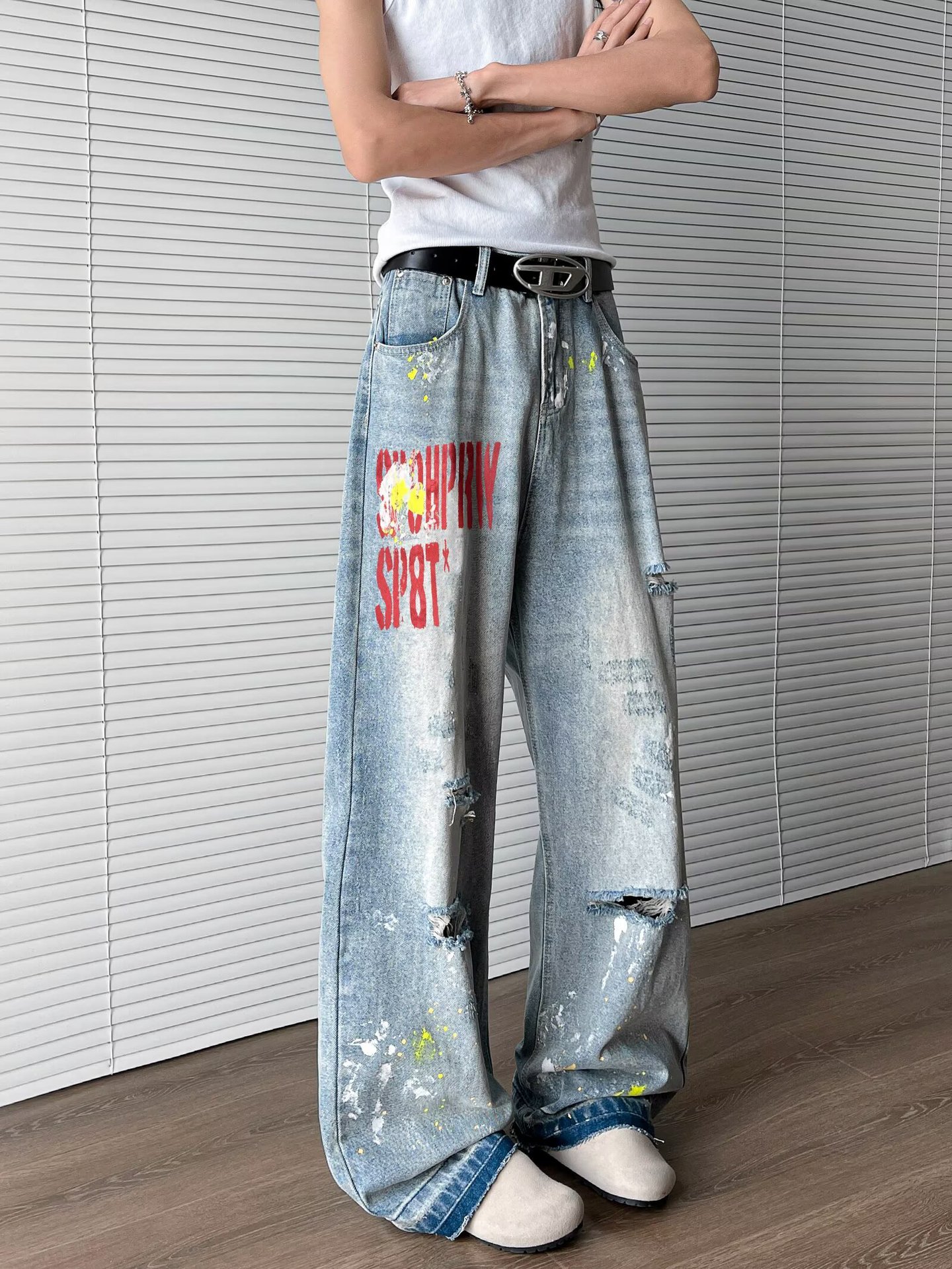 아메리칸 하이 스트리트 바이브 워싱 스플래시 잉크 찢어진 청바지 남성 트렌디 패셔너블 레터 자수 루즈 스트레이트 팬츠