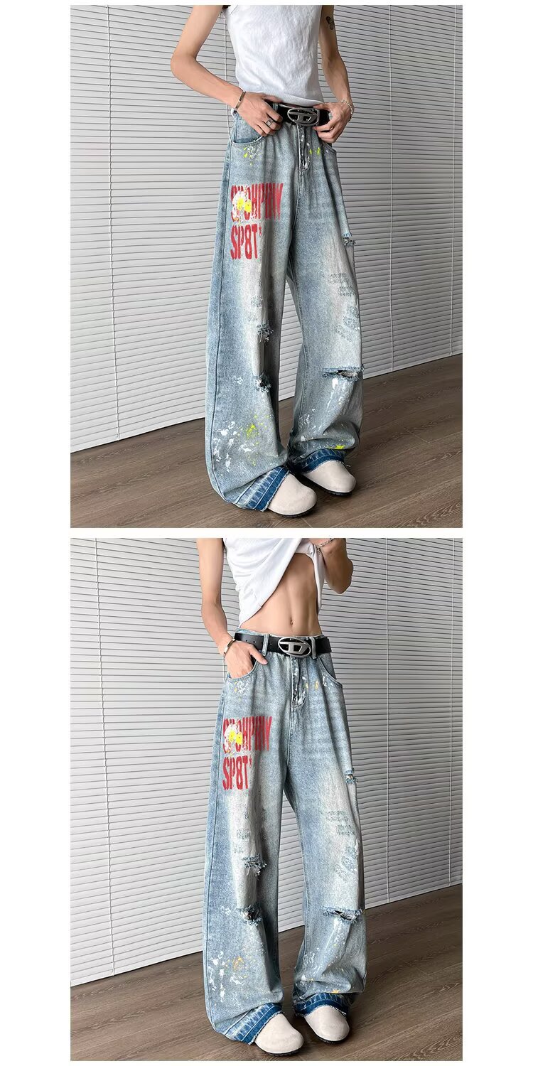아메리칸 하이 스트리트 바이브 워싱 스플래시 잉크 찢어진 청바지 남성 트렌디 패셔너블 레터 자수 루즈 스트레이트 팬츠스토어 가기