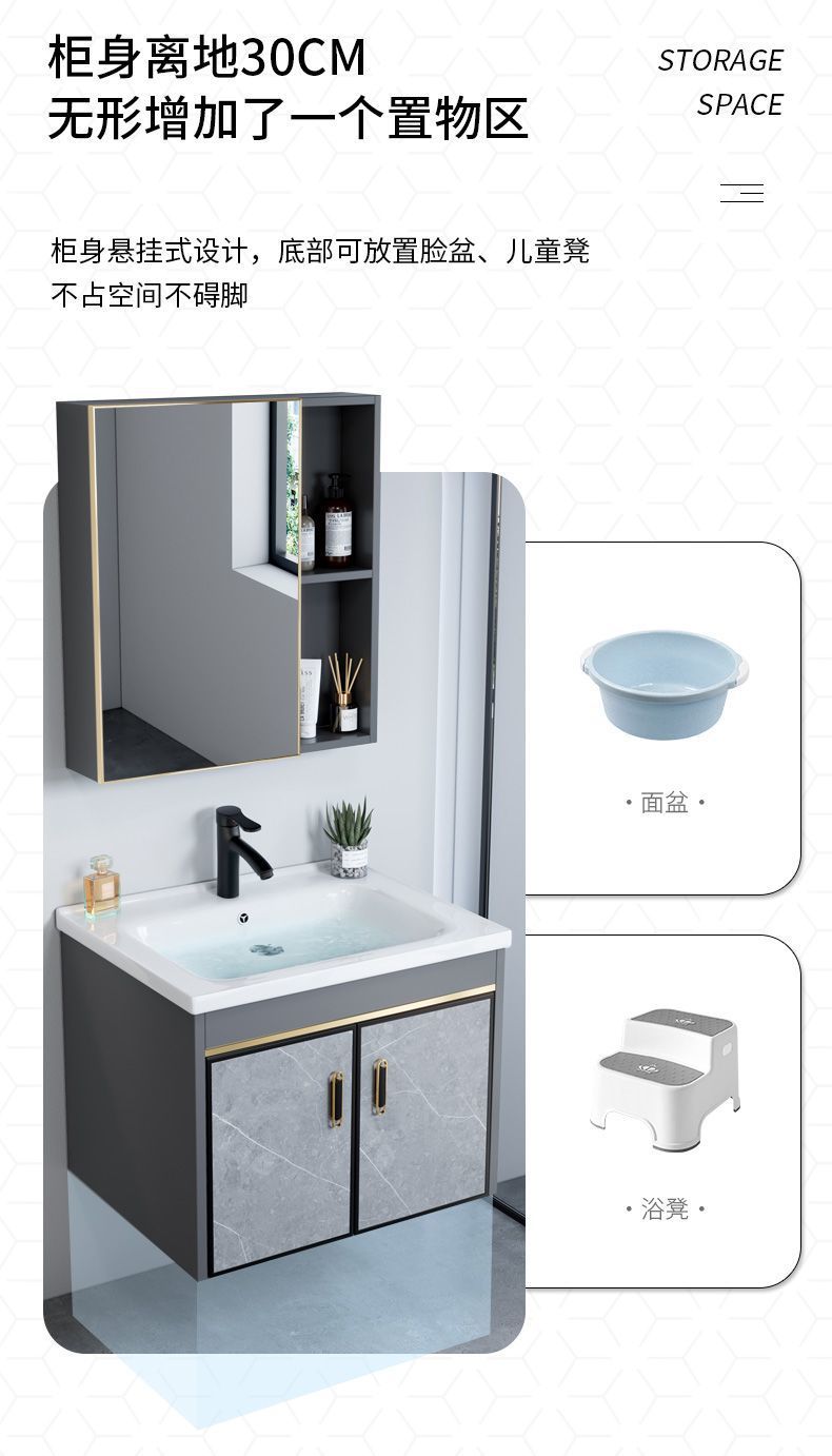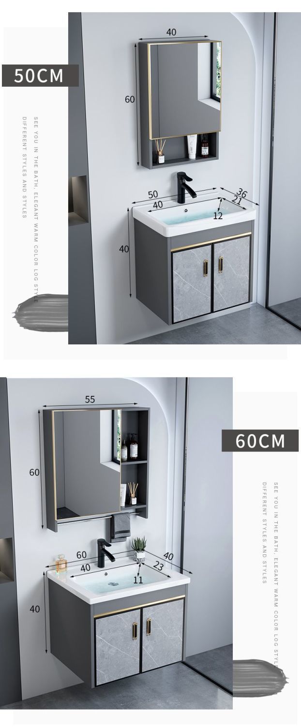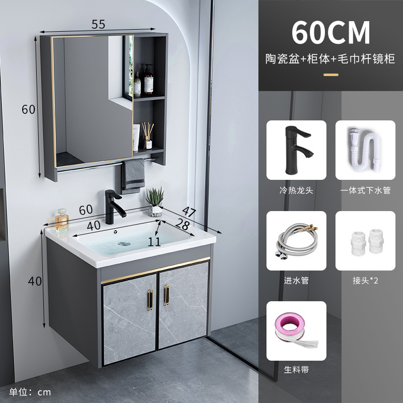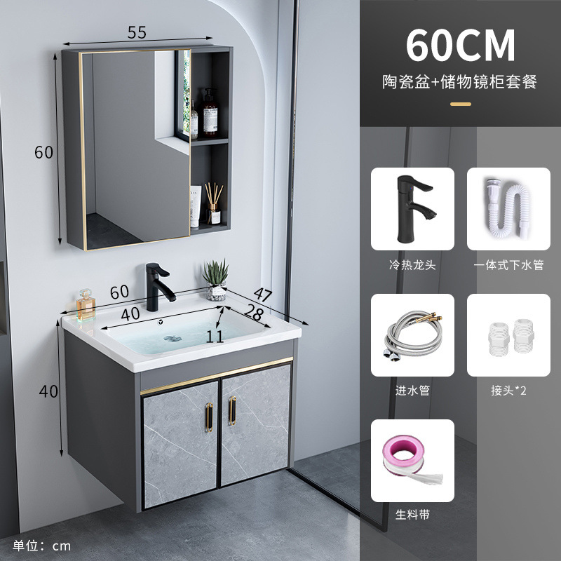 • 그레이 골드 스톤 패턴 캐비닛-60*40 세라믹 세면대 + 수건 거울 캐비닛