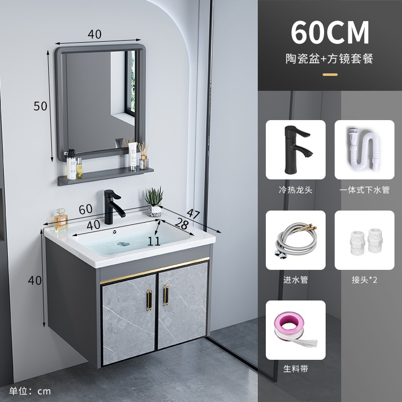 • 그레이 골드 스톤 패턴 캐비닛-60*47 세라믹 세면대 + 거울 캐비닛