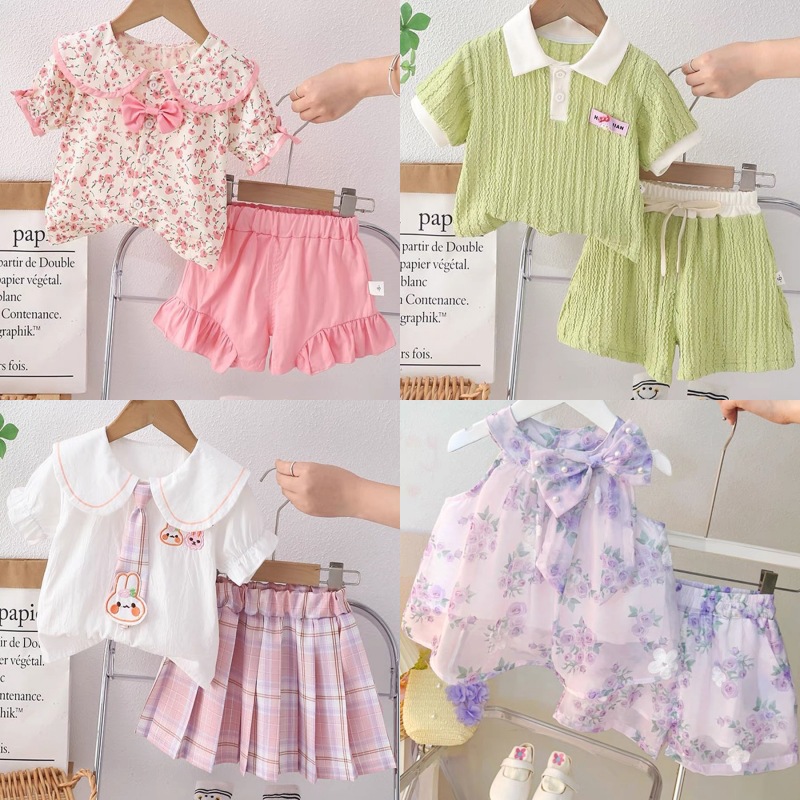 여자 반팔 양복 2025 새로운 유행 스타일 옷 아기 소녀 여름 반팔 반바지 패션 투피스 세트스토어 가기