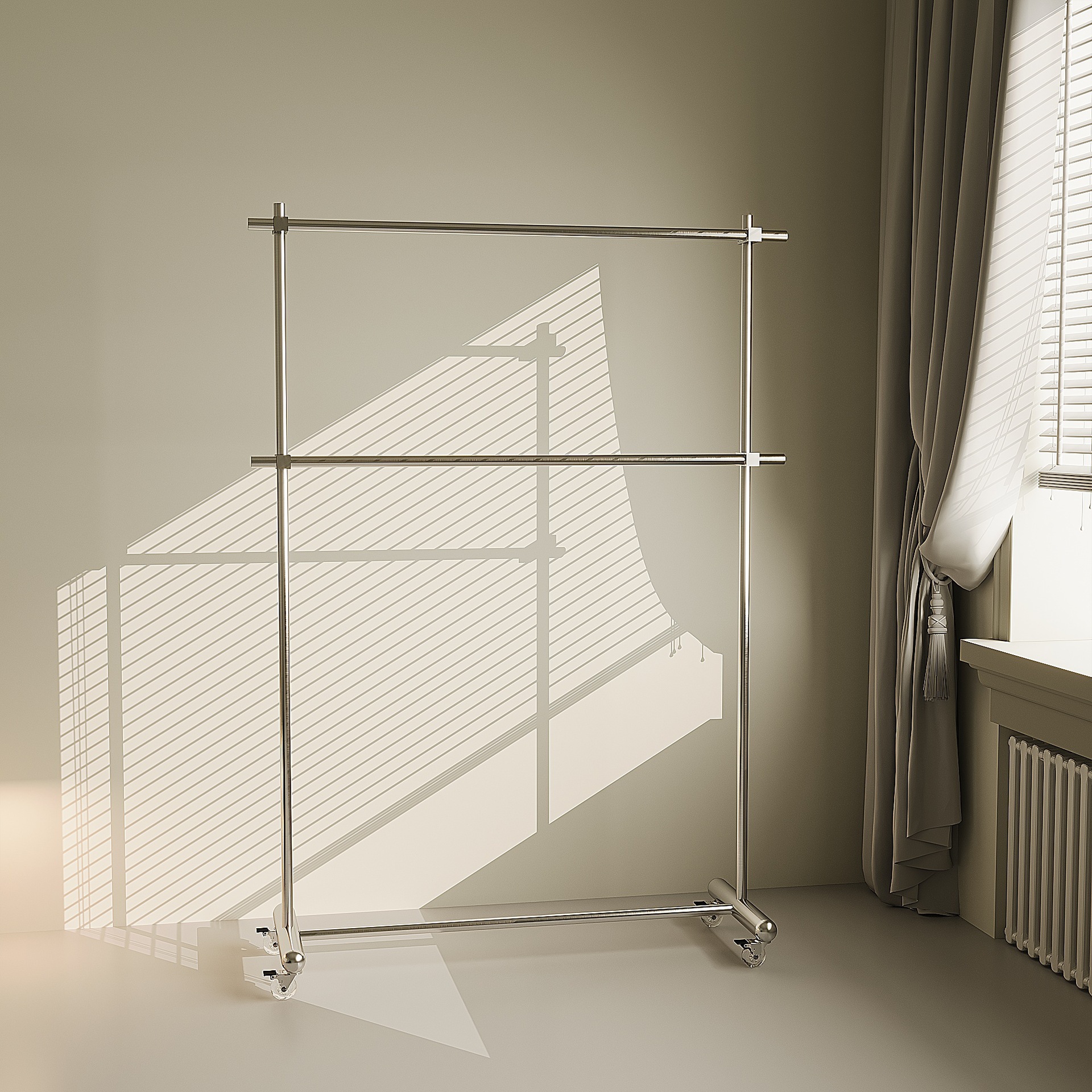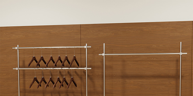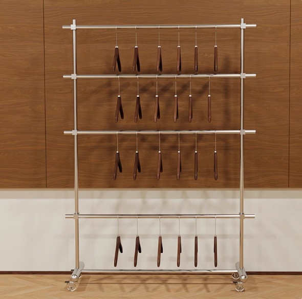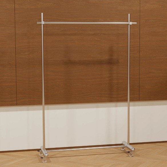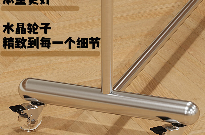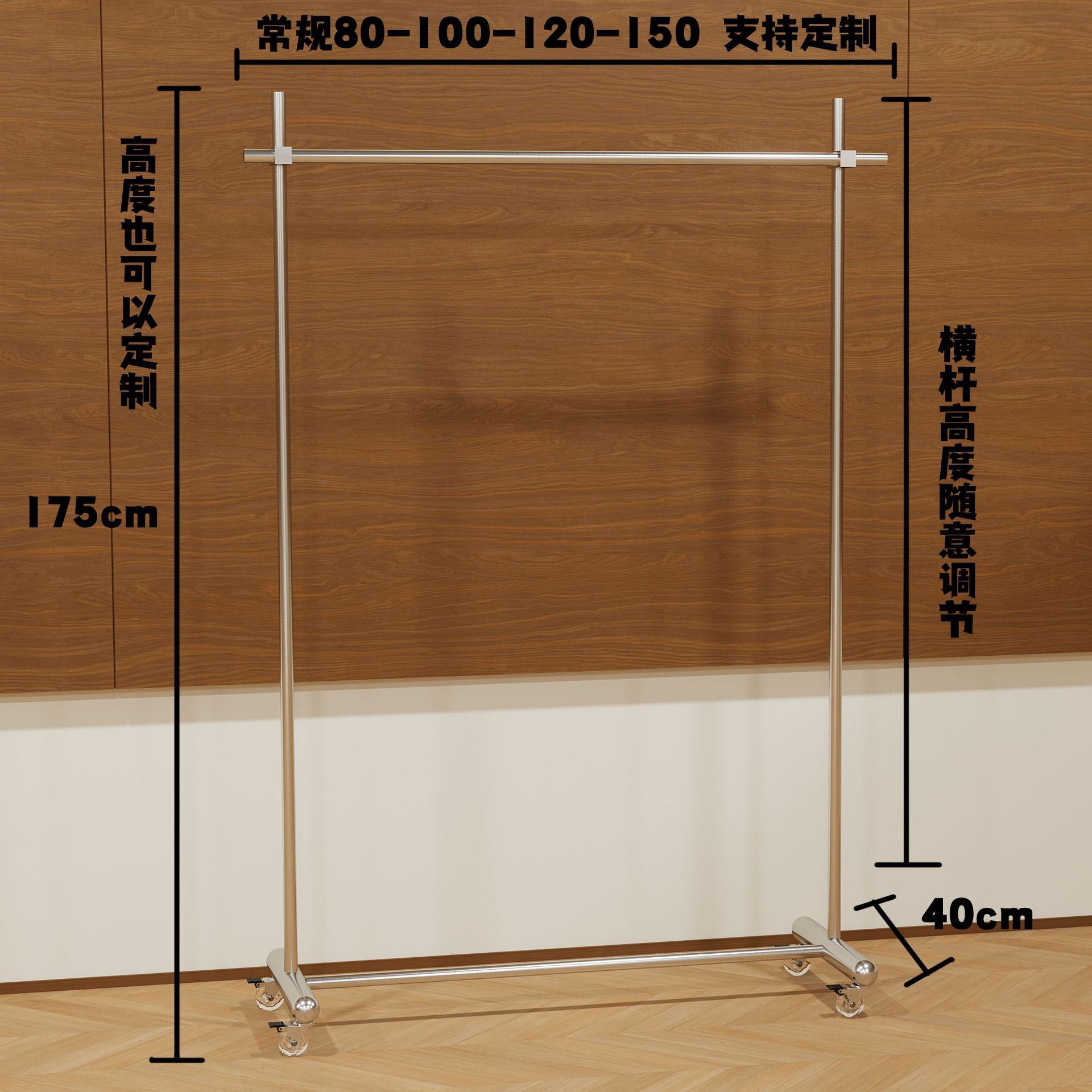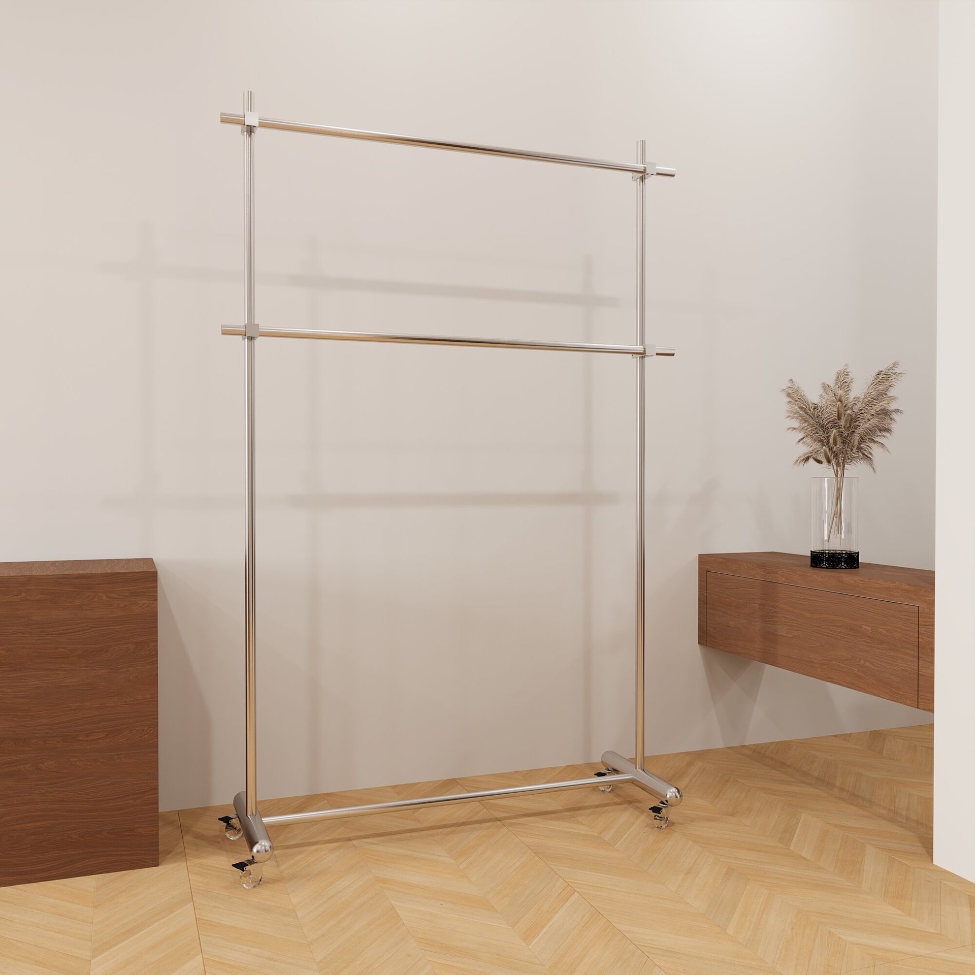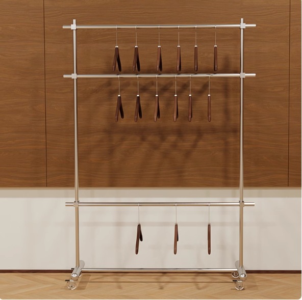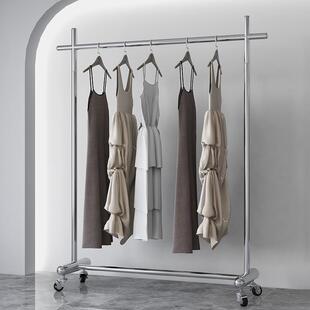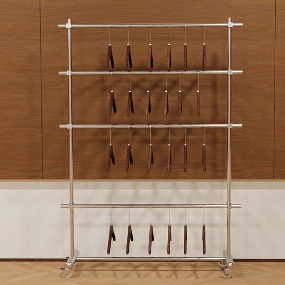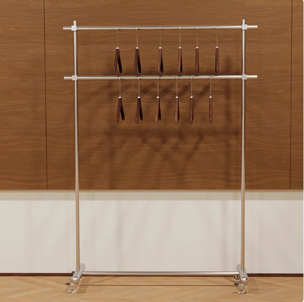 의류 매장 조절 가능한 디스플레이 랙 스테인레스 스틸 이중층 바닥 스탠딩 옷걸이 여성 의류 매장 바퀴가 달린 특수 이동식 선반