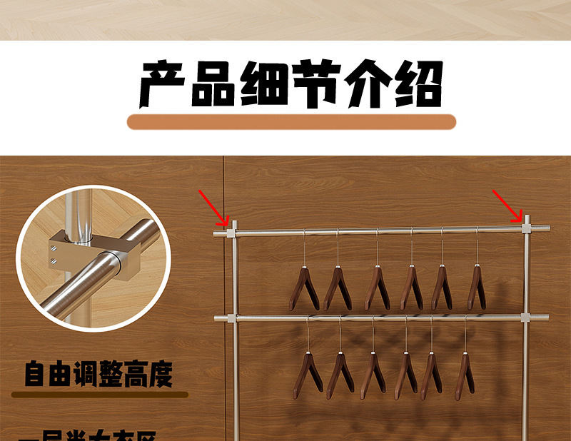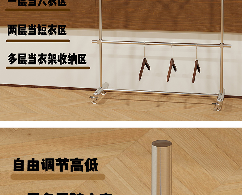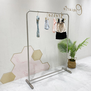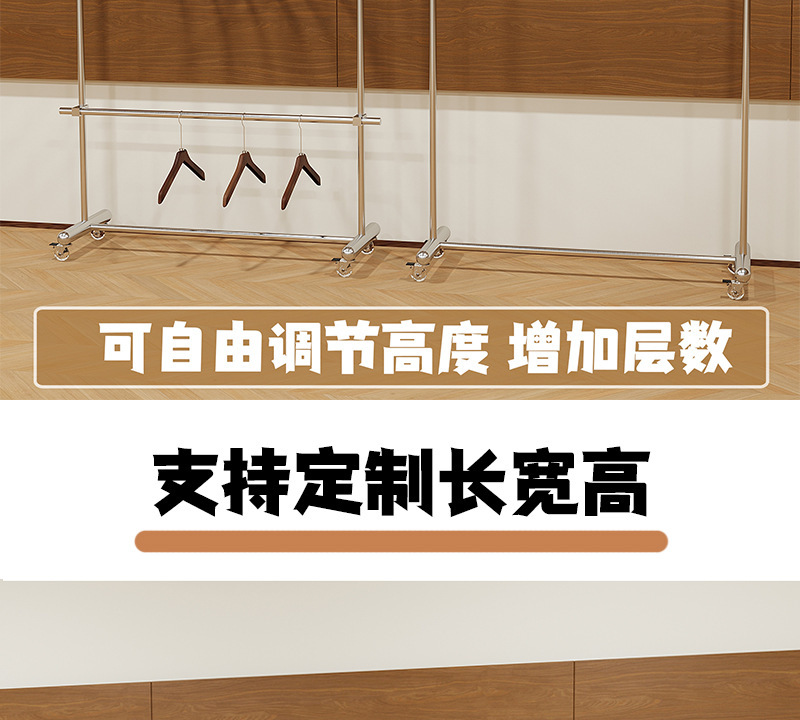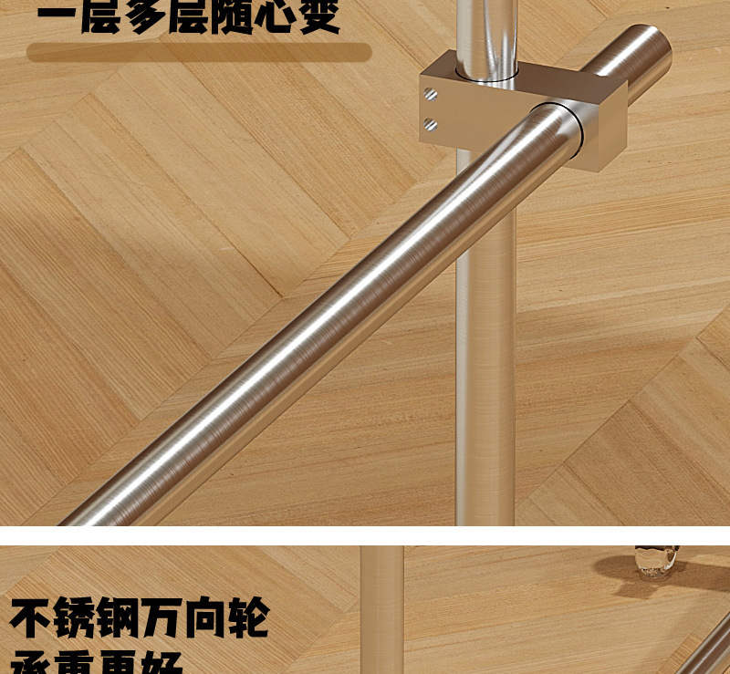 의류 매장 조절 가능한 디스플레이 랙 스테인레스 스틸 이중층 바닥 스탠딩 옷걸이 여성 의류 매장 바퀴가 달린 특수 이동식 선반스토어 가기