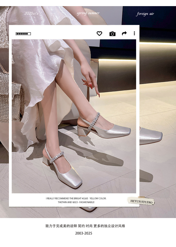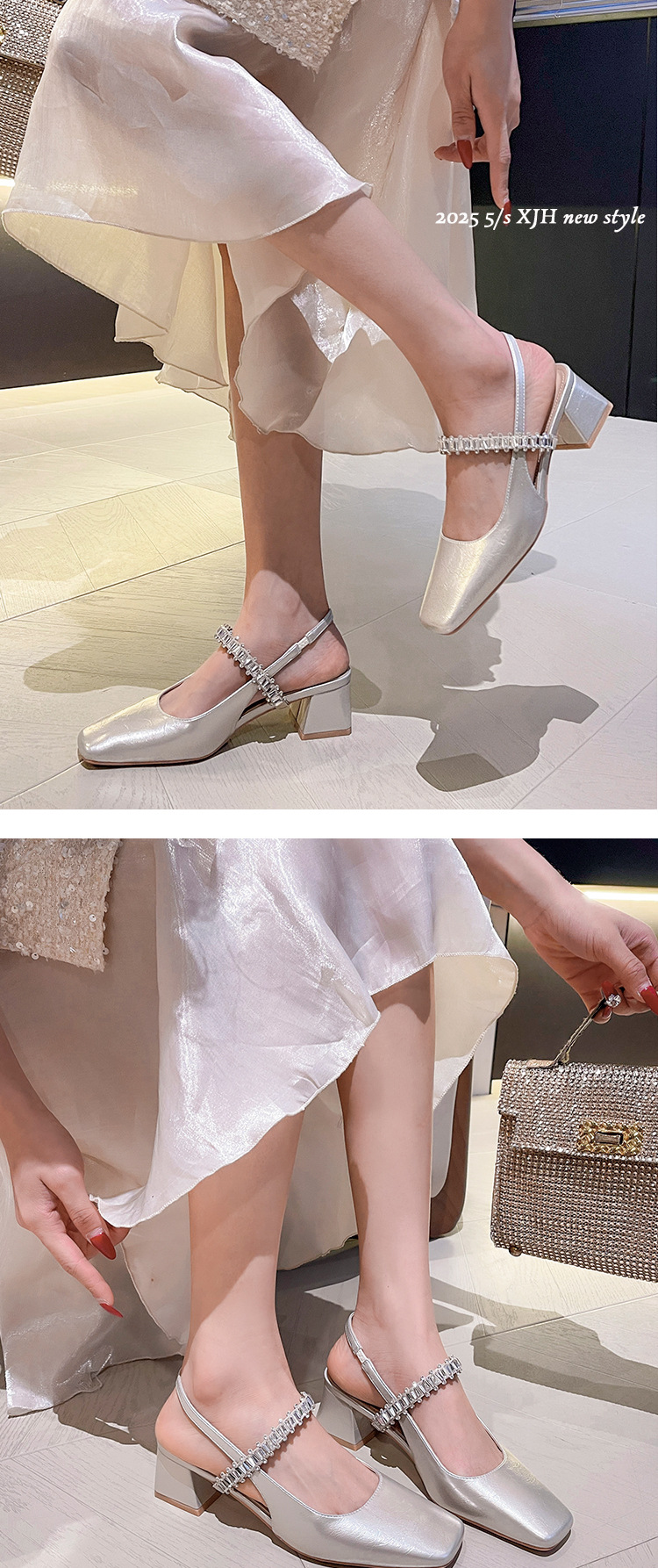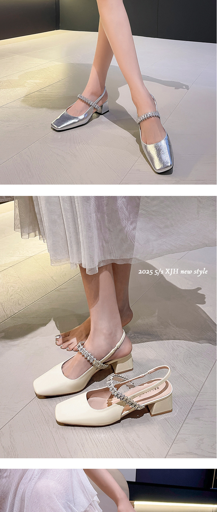 333-32 실버 라인스톤 체인 슬립온 샌들 여성용 스퀘어 토 양가죽 메리제인 슈즈 두꺼운 굽 싱글 슈즈