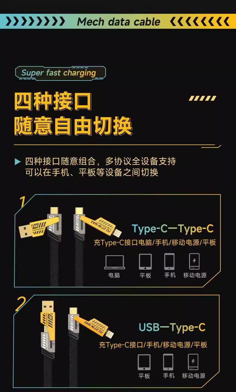 Huawei, Apple 및 Xiaomi에 적합한 메카 아연 합금 PD 4-in-1 고속 충전 케이블 범용 다중 헤드 길고 짧은 데이터 케이블
