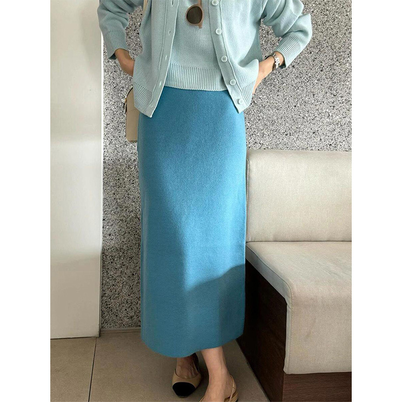 블루 니트 A-라인 스커트 여성의 가을과 겨울 새로운 우아한 높은 허리 슬리밍 중간 길이 스트레이트 엉덩이 원스텝 스커트