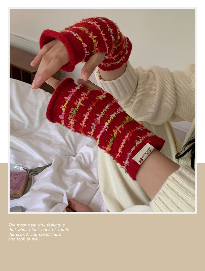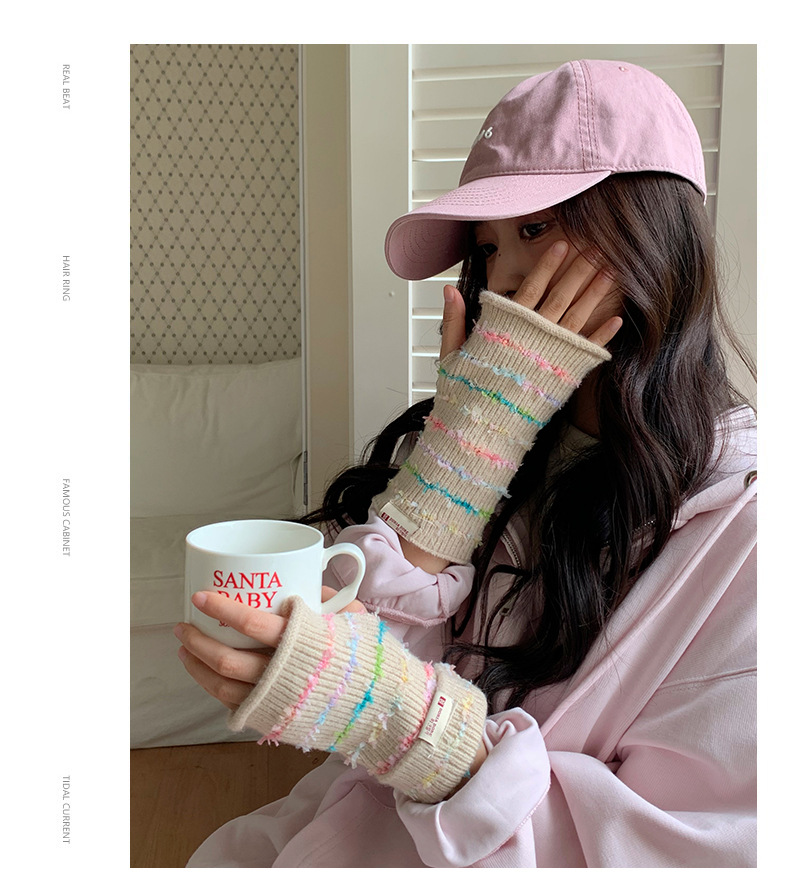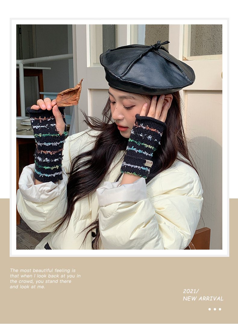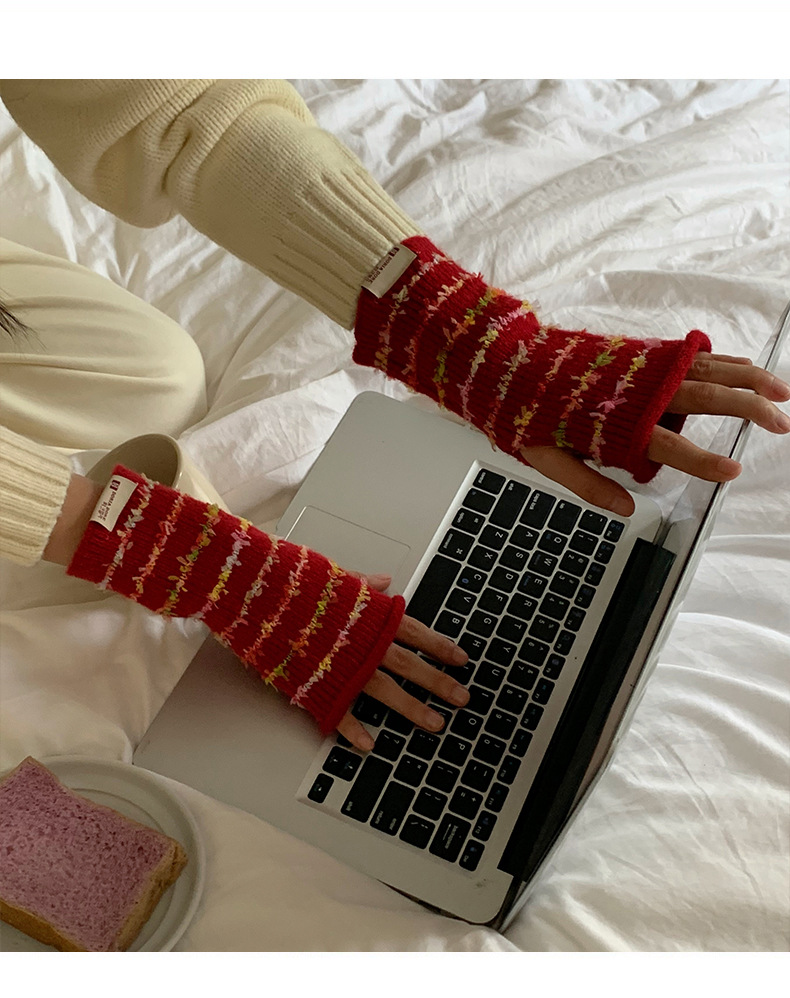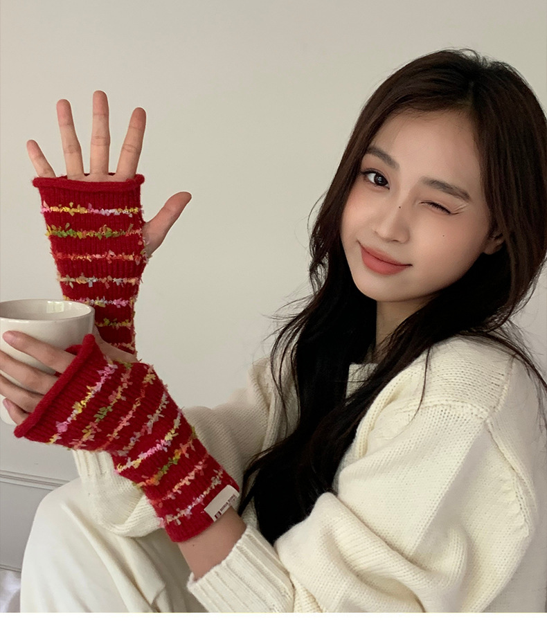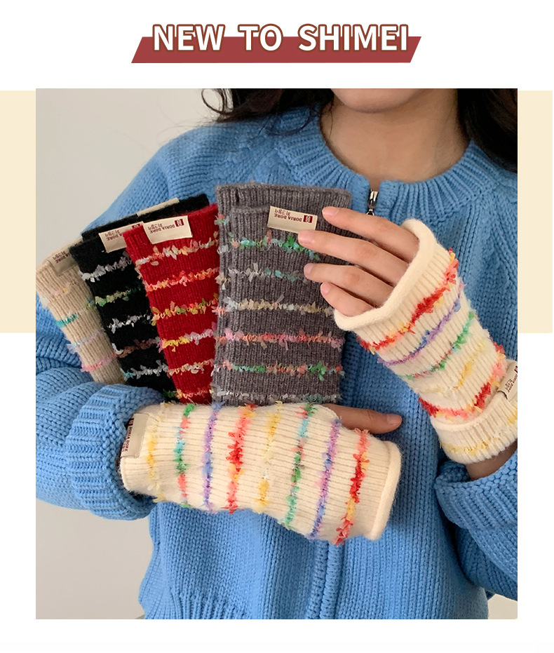 양모 장갑 여성의 2024 새로운 달콤한 레인보우 귀여운 니트 두꺼운 엑스트라 핑거 터치 스크린 반 손가락 스트라이프 슬리브