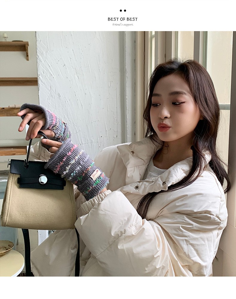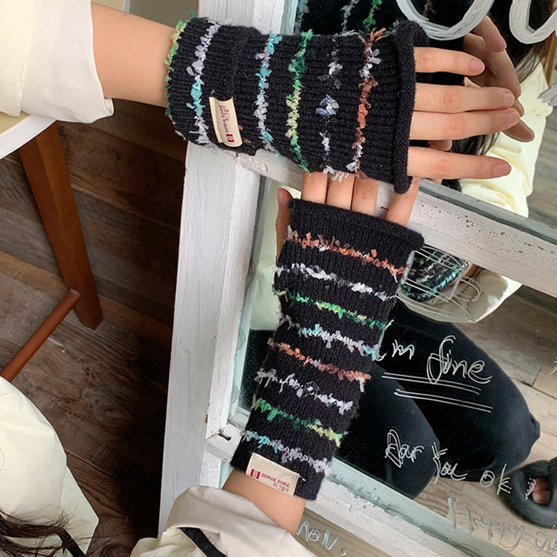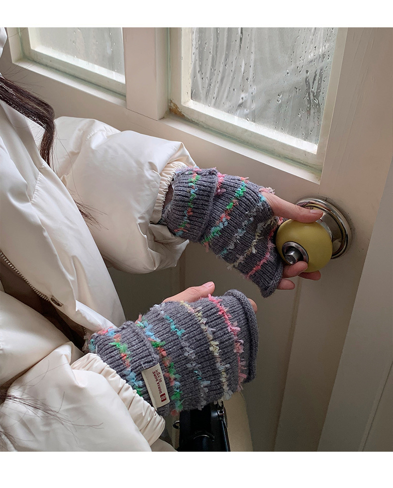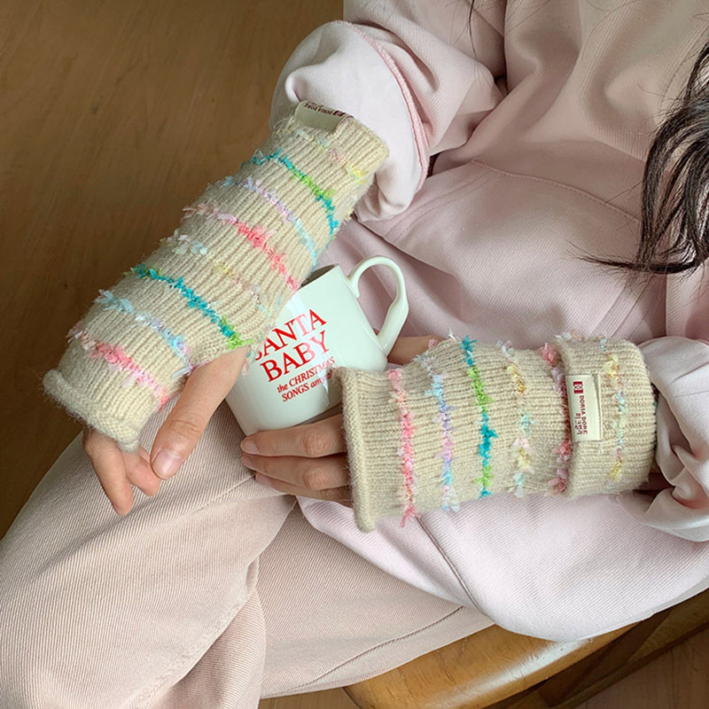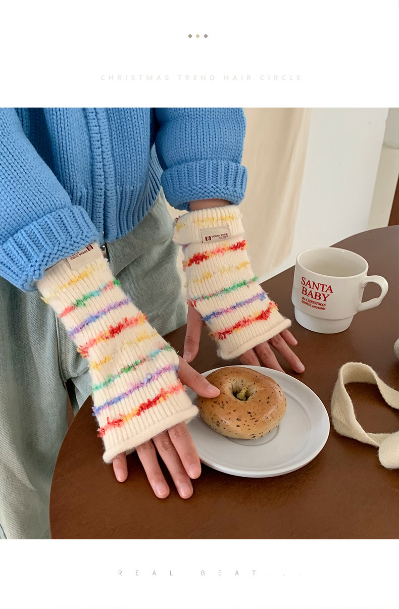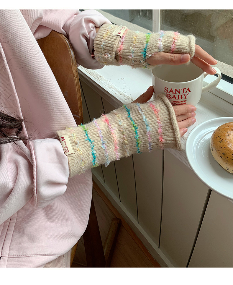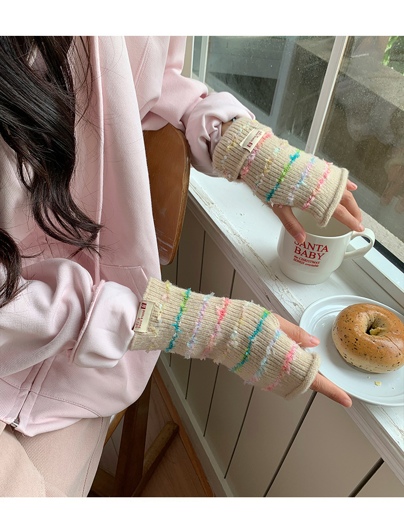 양모 장갑 여성의 2024 새로운 달콤한 레인보우 귀여운 니트 두꺼운 엑스트라 핑거 터치 스크린 반 손가락 스트라이프 슬리브스토어 가기