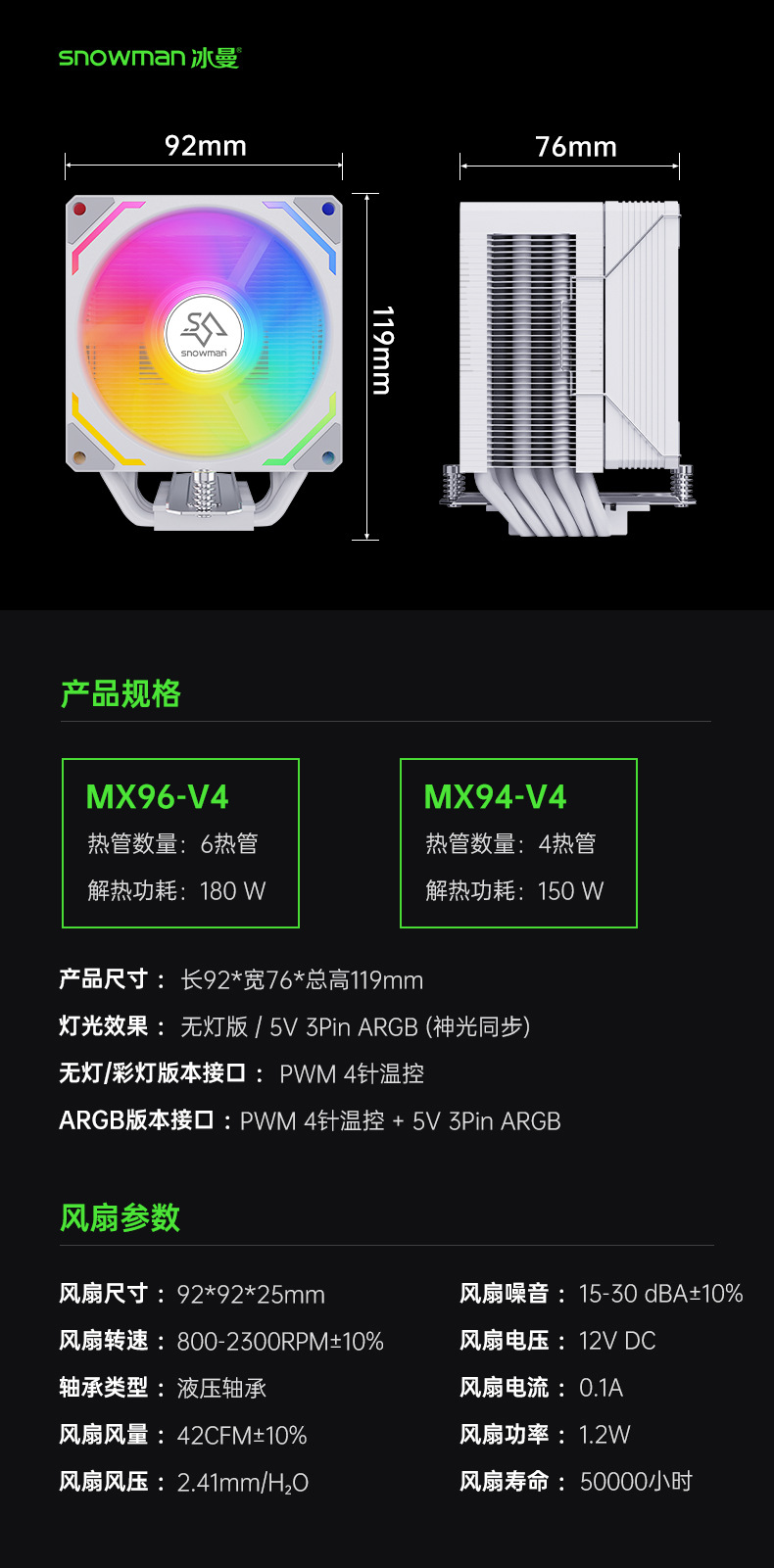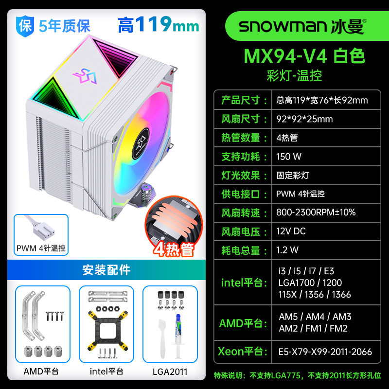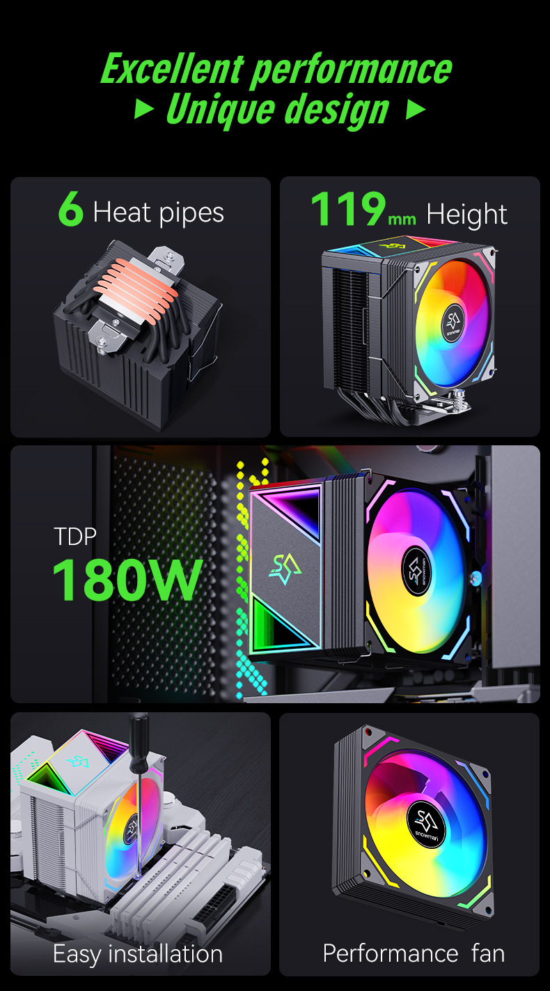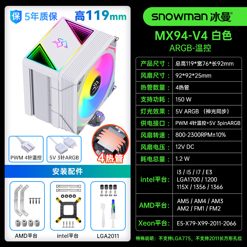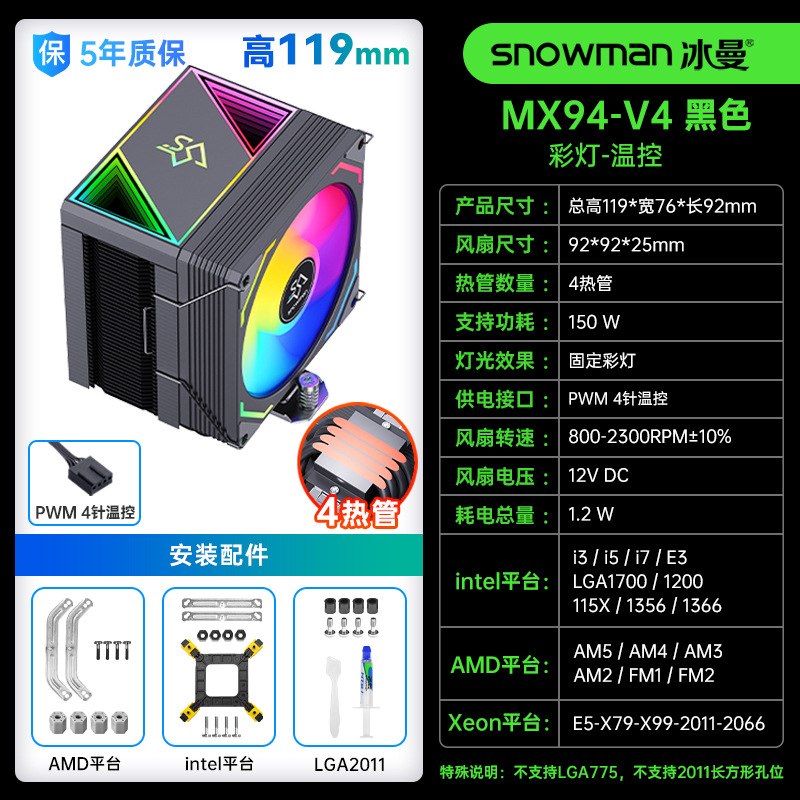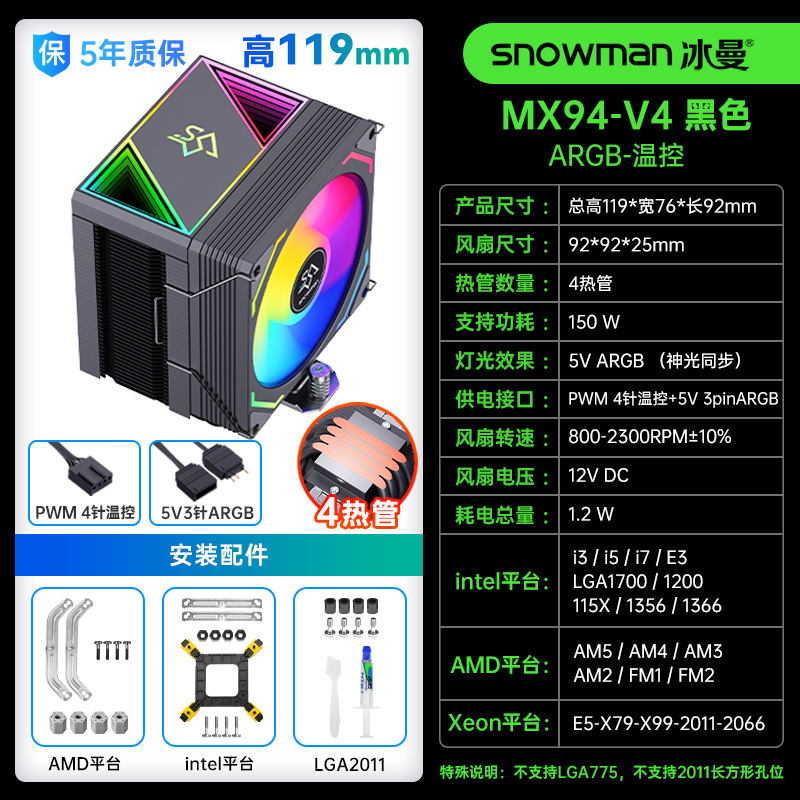 SNOWMAN MX96 무음 CPU 쿨러 단일 타워 6 히트 파이프 ARGB 팬 공냉식 컴퓨터 X99 AM4