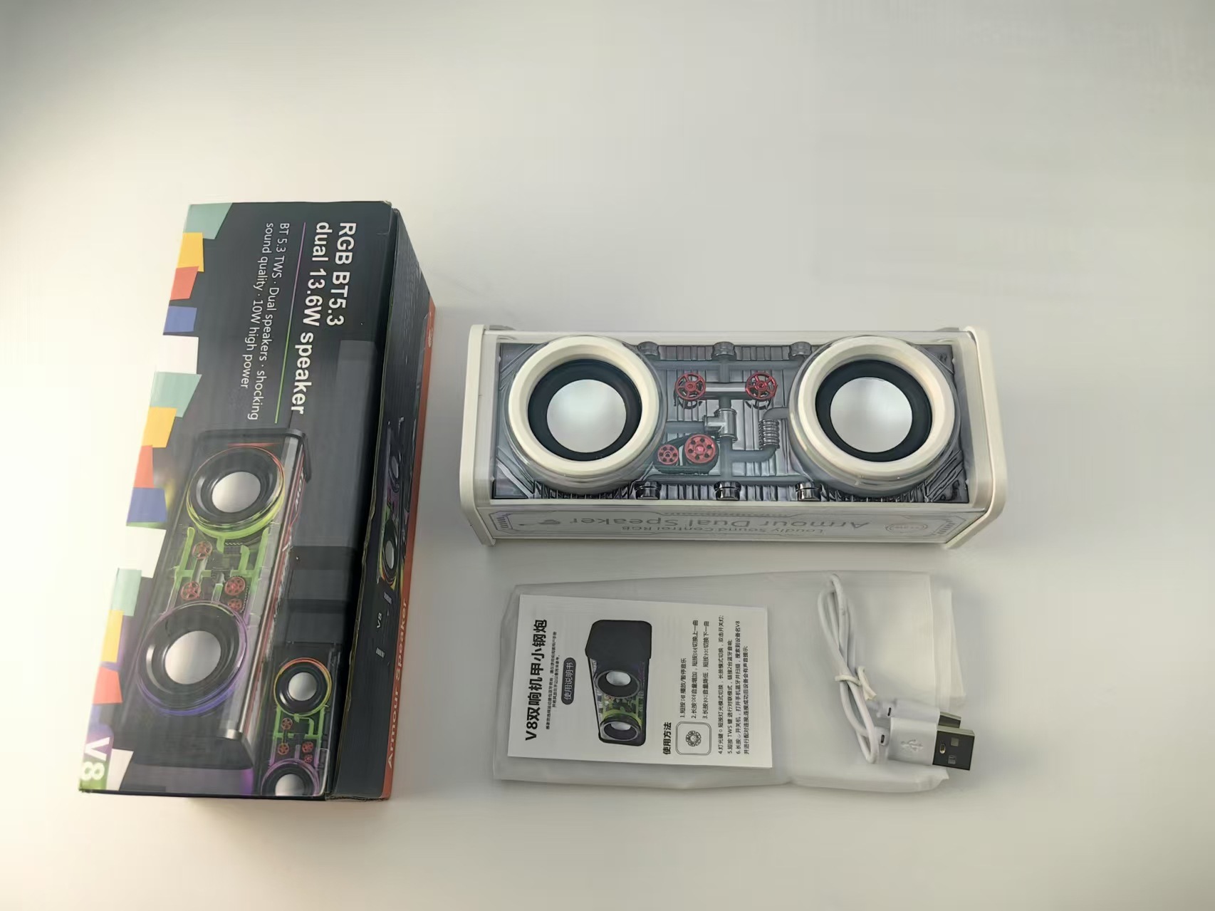 V8 블루투스 스피커 듀얼 스피커 투명 메카 소형 강철 총 다채로운 고출력 서브 우퍼 크리 에이 티브 데스크탑 소형 스피커