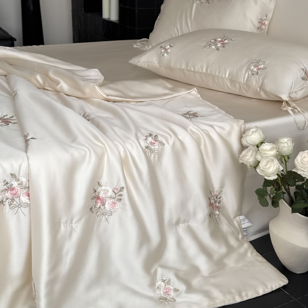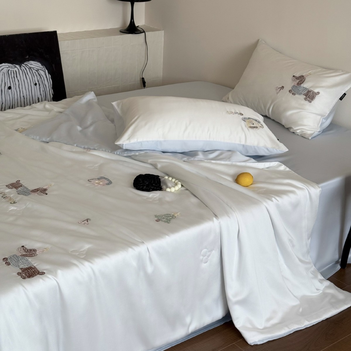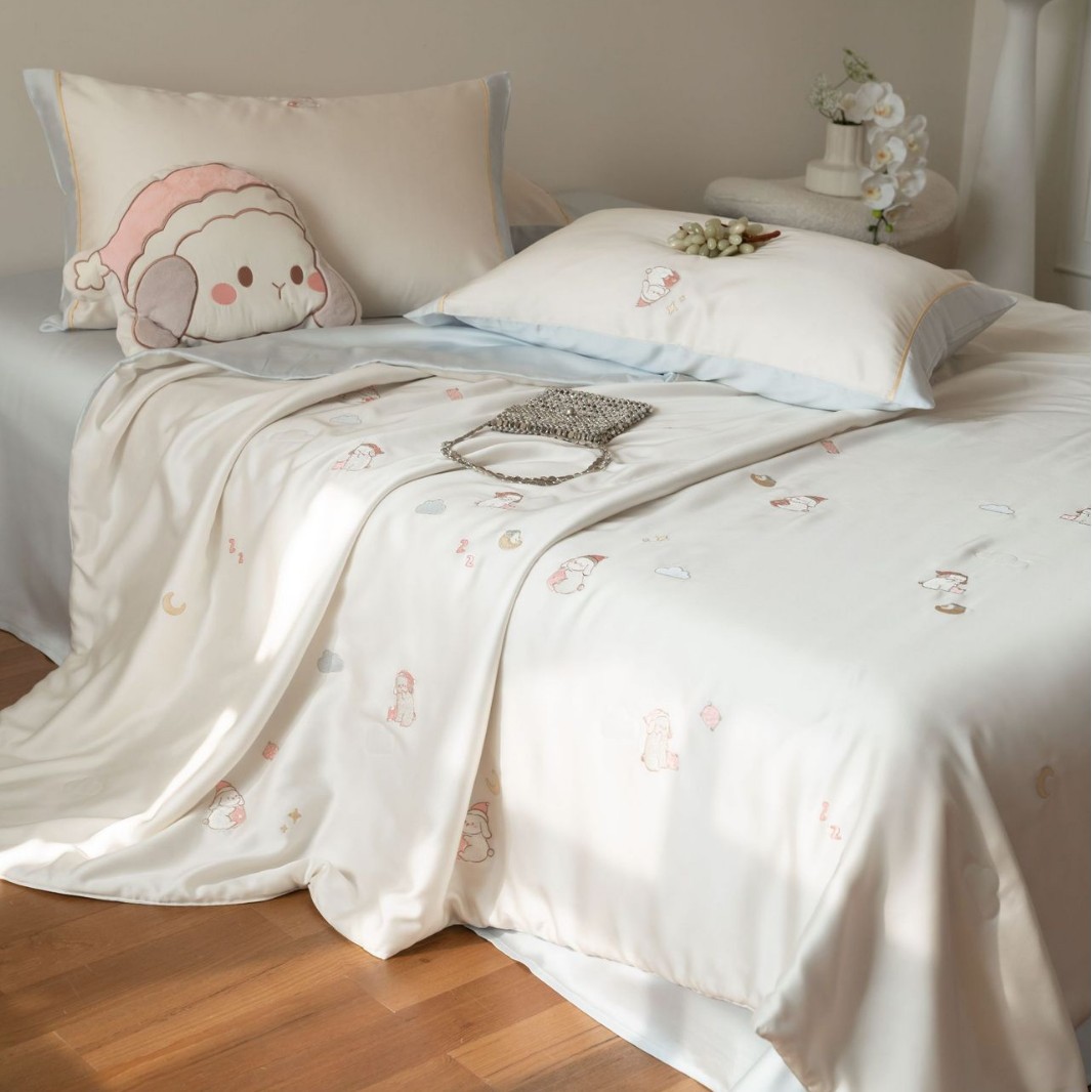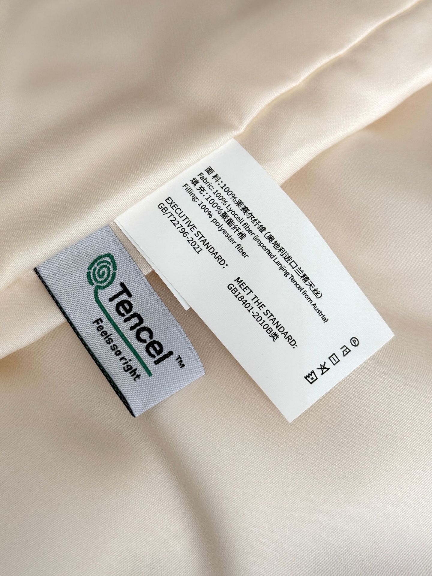 采用 60S 兰精天丝,以天然木浆为原料,经特殊工艺制成,面料如牛奶般丝滑,贴肤瞬间,凉意驱散燥热,让你每夜在丝滑中安睡,同时,天丝纤维有良好吸湿性,能迅速吸收并散发汗液,保持睡眠干爽,告别闷热黏腻
