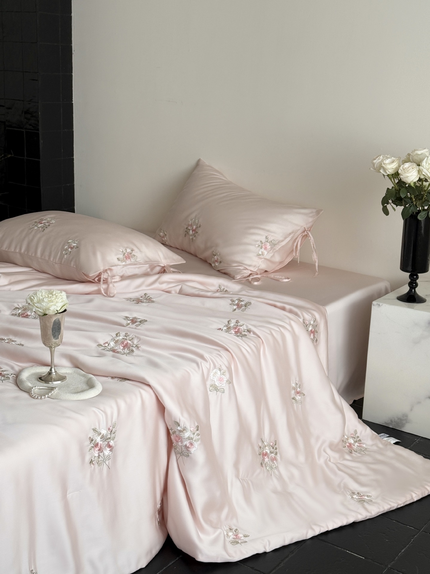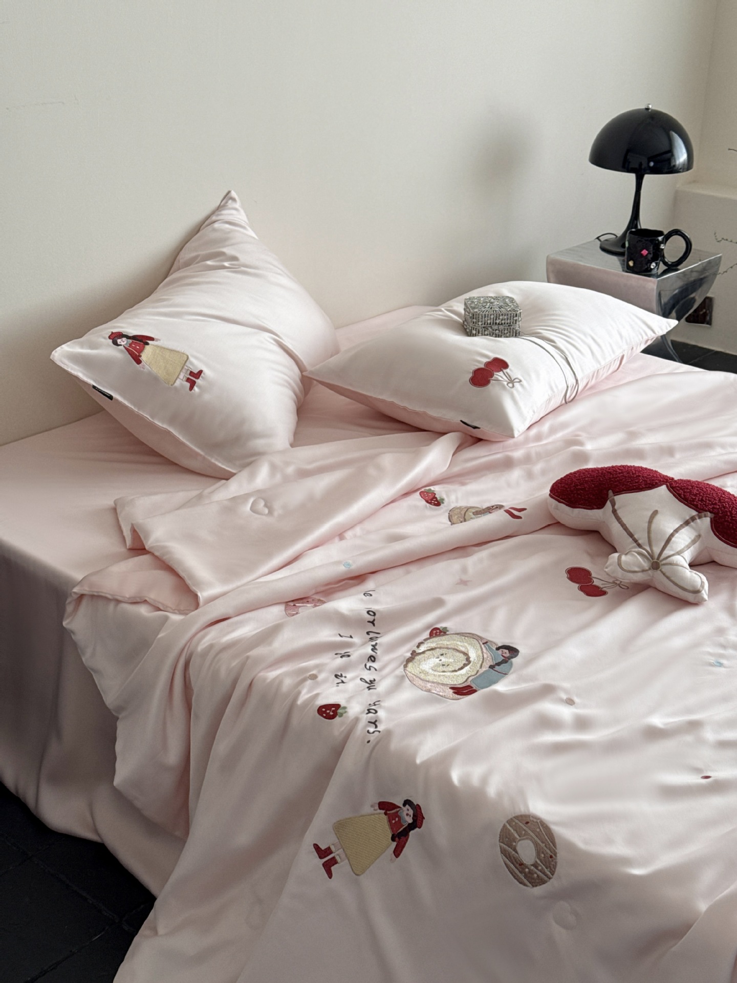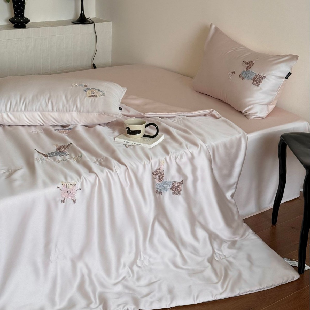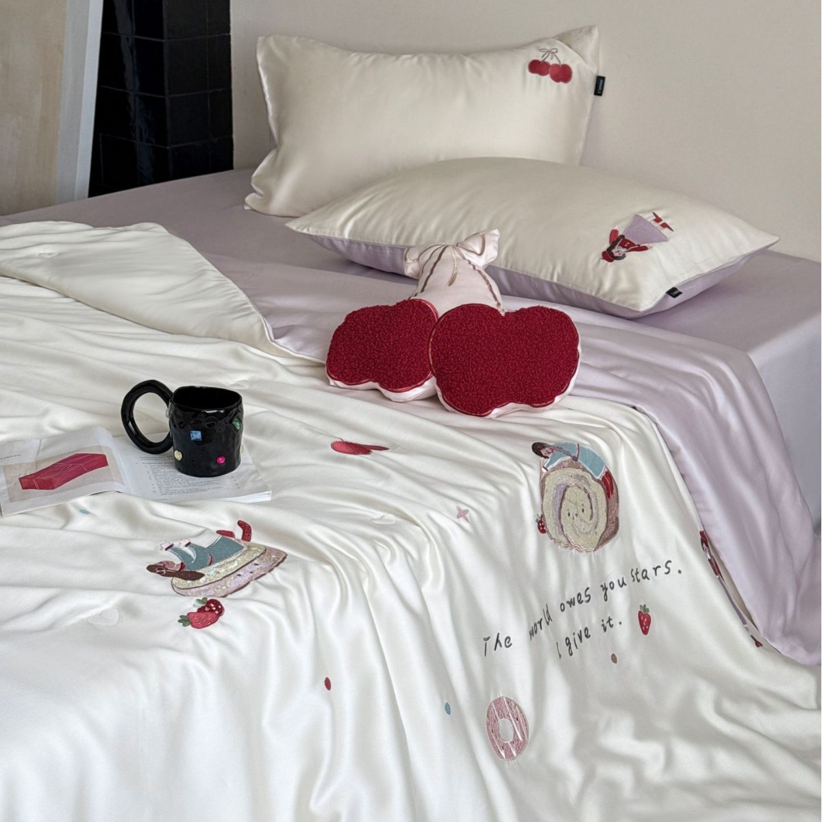 采用 60S 兰精天丝,以天然木浆为原料,经特殊工艺制成,面料如牛奶般丝滑,贴肤瞬间,凉意驱散燥热,让你每夜在丝滑中安睡,同时,天丝纤维有良好吸湿性,能迅速吸收并散发汗液,保持睡眠干爽,告别闷热黏腻