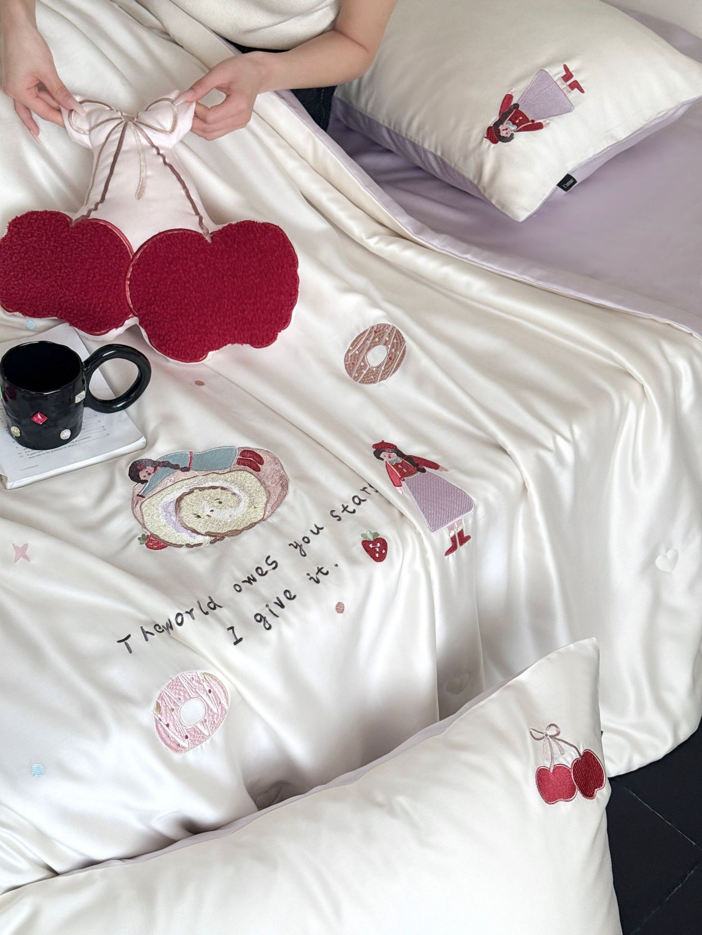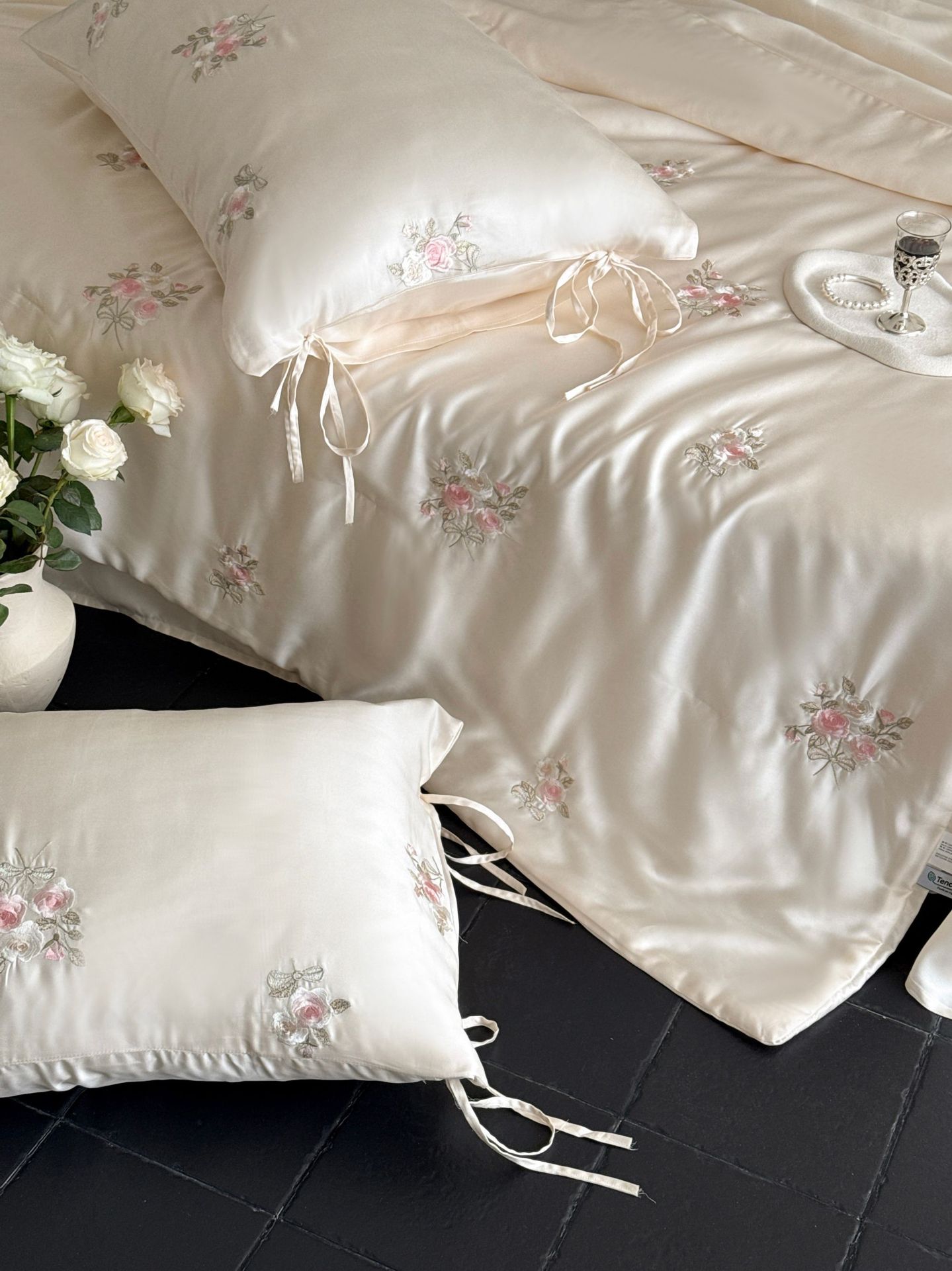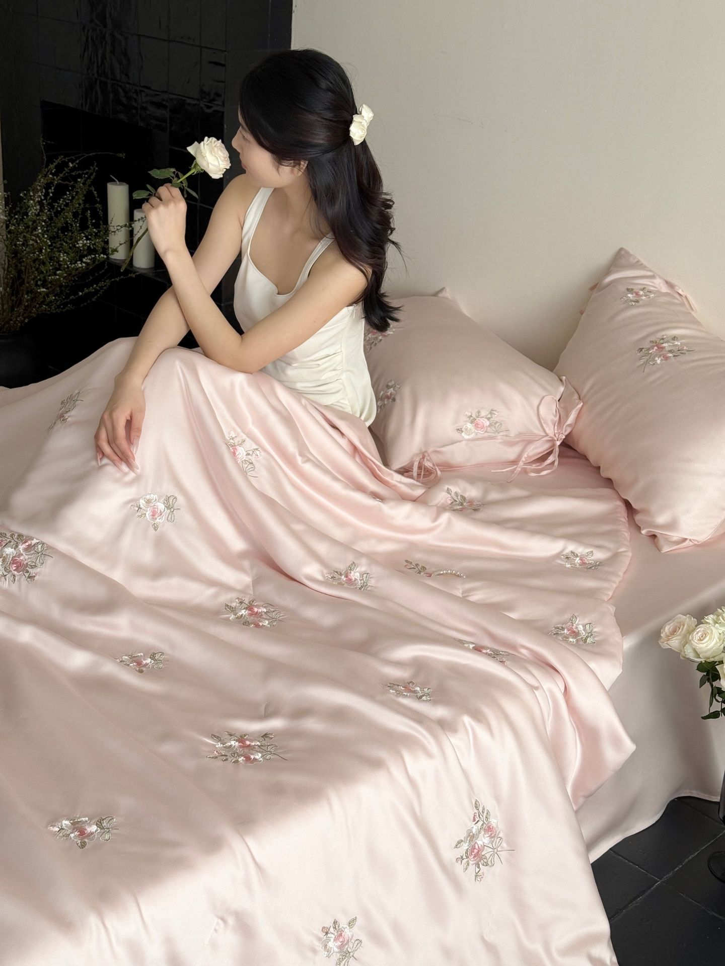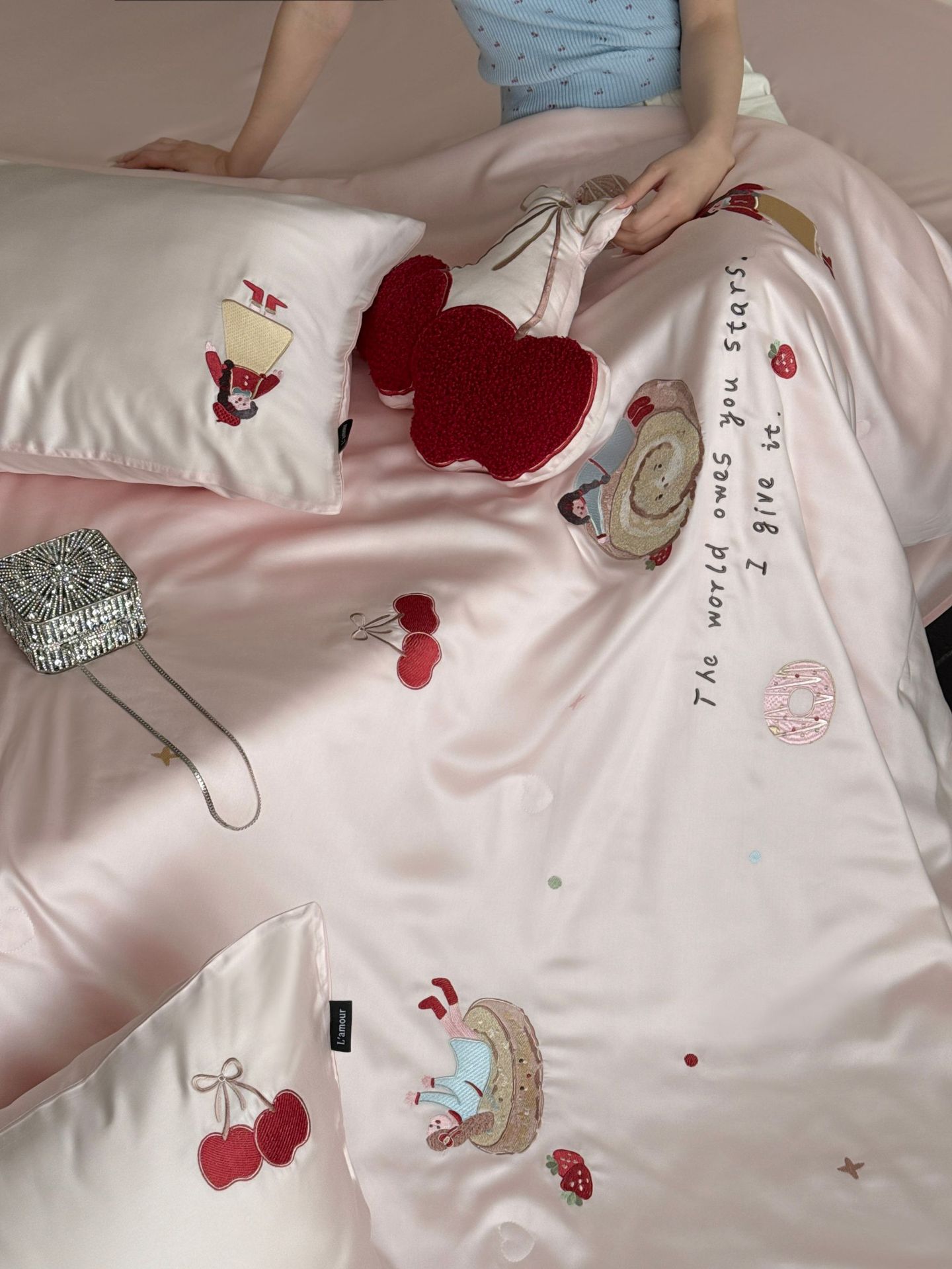 采用 60S 兰精天丝,以天然木浆为原料,经特殊工艺制成,面料如牛奶般丝滑,贴肤瞬间,凉意驱散燥热,让你每夜在丝滑中安睡,同时,天丝纤维有良好吸湿性,能迅速吸收并散发汗液,保持睡眠干爽,告别闷热黏腻