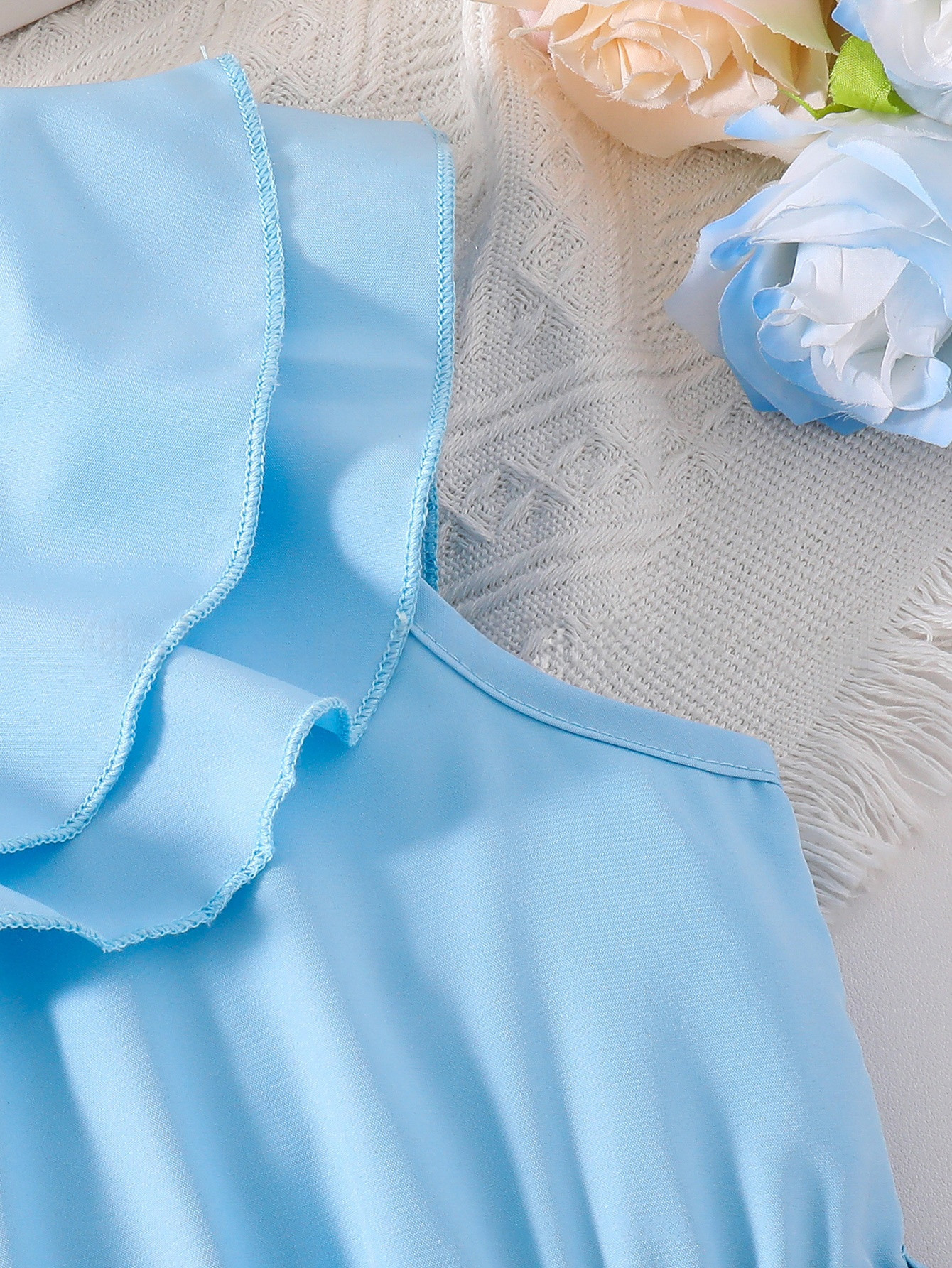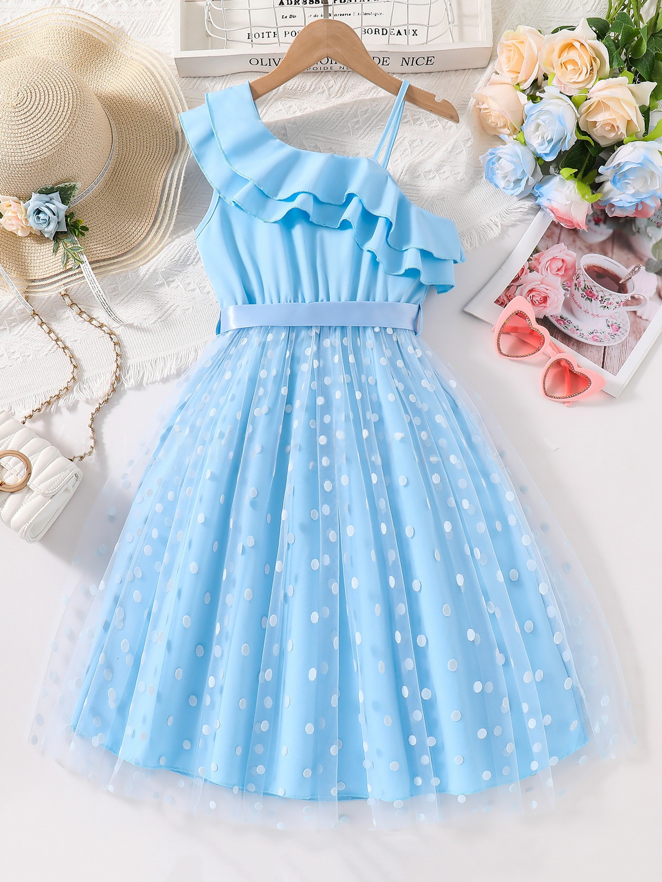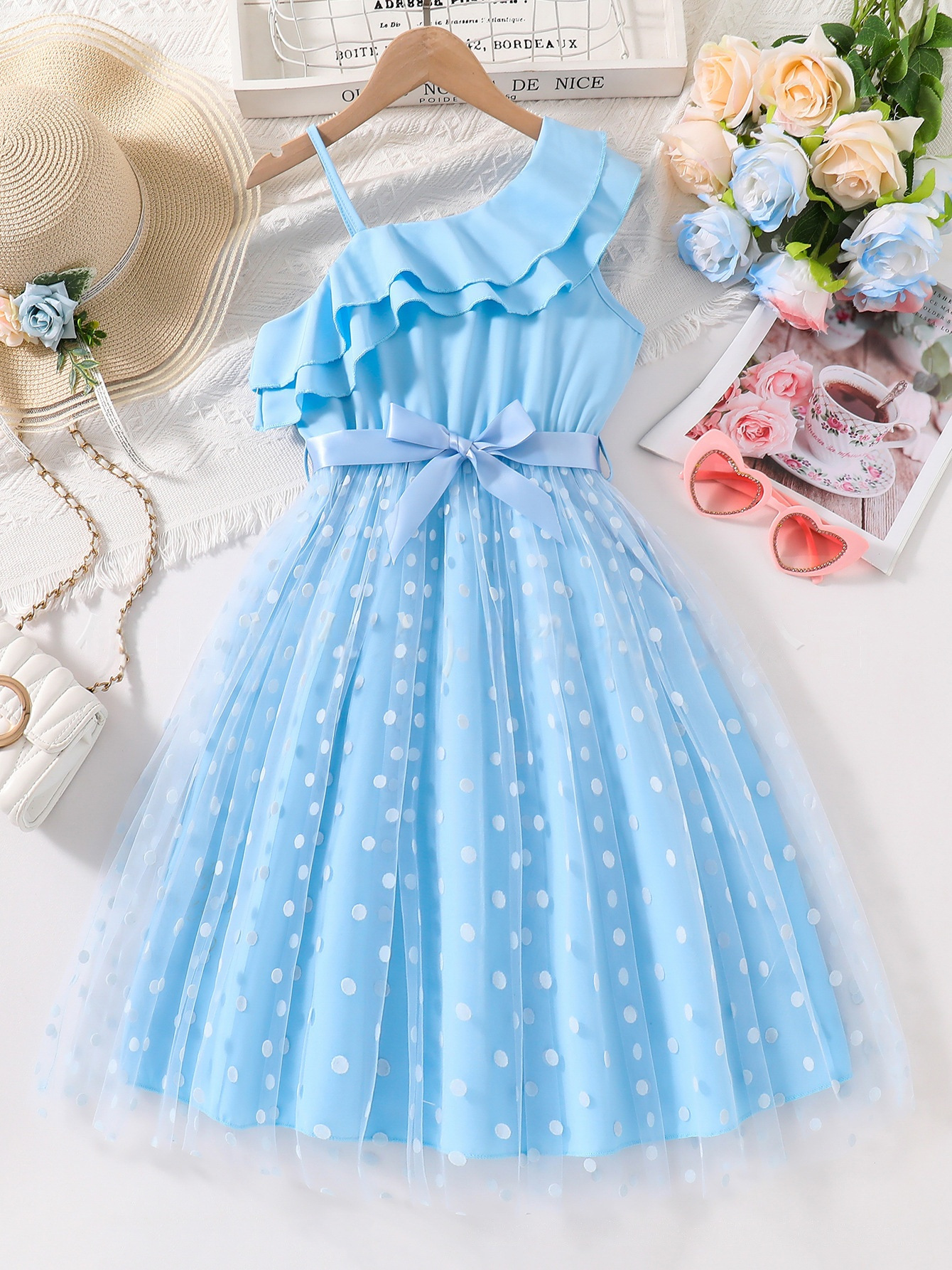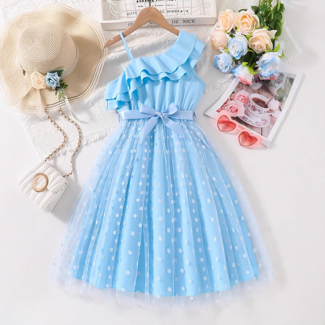 알리익스프레스 해외 공급업체 여름 신상품 달콤하고 여성스러운 여아 원피스, 단색 리본 벨트, 물방울 무늬 롱 드레스