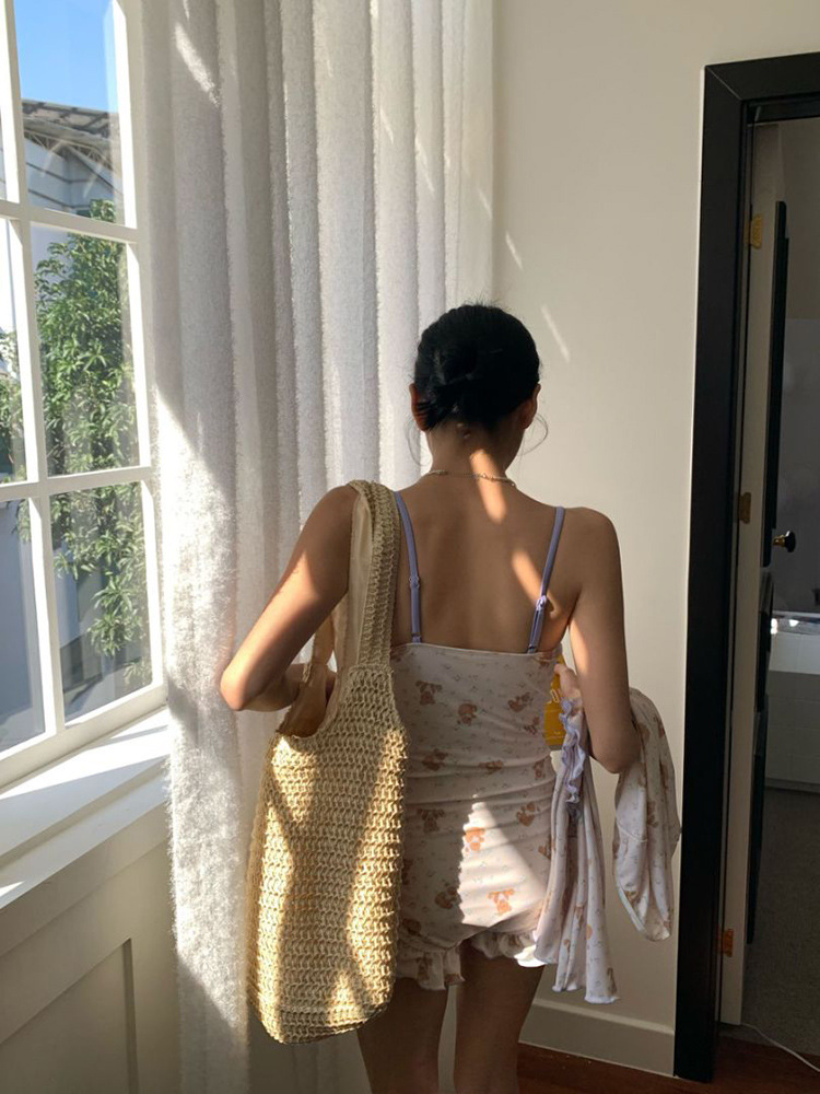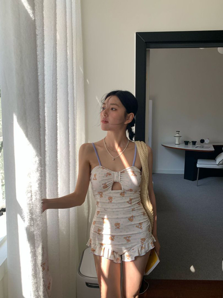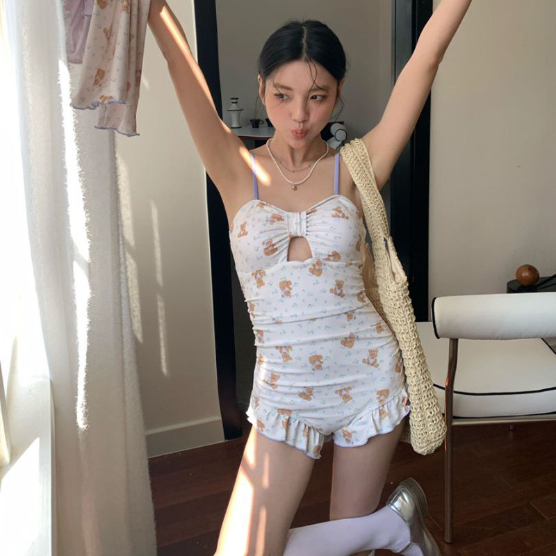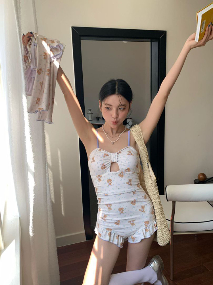 만화 프린트 소녀의 달콤하고 귀여운 원피스 수영복 속이 빈 작은 가슴 푸시 업 수영복 휴가 해변 온천 수영복스토어 가기