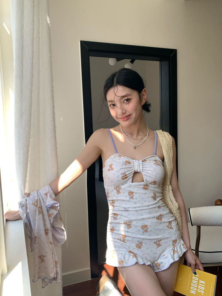 만화 프린트 소녀의 달콤하고 귀여운 원피스 수영복 속이 빈 작은 가슴 푸시 업 수영복 휴가 해변 온천 수영복
