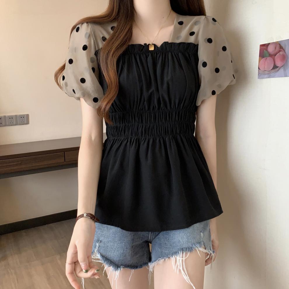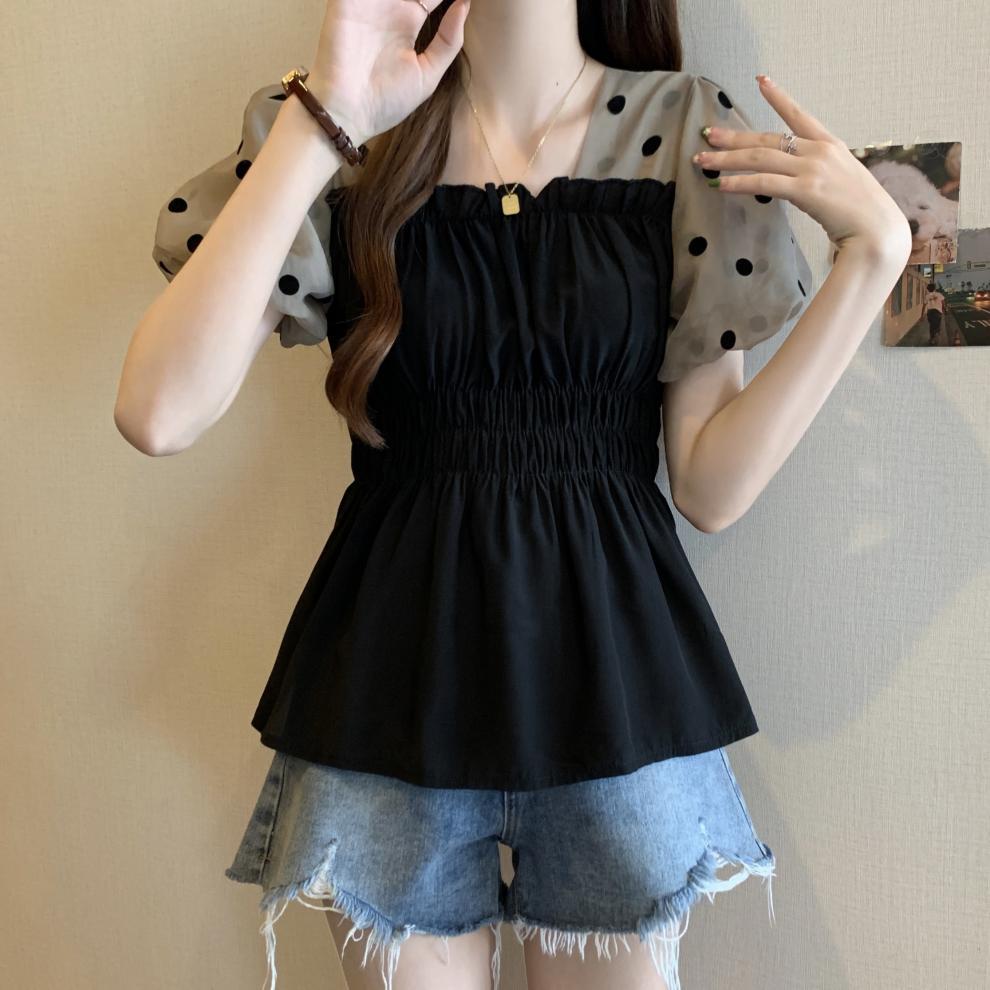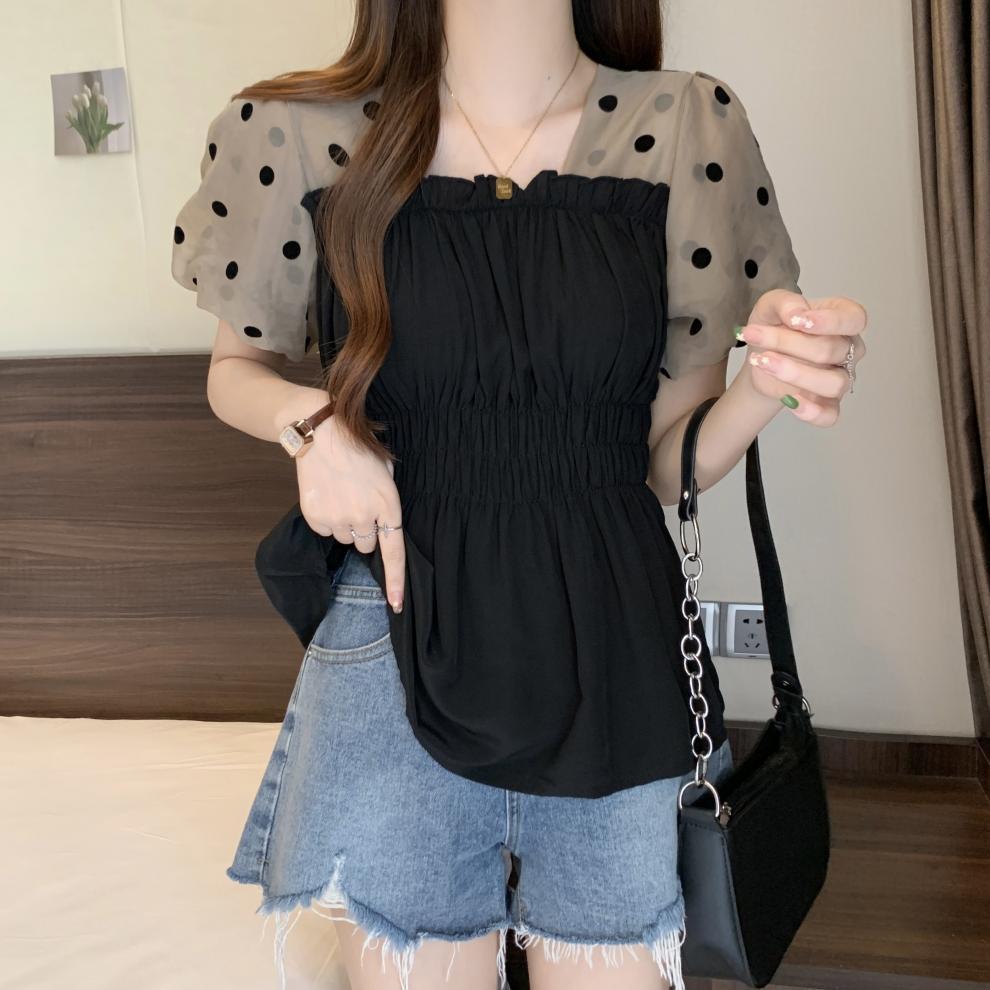 Fat MM 플러스 사이즈 여성용 퍼프 슬리브 쉬폰 셔츠 반팔 2025 여성용 새 스퀘어 넥 슬리밍 탑스토어 가기