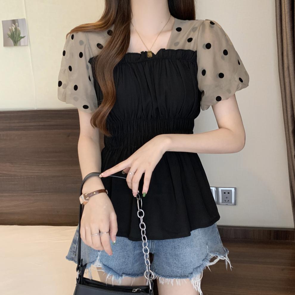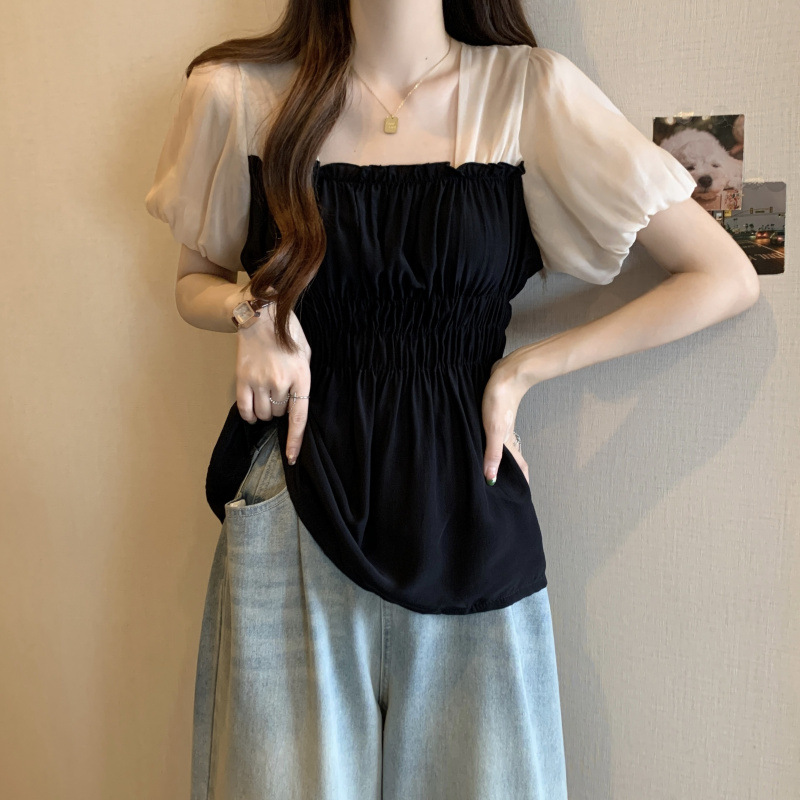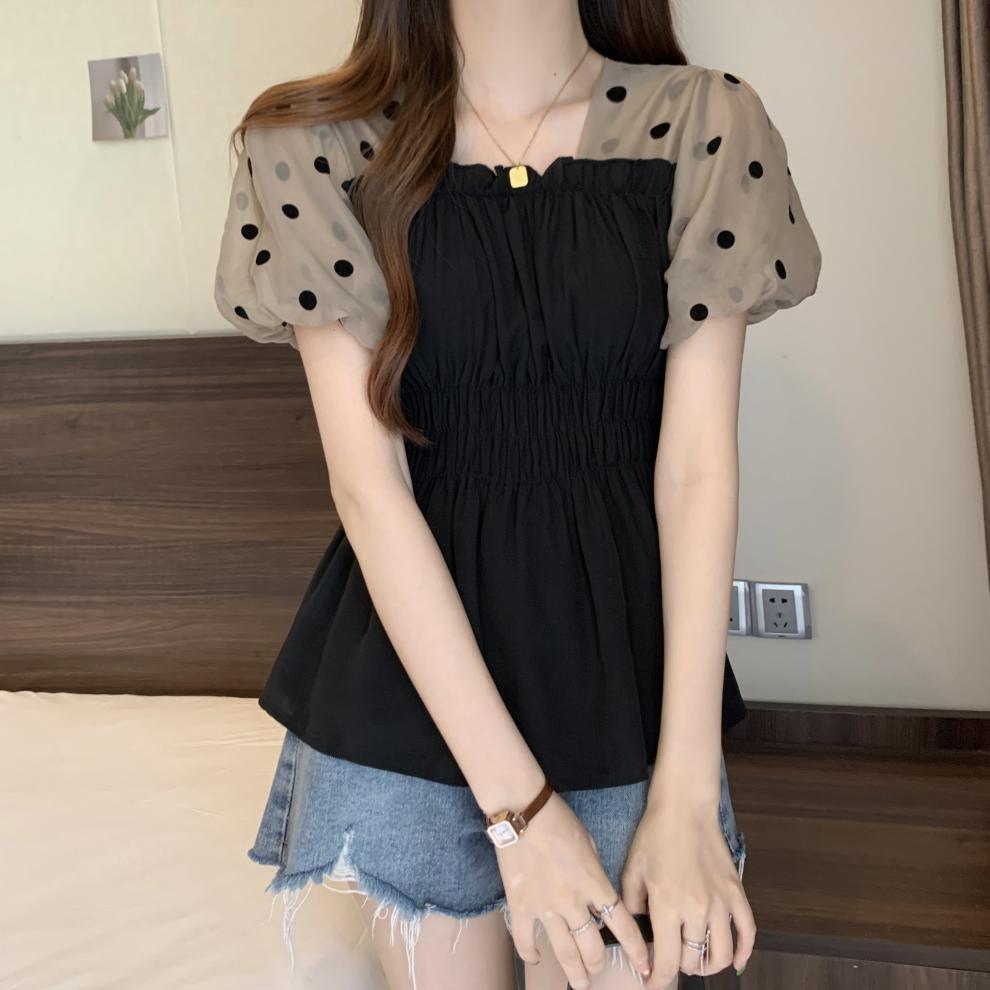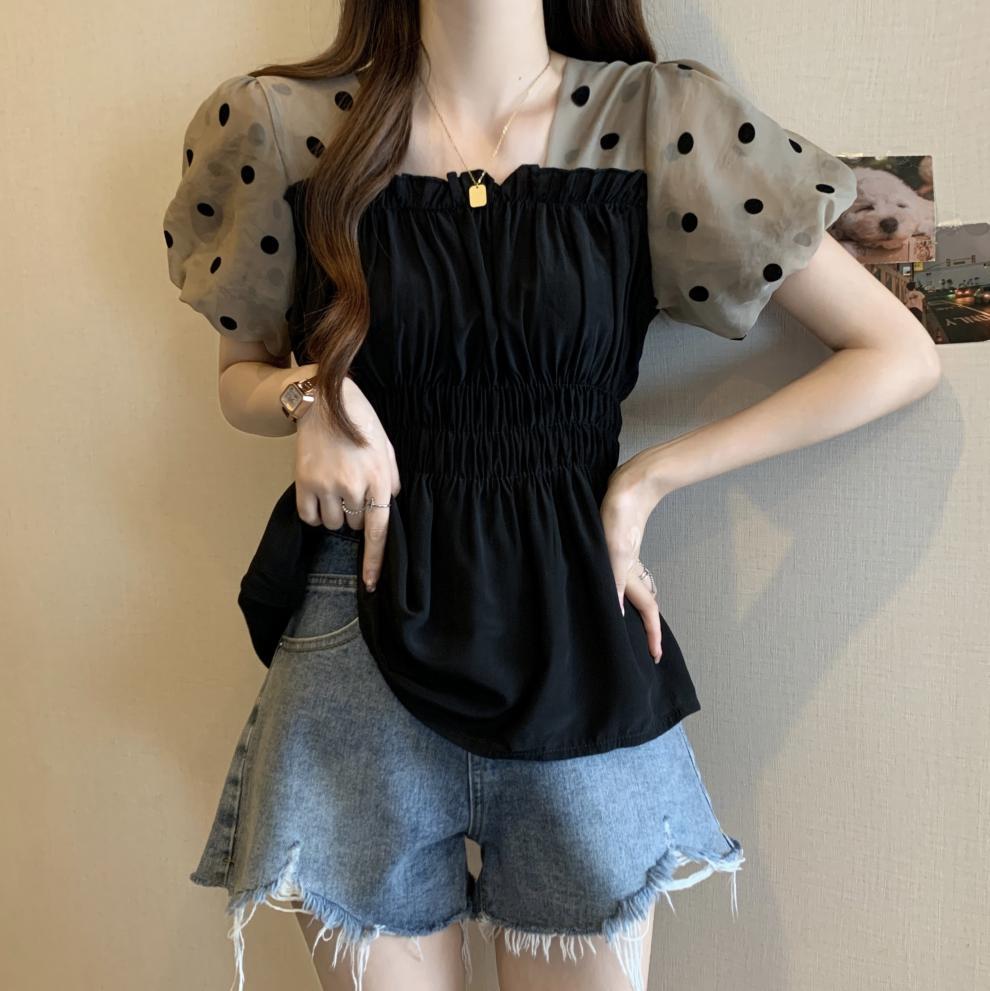 Fat MM 플러스 사이즈 여성용 퍼프 슬리브 쉬폰 셔츠 반팔 2025 여성용 새 스퀘어 넥 슬리밍 탑스토어 가기
