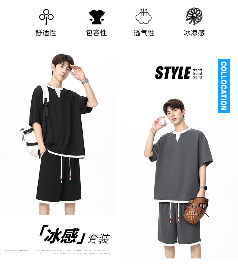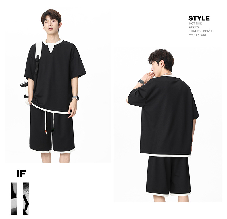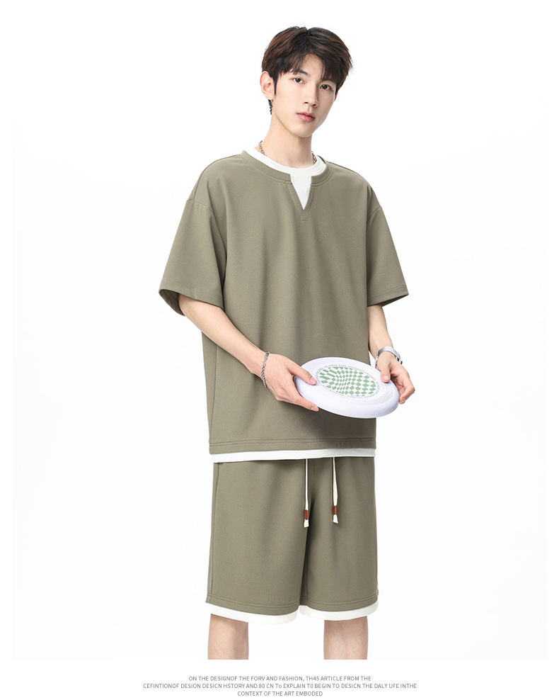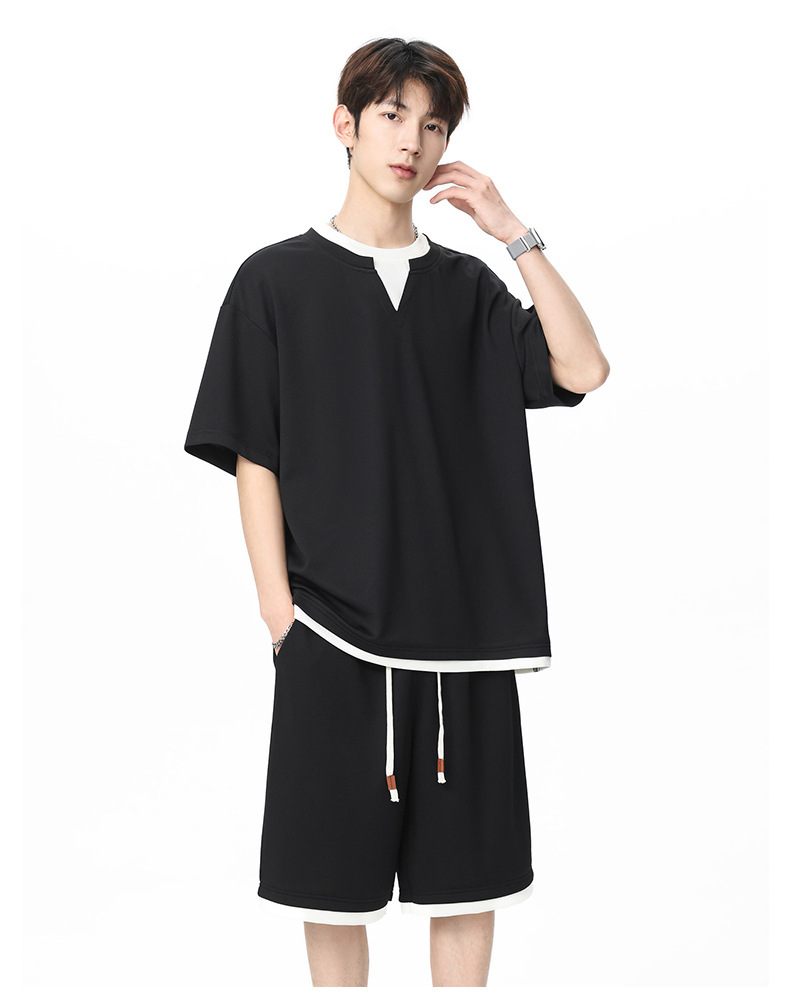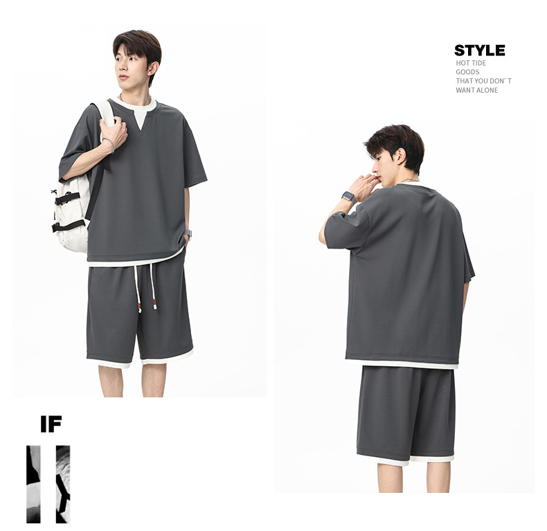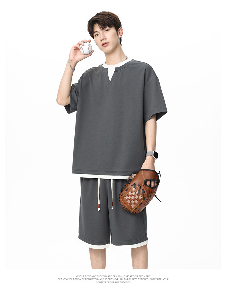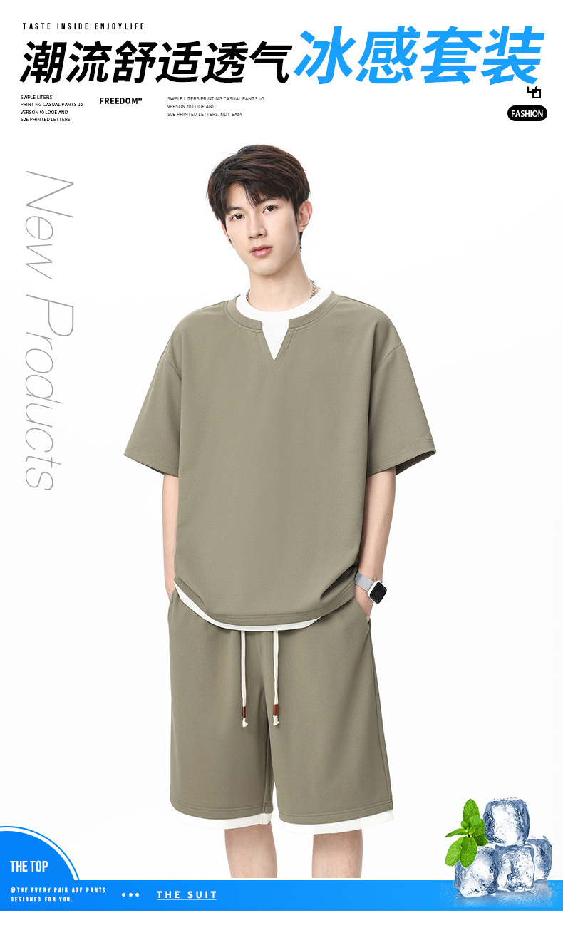아메리칸 스타일 페이크 투피스 슈트 남성용 브이넥 티셔츠 남성용 여름 얼음 느낌 통기성 트렌디 브랜드 아웃도어 스포츠 루즈 세트