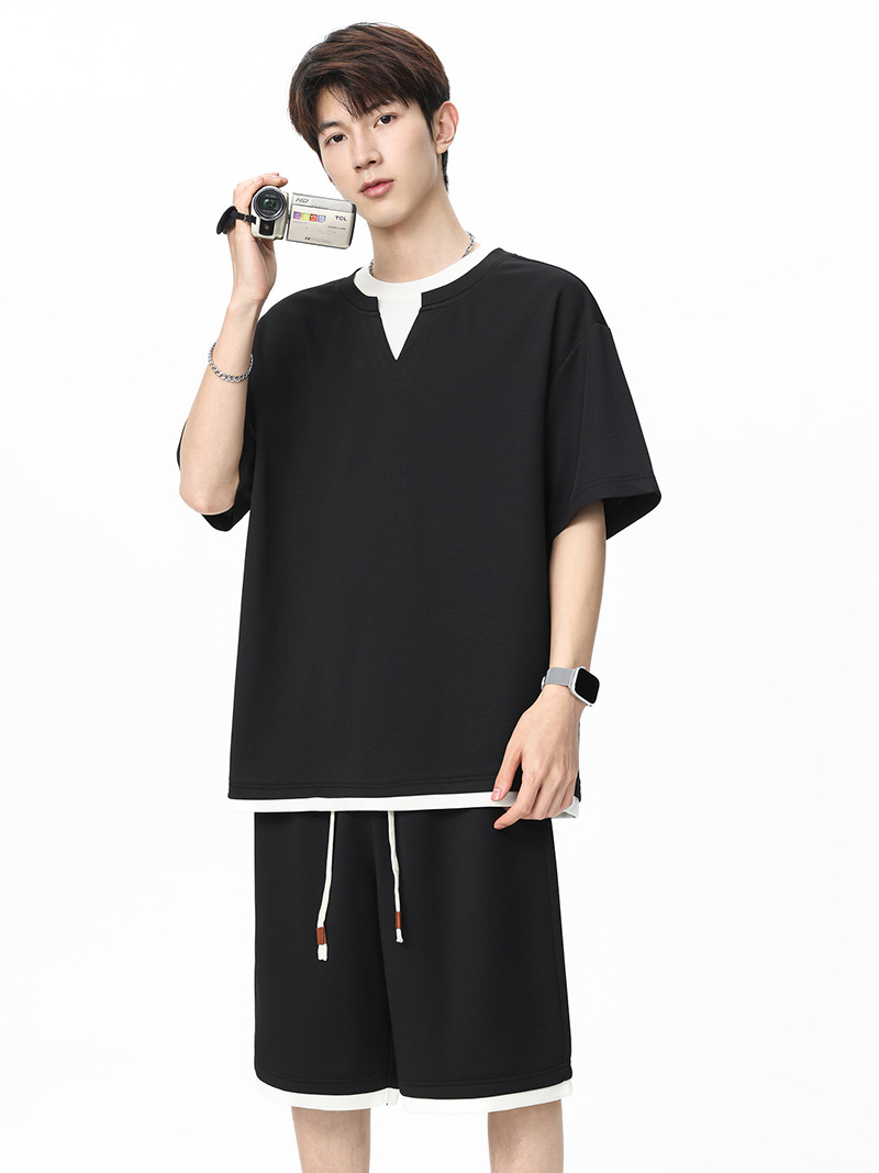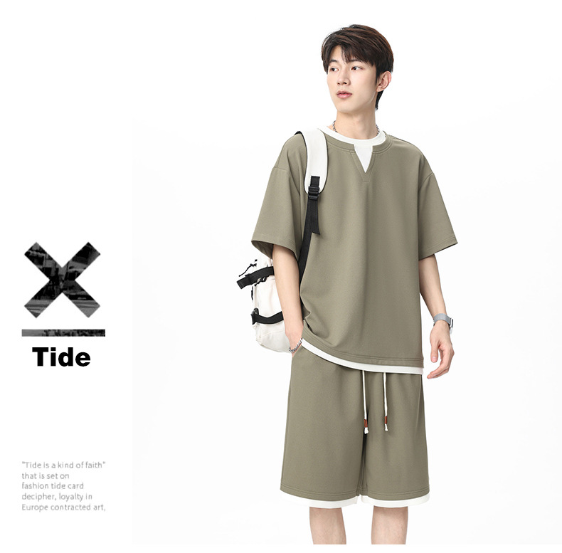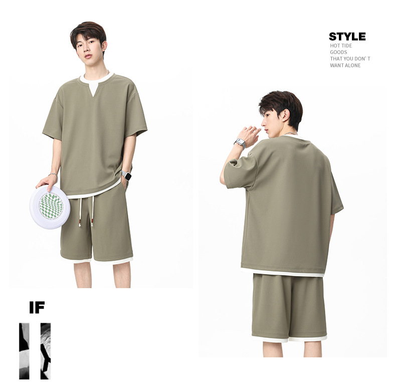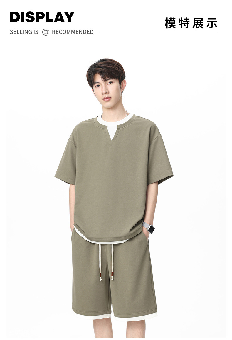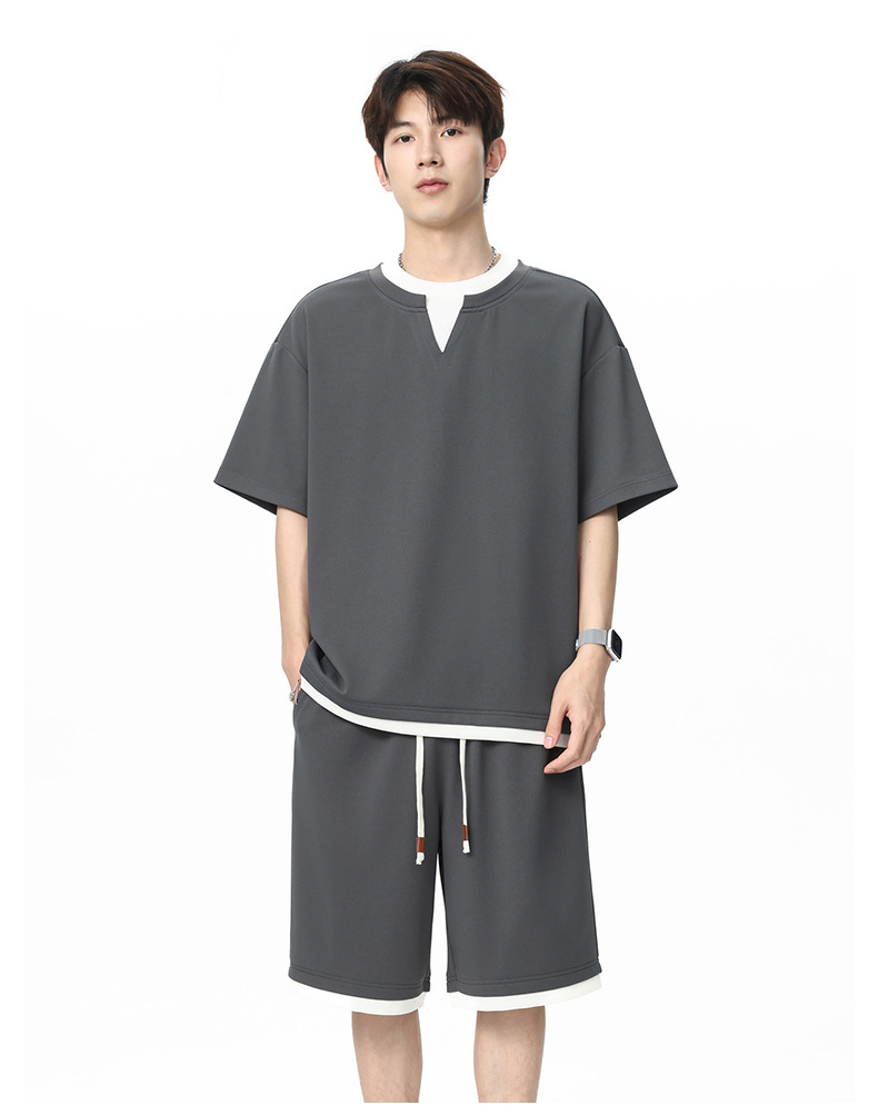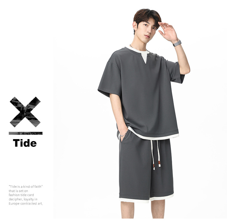 아메리칸 스타일 페이크 투피스 슈트 남성용 브이넥 티셔츠 남성용 여름 얼음 느낌 통기성 트렌디 브랜드 아웃도어 스포츠 루즈 세트