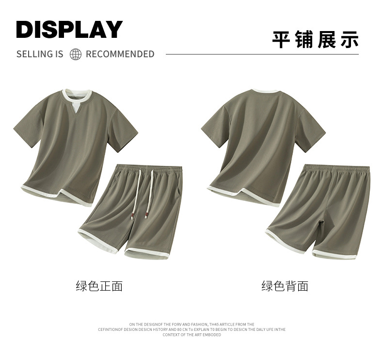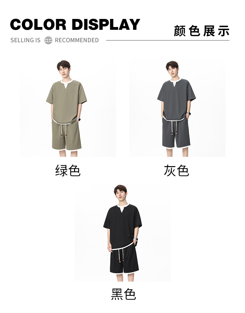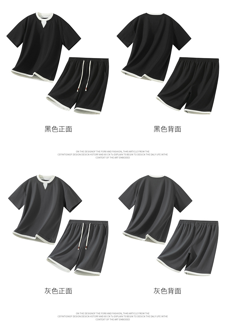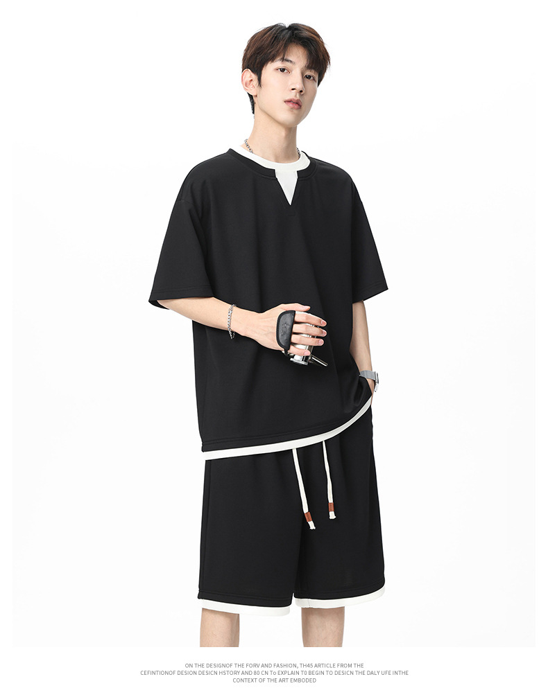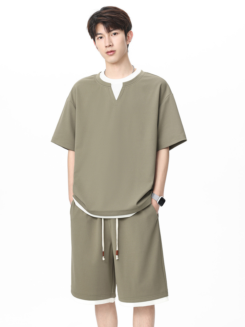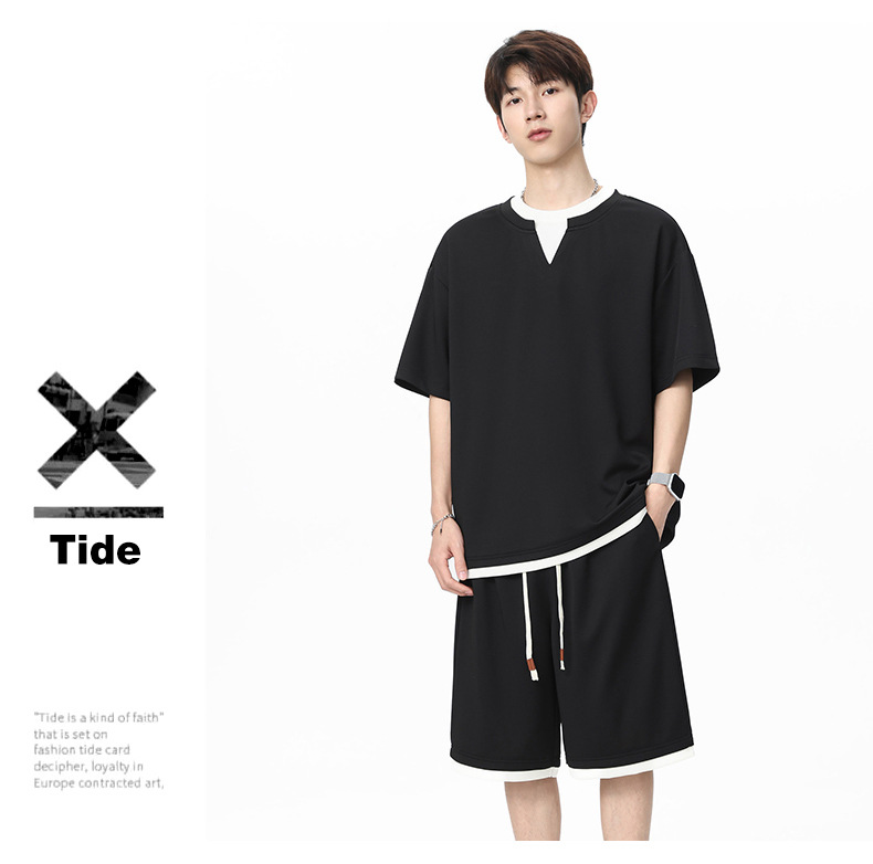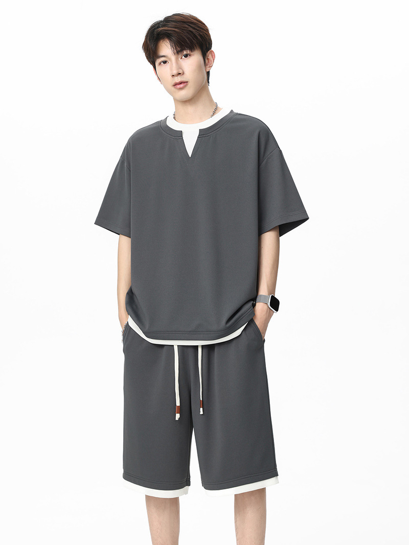 아메리칸 스타일 페이크 투피스 슈트 남성용 브이넥 티셔츠 남성용 여름 얼음 느낌 통기성 트렌디 브랜드 아웃도어 스포츠 루즈 세트