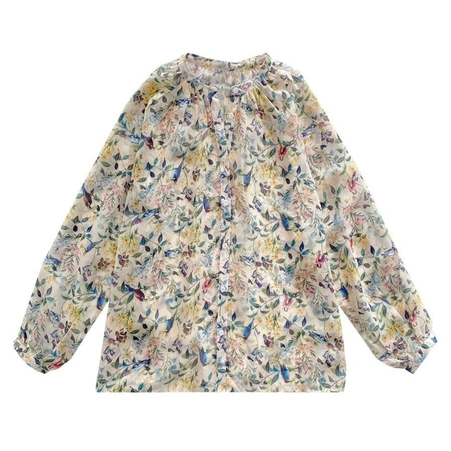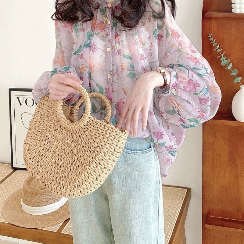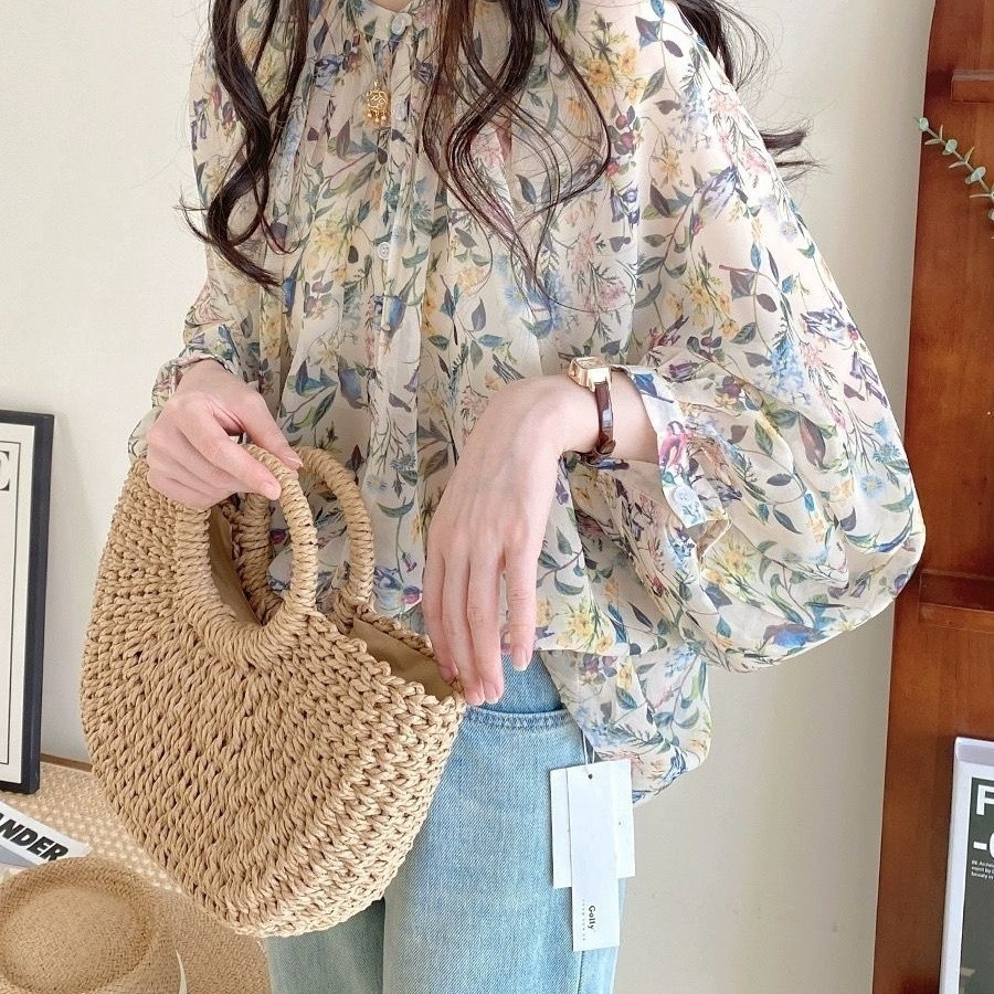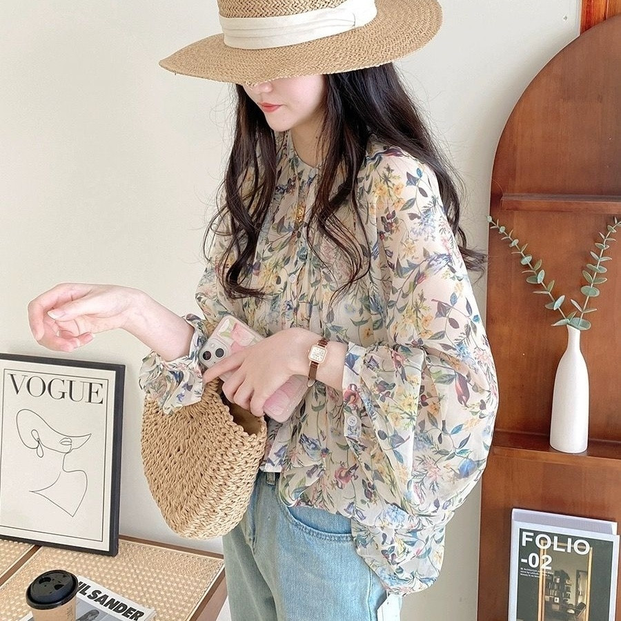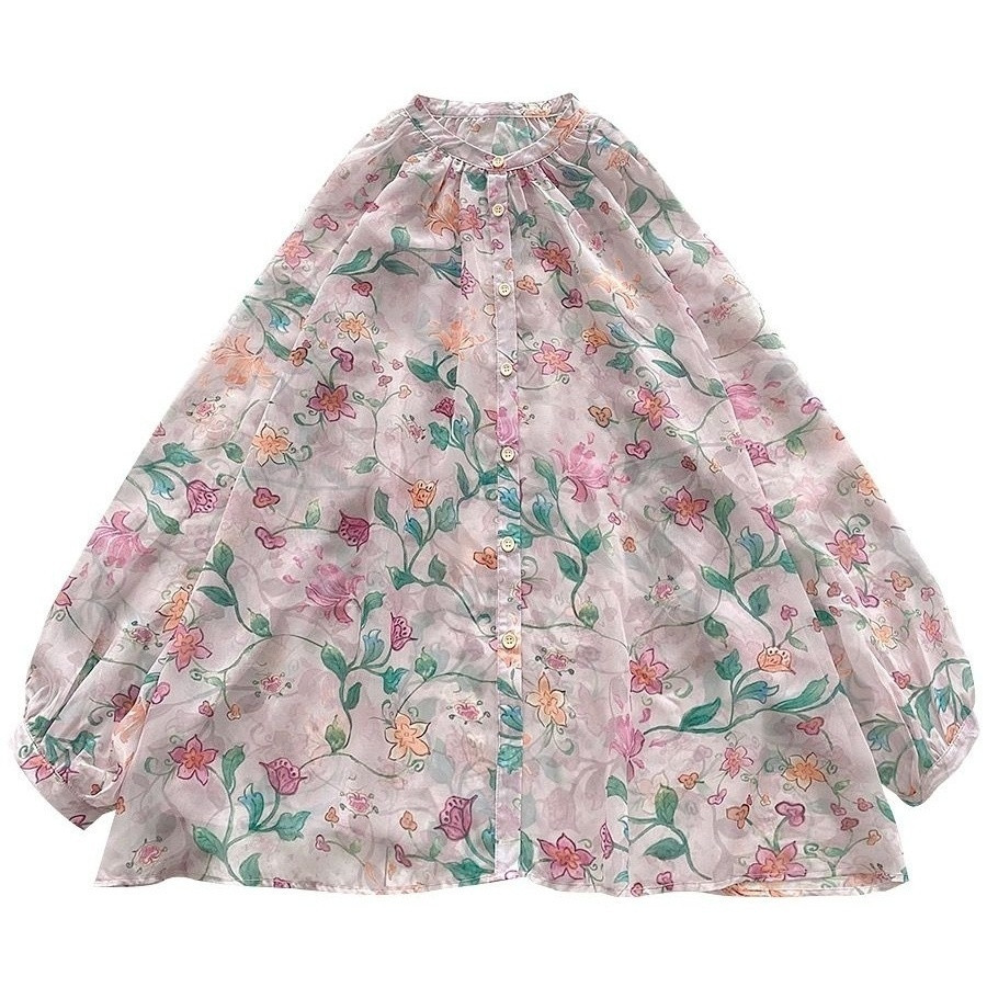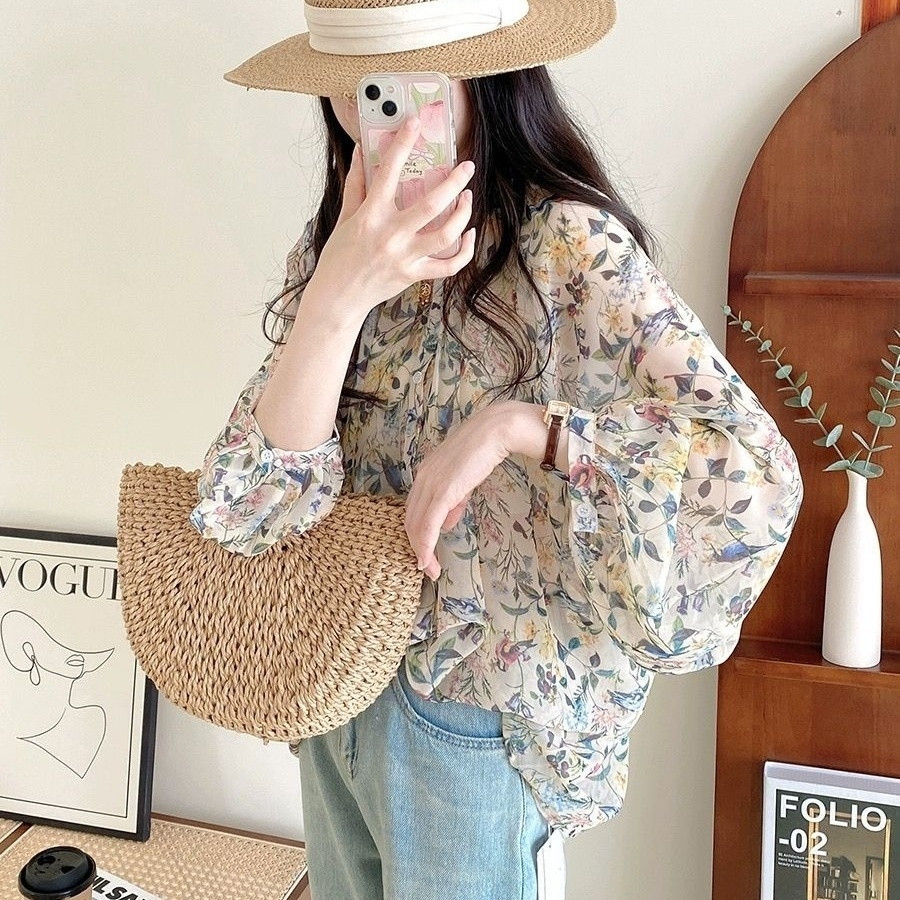 V5H 쉬폰 탑 여성 여름 2025 새로운 느슨한 패션 슬림 블라우스 Tulle Lantern 꽃 긴 소매 자외선 차단제
