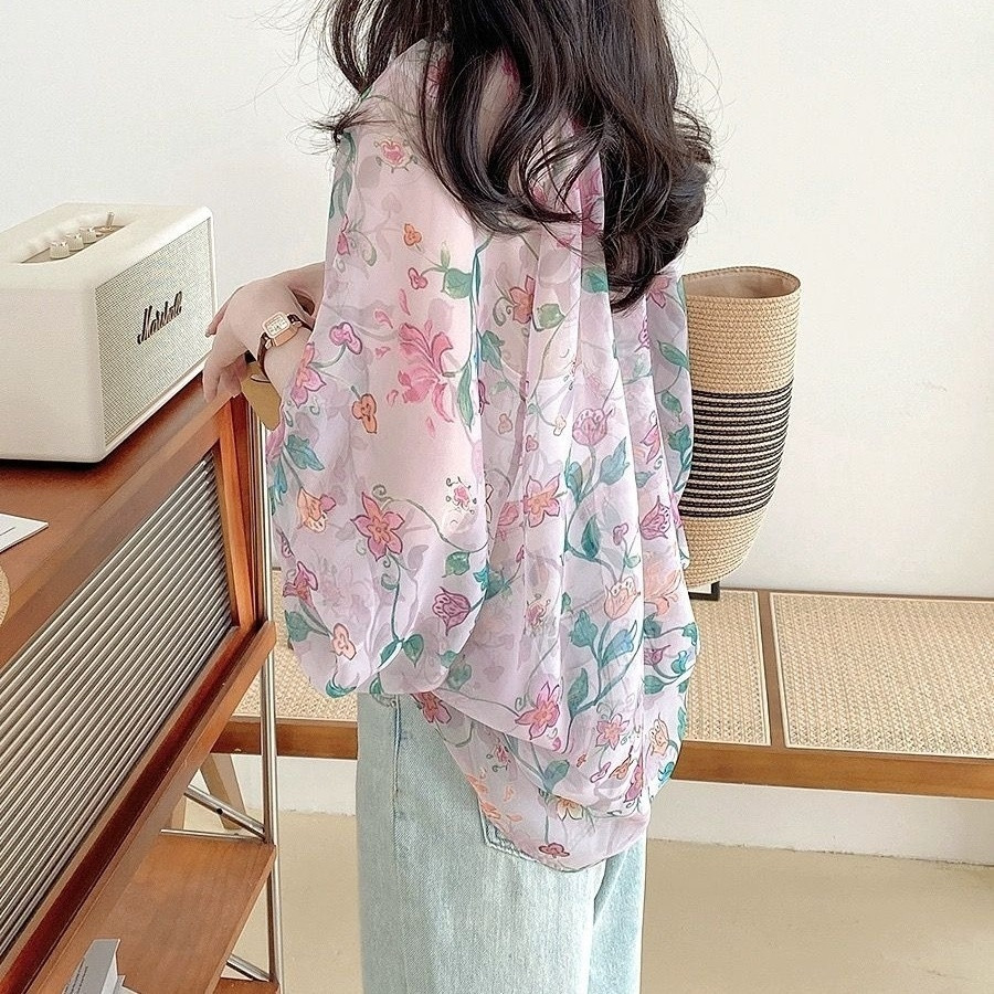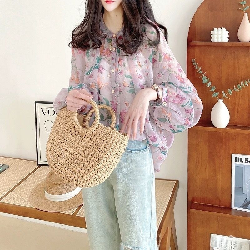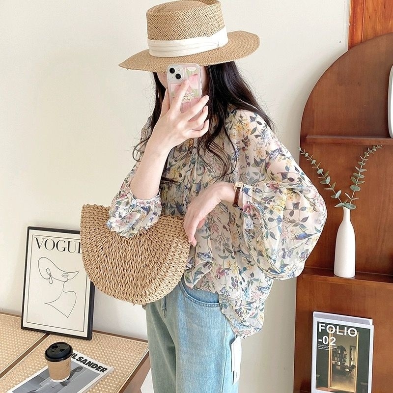 V5H 쉬폰 탑 여성 여름 2025 새로운 느슨한 패션 슬림 블라우스 Tulle Lantern 꽃 긴 소매 자외선 차단제스토어 가기