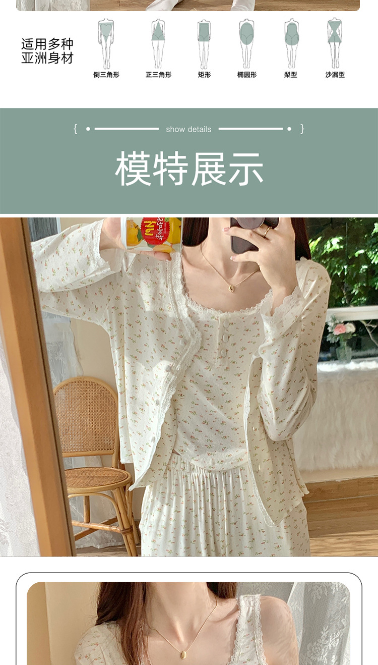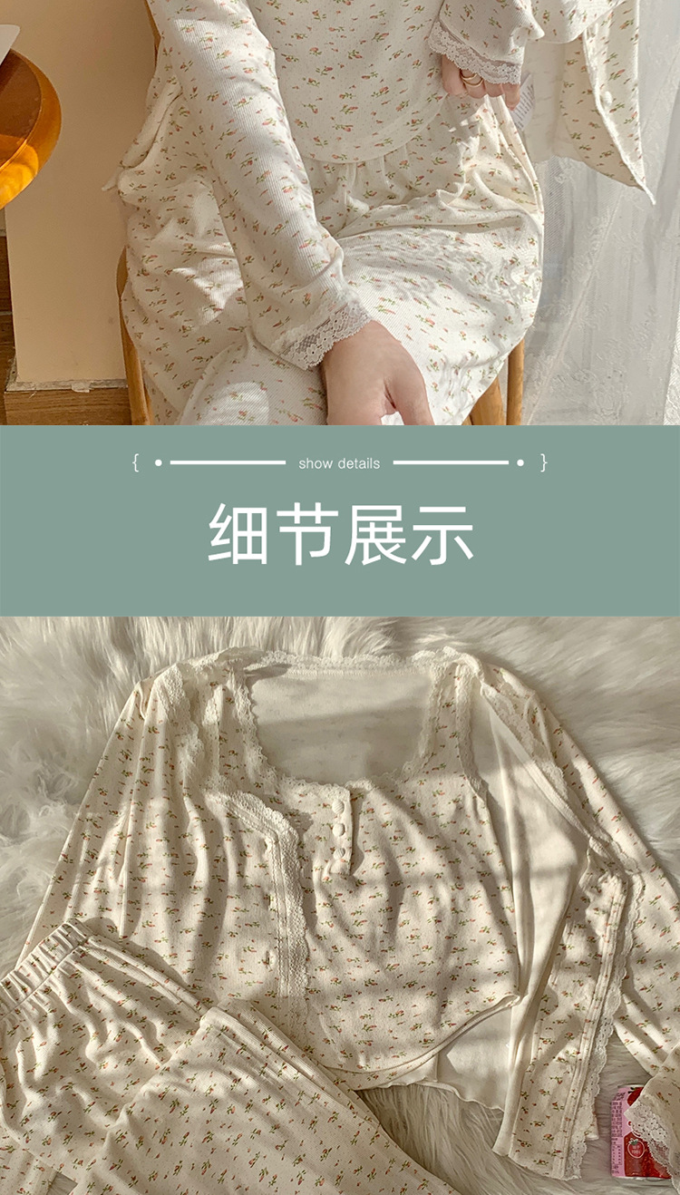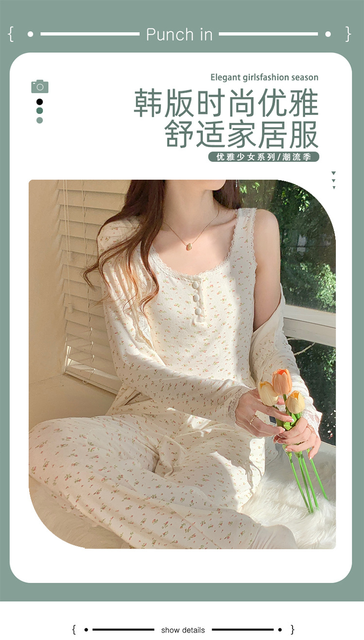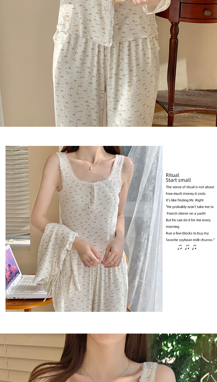 여성용 3피스 잠옷, 봄, 가을 조끼, 가디건, 바지, 달콤한 면 꽃무늬 레이스 홈웨어 세트스토어 가기
