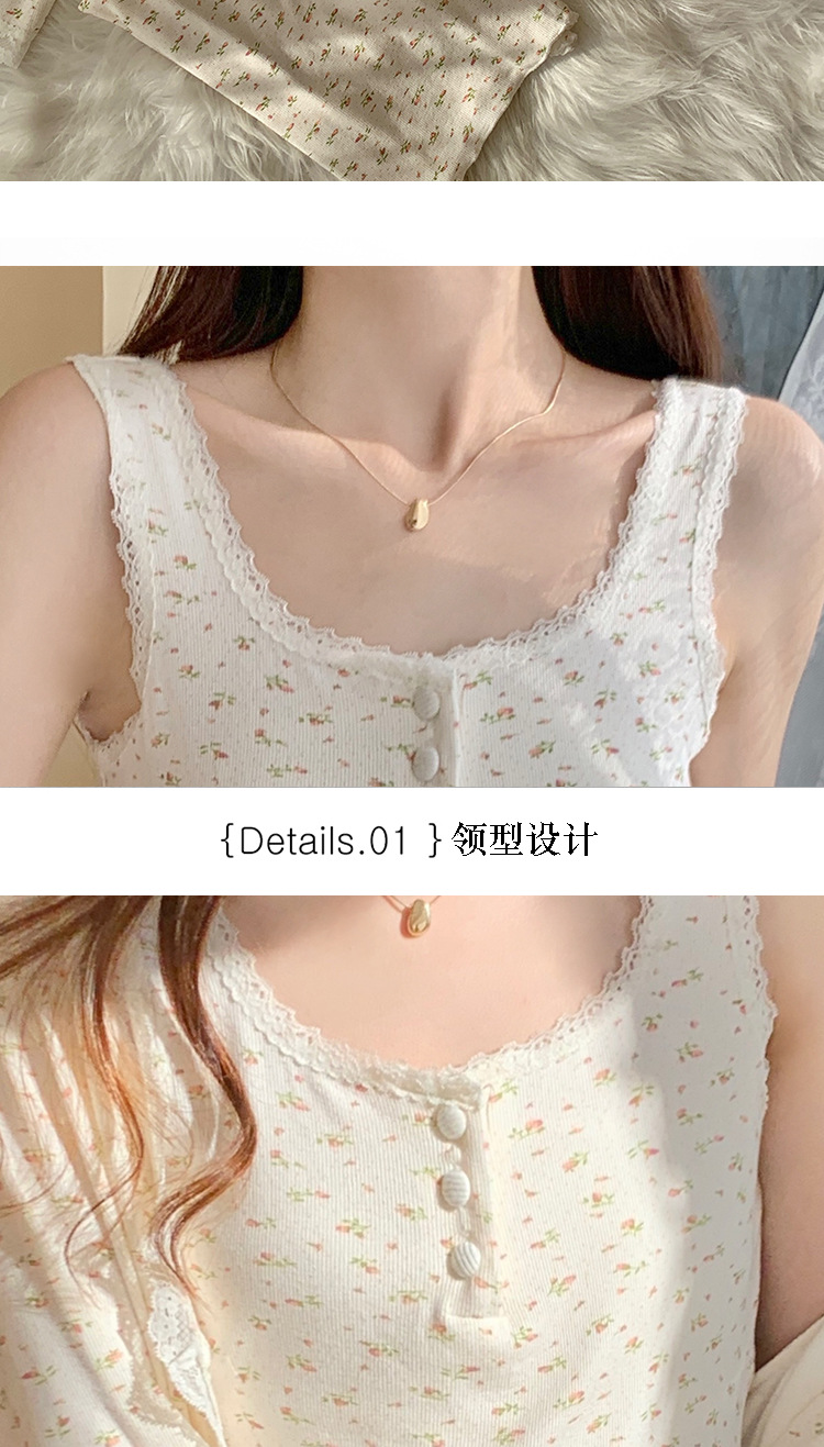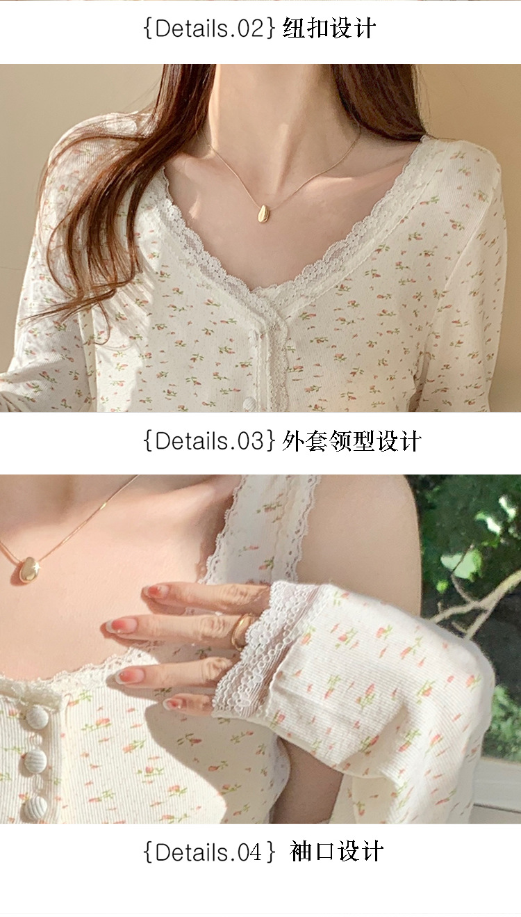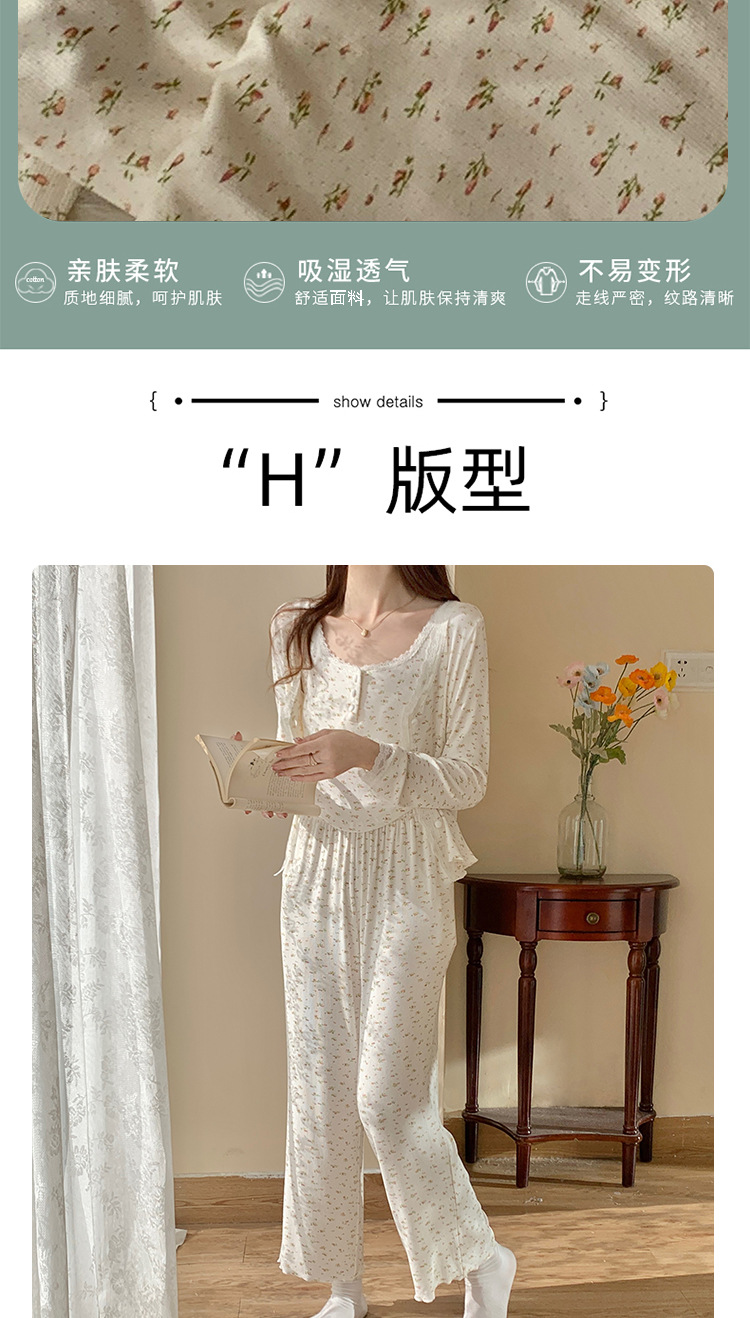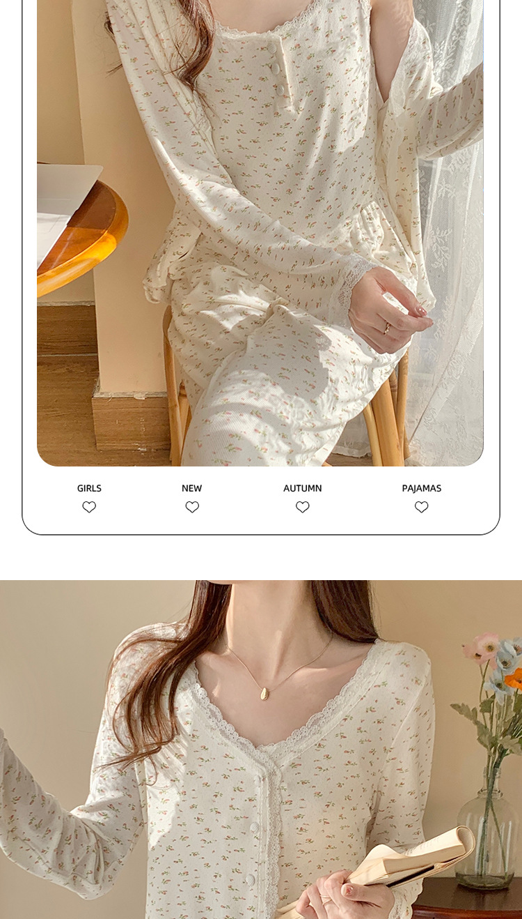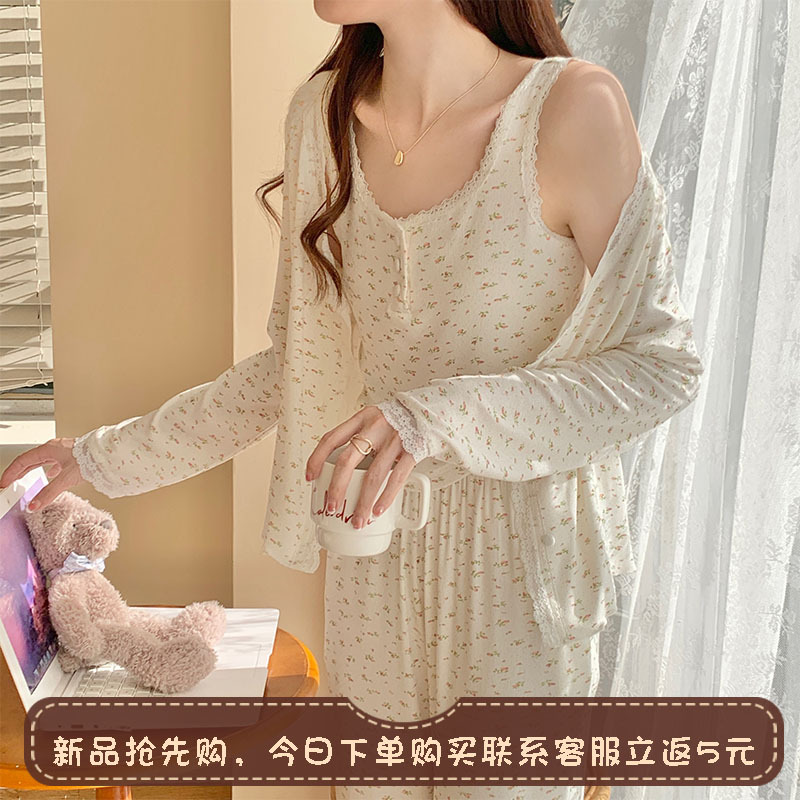 여성용 3피스 잠옷, 봄, 가을 조끼, 가디건, 바지, 달콤한 면 꽃무늬 레이스 홈웨어 세트스토어 가기
