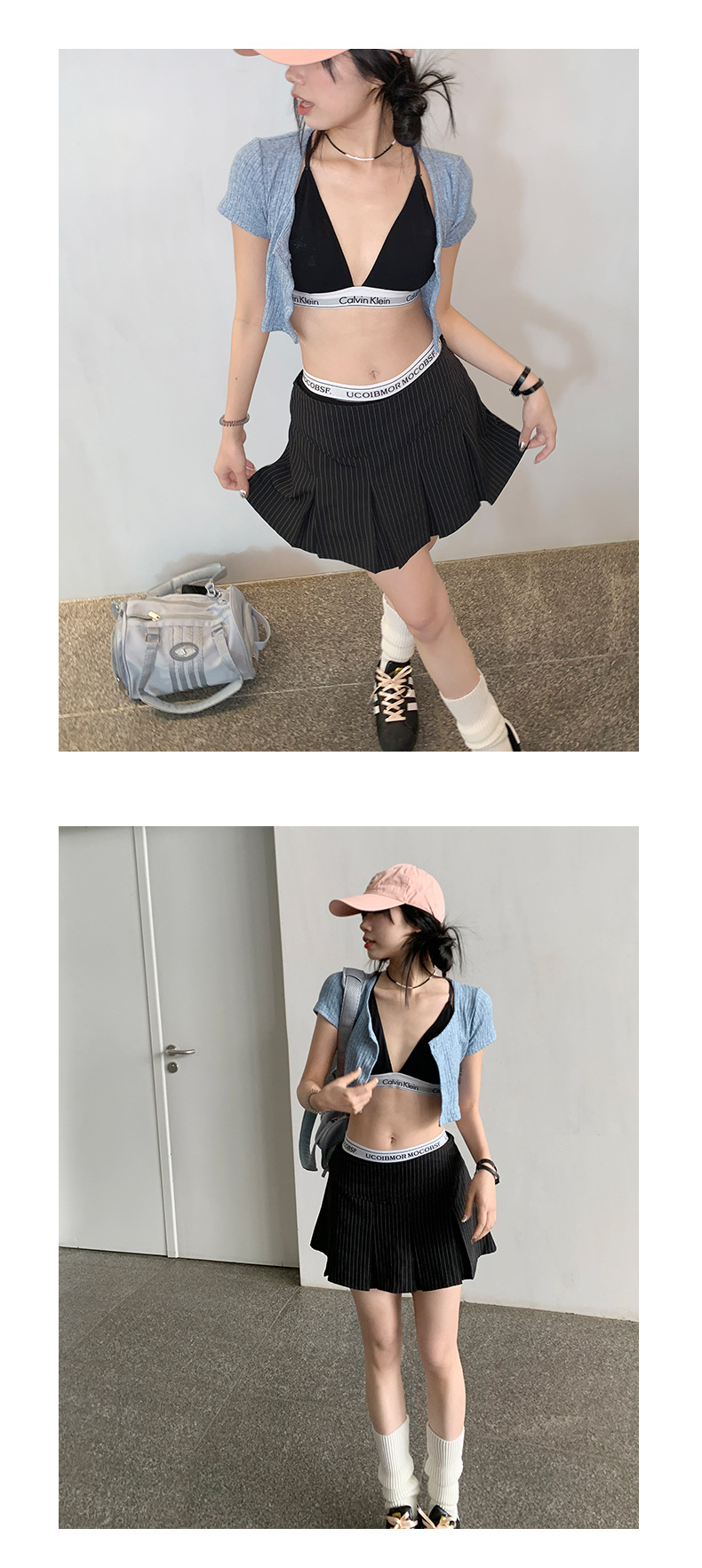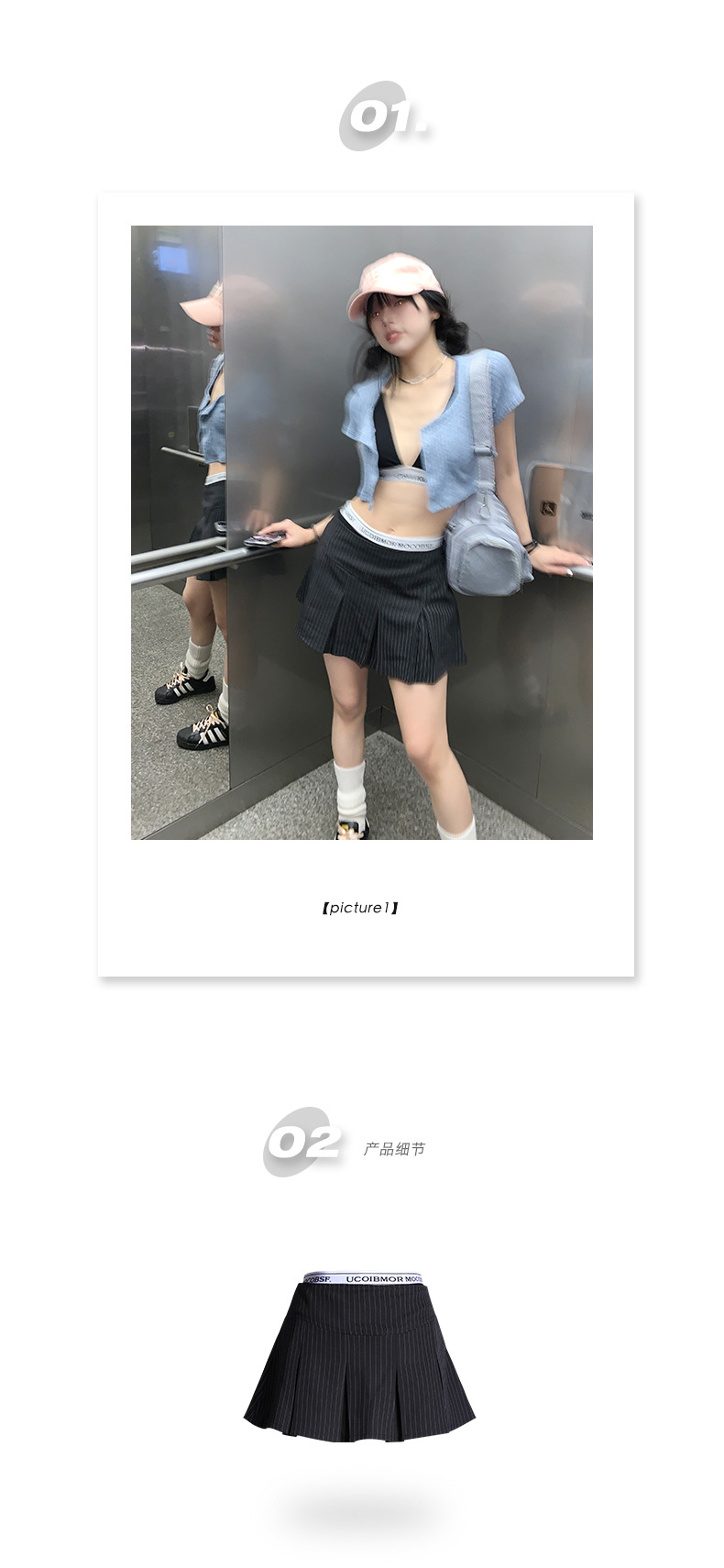 여성용 한국 세련된 블랙 스트라이프 플리츠 스커트 한국 스타일 달콤하고 매콤한 스트레치 레터 웨이스트 다용도 슬리밍 미니 스커트스토어 가기