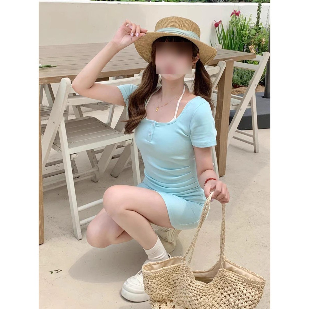 달콤하고 귀여운 가짜 투피스 홀터넥 스트랩 캐주얼 일본식 달콤한 솔리드 컬러 여성용 반팔 드레스