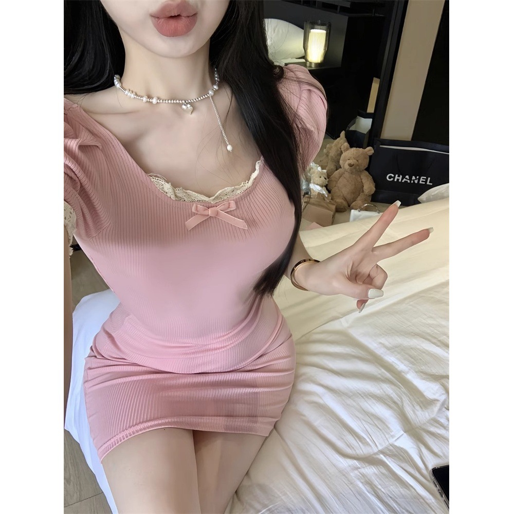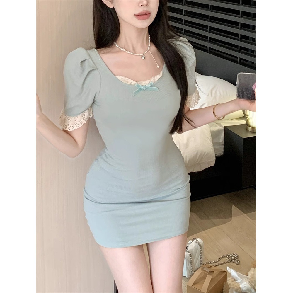 蕾丝花边圆领短袖连衣裙女春甜辣妹纯欲收腰包臀裙紧身一步短裙子