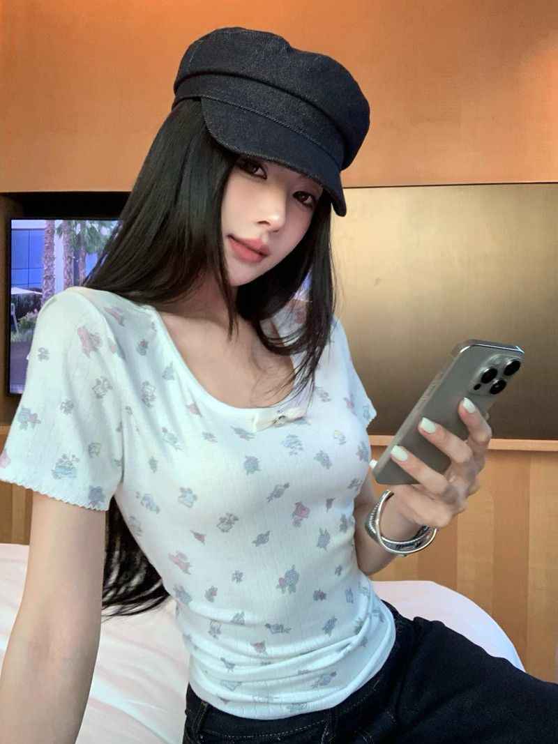 활 인쇄 U-목 반팔 니트 티셔츠 여성의 여름 슬림-맞는 내부 디자인 달콤하고 뜨거운 단단한 어깨 탑