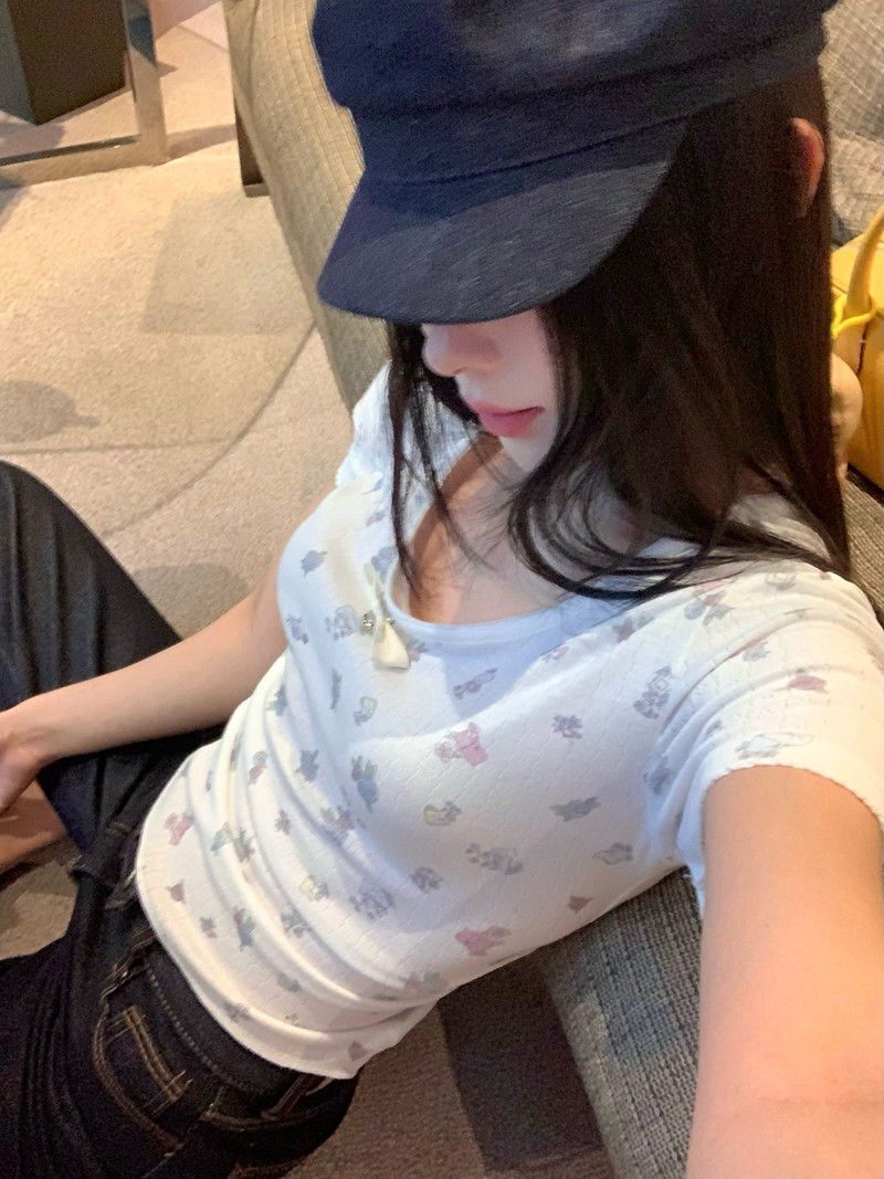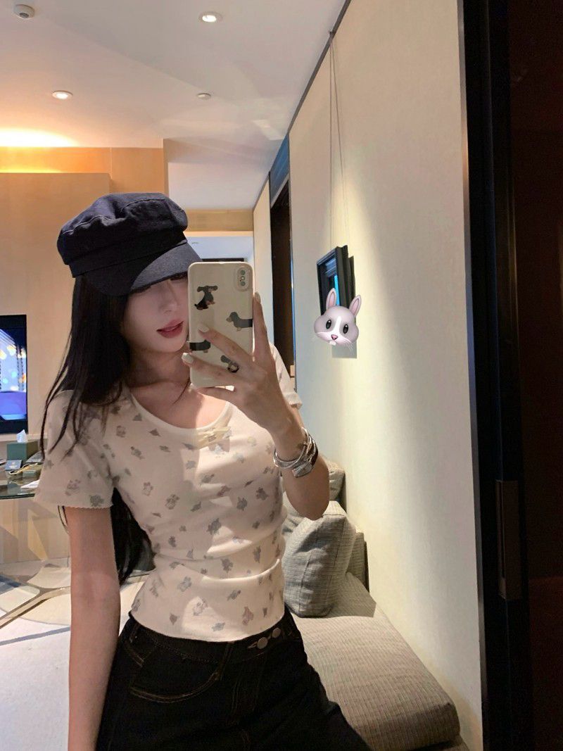 활 인쇄 U-목 반팔 니트 티셔츠 여성의 여름 슬림-맞는 내부 디자인 달콤하고 뜨거운 단단한 어깨 탑스토어 가기