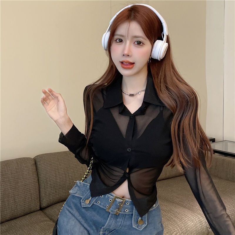 뜨거운 소녀 섹시한 얇은 관점 메쉬 셔츠 짧은 모든 경기 우아한 슬림-태양 보호 셔츠 탑스토어 가기