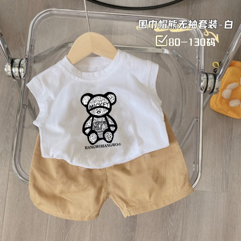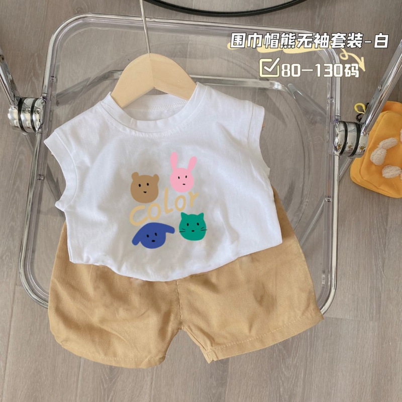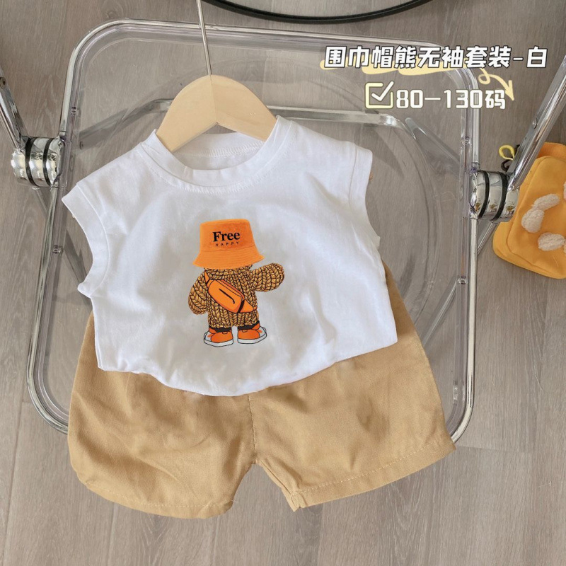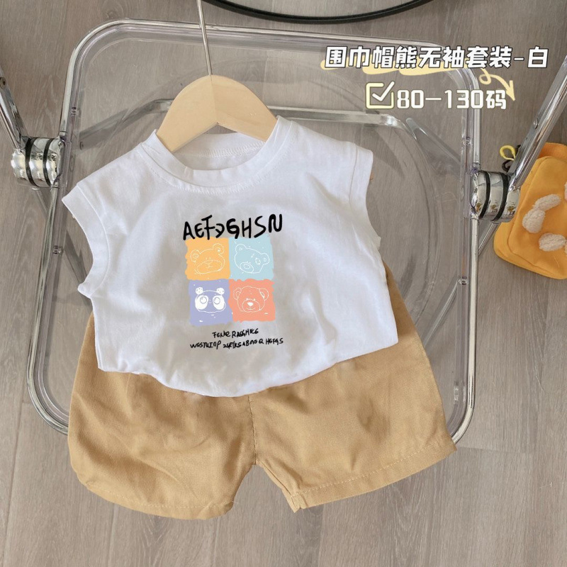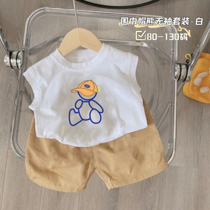 새로운 2025 여름 새로운 중소 어린이 민소매 조끼 티셔츠 반바지 소년 만화 아기 투피스 세트스토어 가기