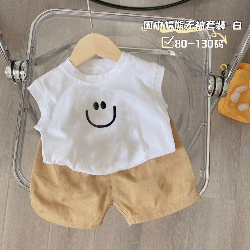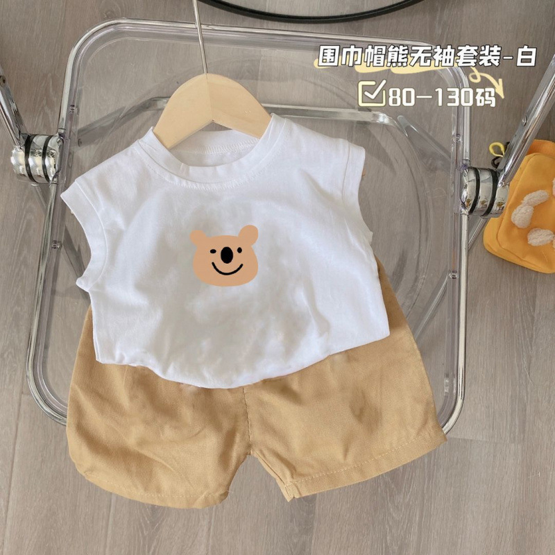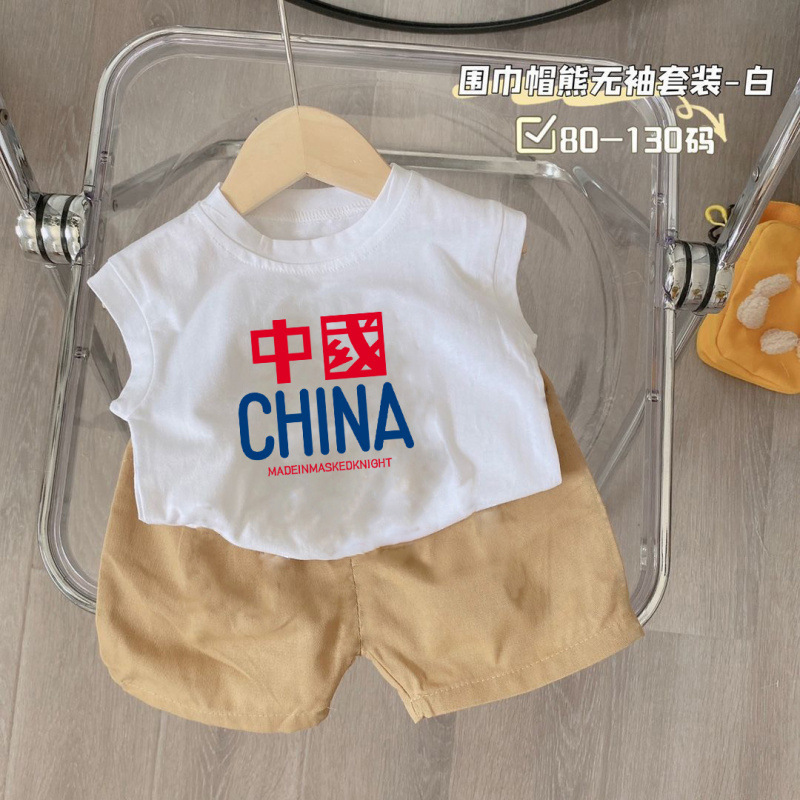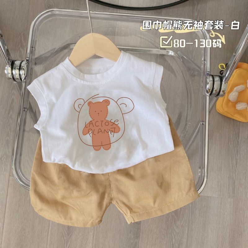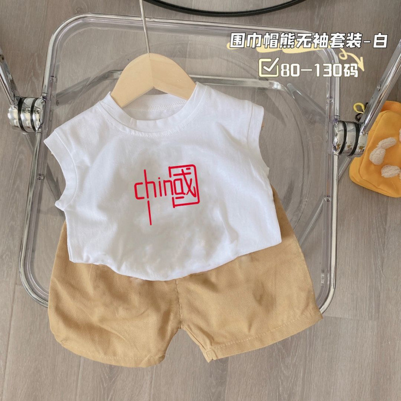새로운 2025 여름 새로운 중소 어린이 민소매 조끼 티셔츠 반바지 소년 만화 아기 투피스 세트스토어 가기