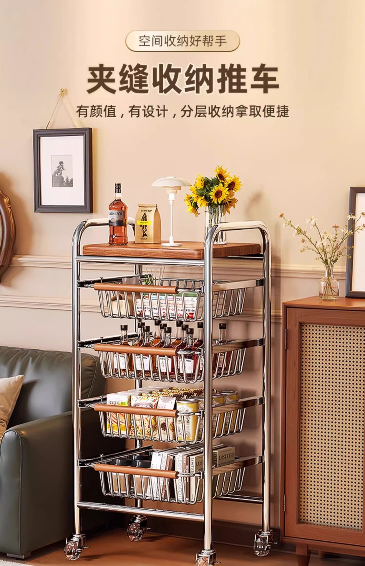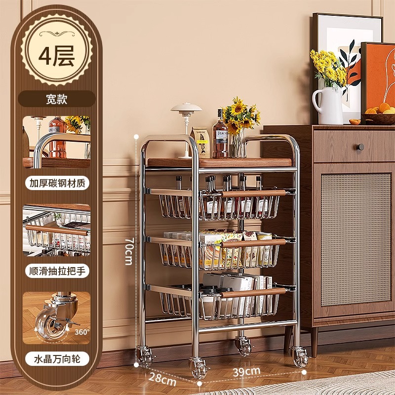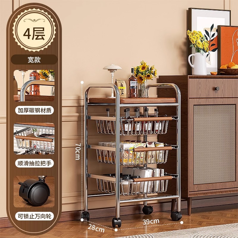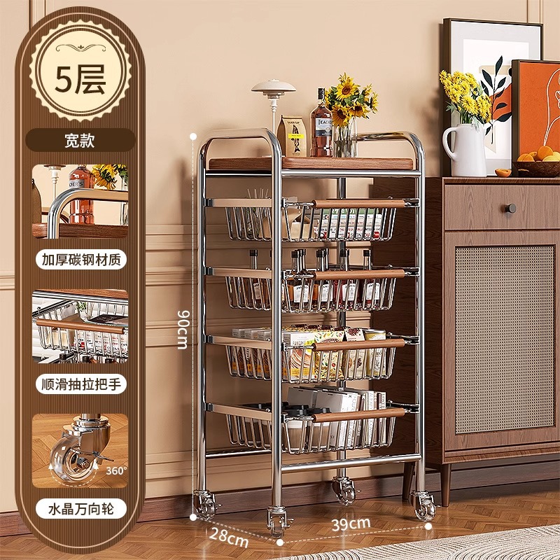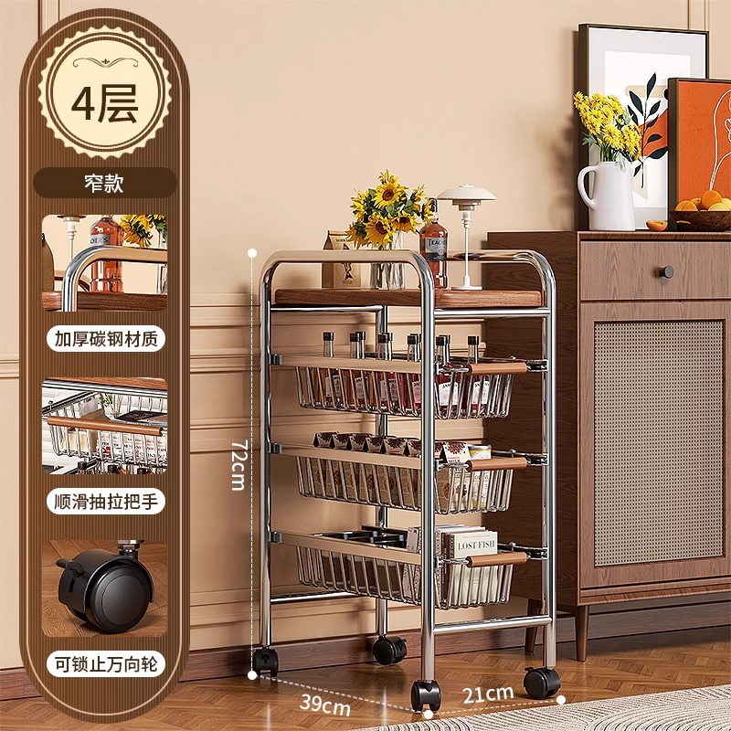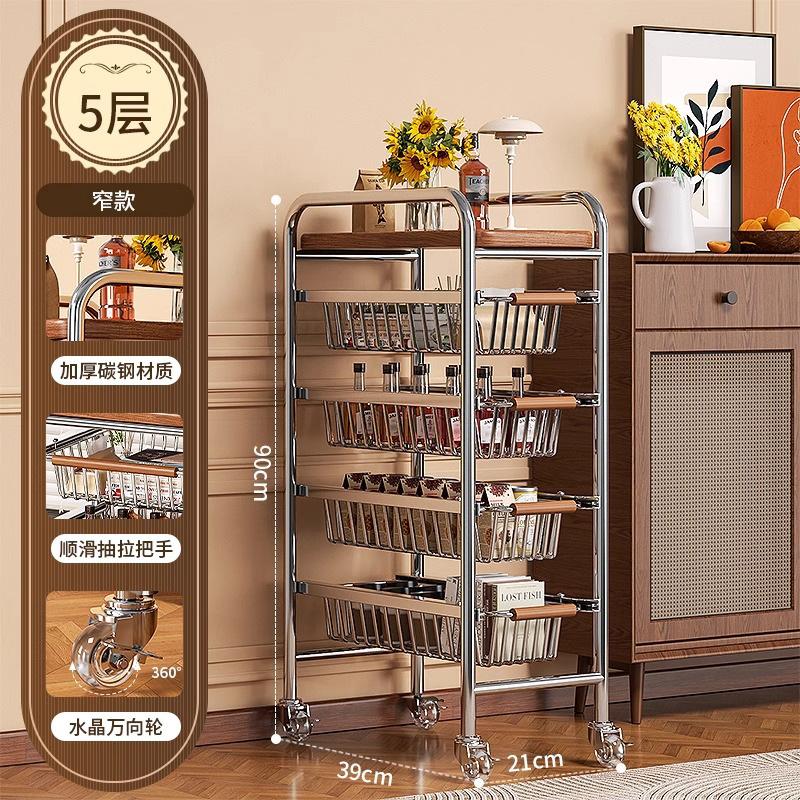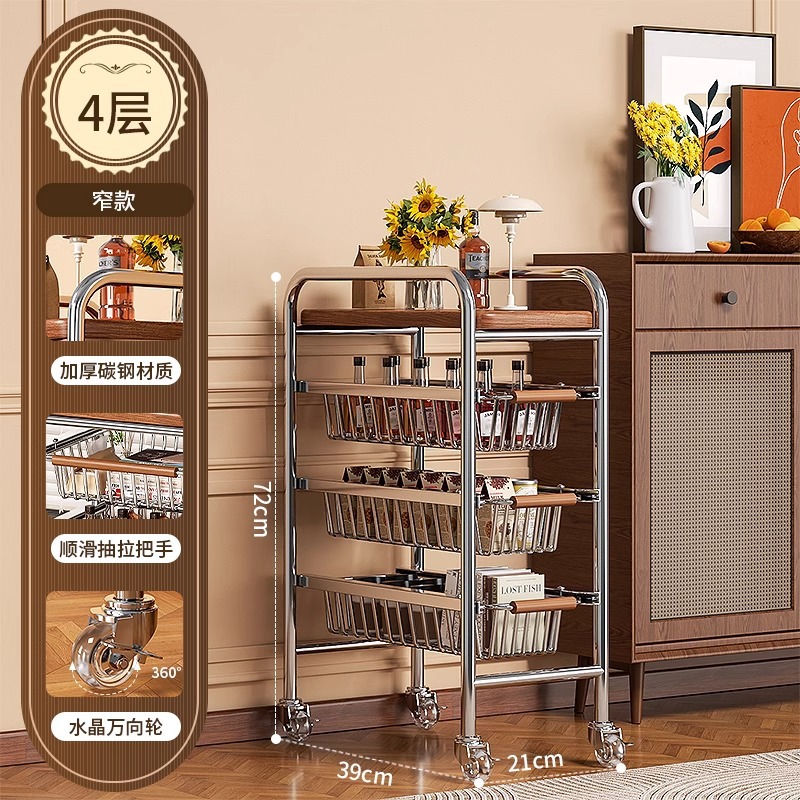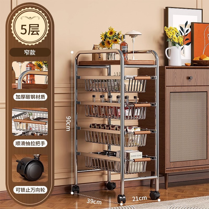 중세 스타일 틈새 트롤리 보관함 다층 거실 스낵 과일 및 야채 주방 야채 바구니 이동식 보관 캐비닛