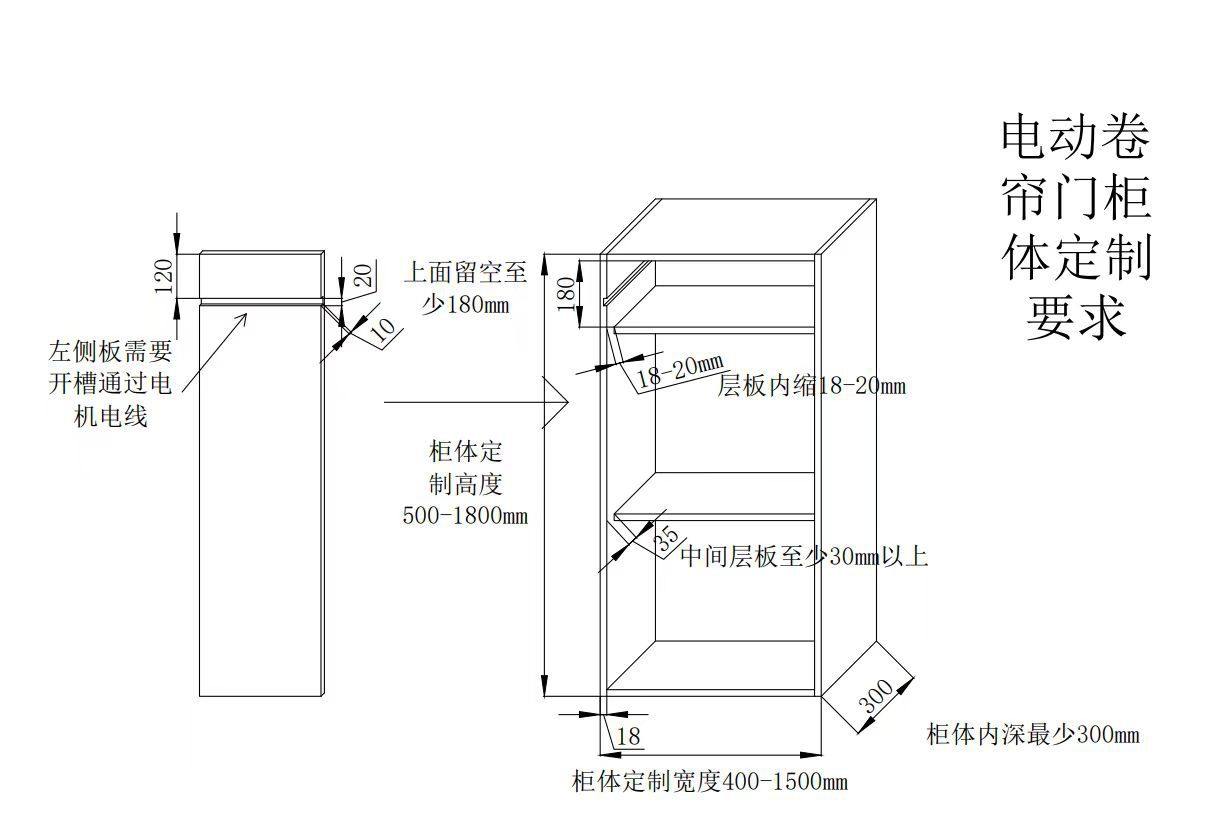 根据客户柜子内宽*内高*内深尺寸定制门:定制要求侧板满足18mm厚,层板内缩30mm轨道卡18板,轨道要比柜子凸出18mm,柜体宽度限制500-1500mm以内,高度500-1700以内,深度大于300以上轴和侧板占柜子内高200mm*300深度。