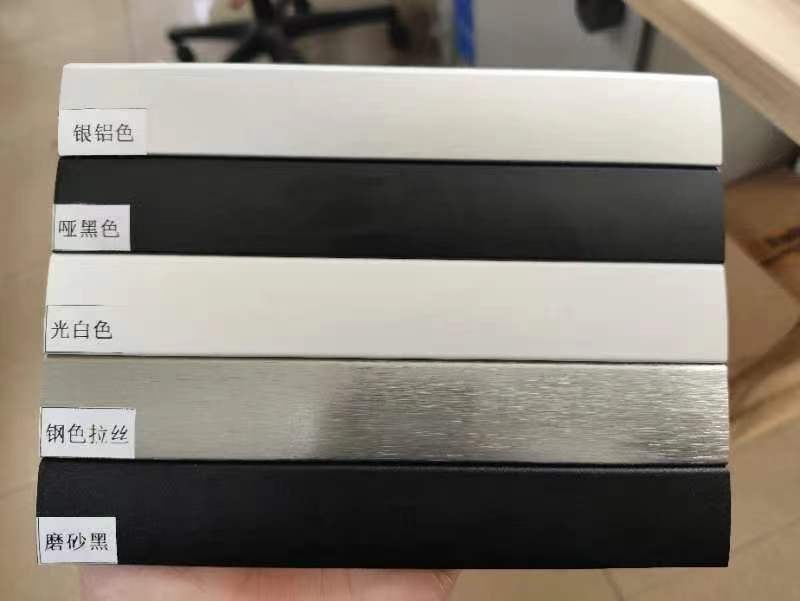 颜色:1:银铝色(氧化铝色)2:光白色3:哑黑色.4:磨砂黑色.5:钢拉丝色.6:黑色玻璃.7:白色玻璃.8:磨砂玻璃