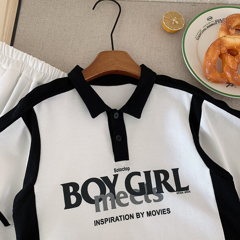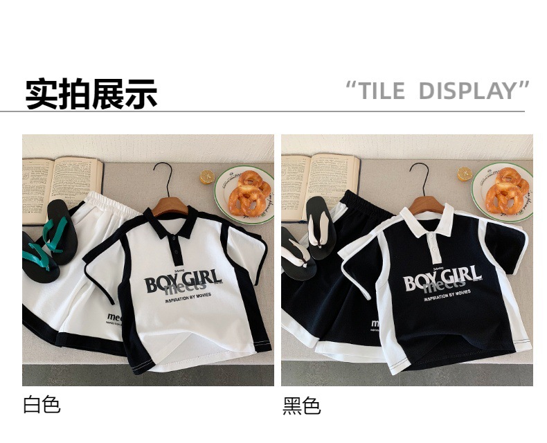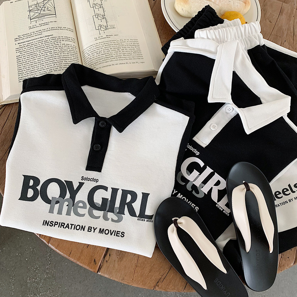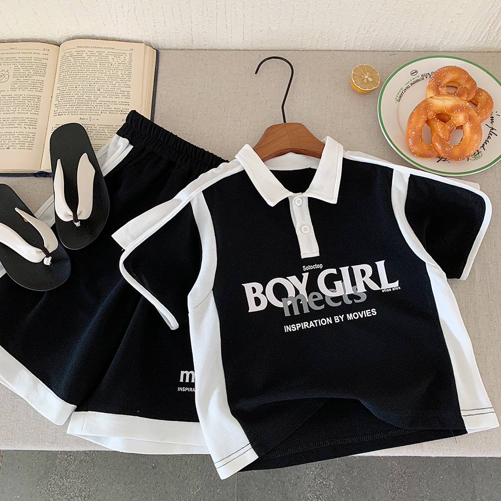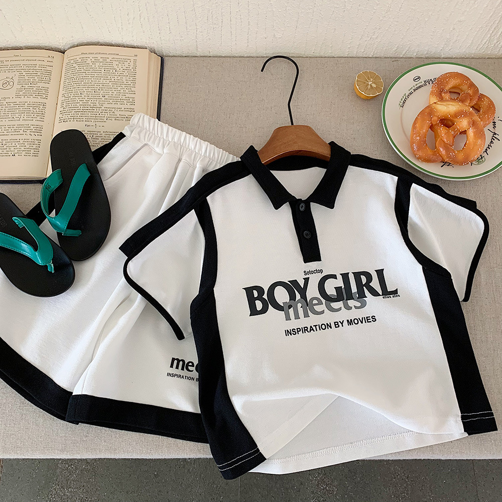 남아 및 여아용 아동용 여름 야외복, 한국식 폴로 셔츠, 반팔 5부 바지, 유아용 대비색 캐주얼 투피스 세트스토어 가기