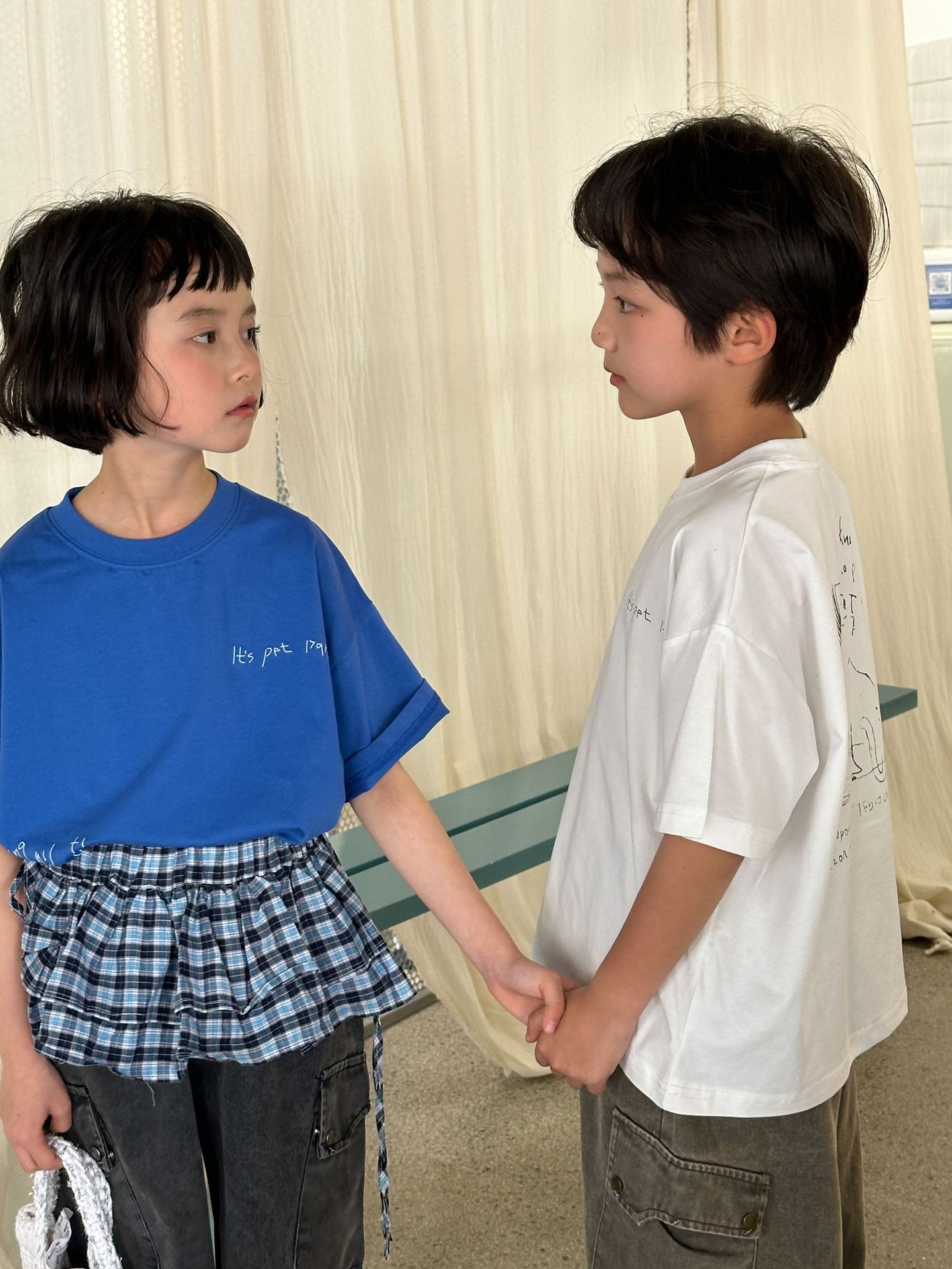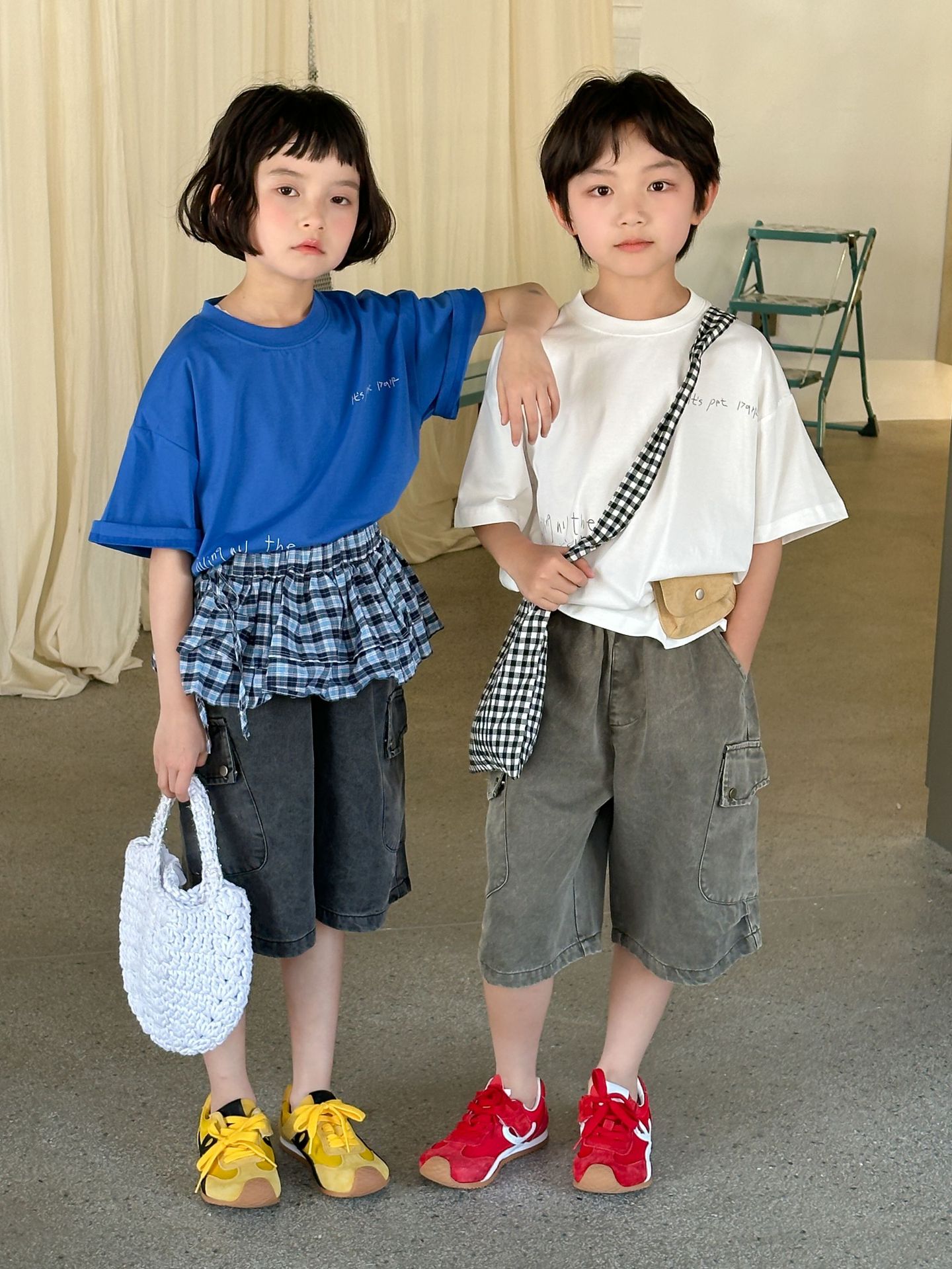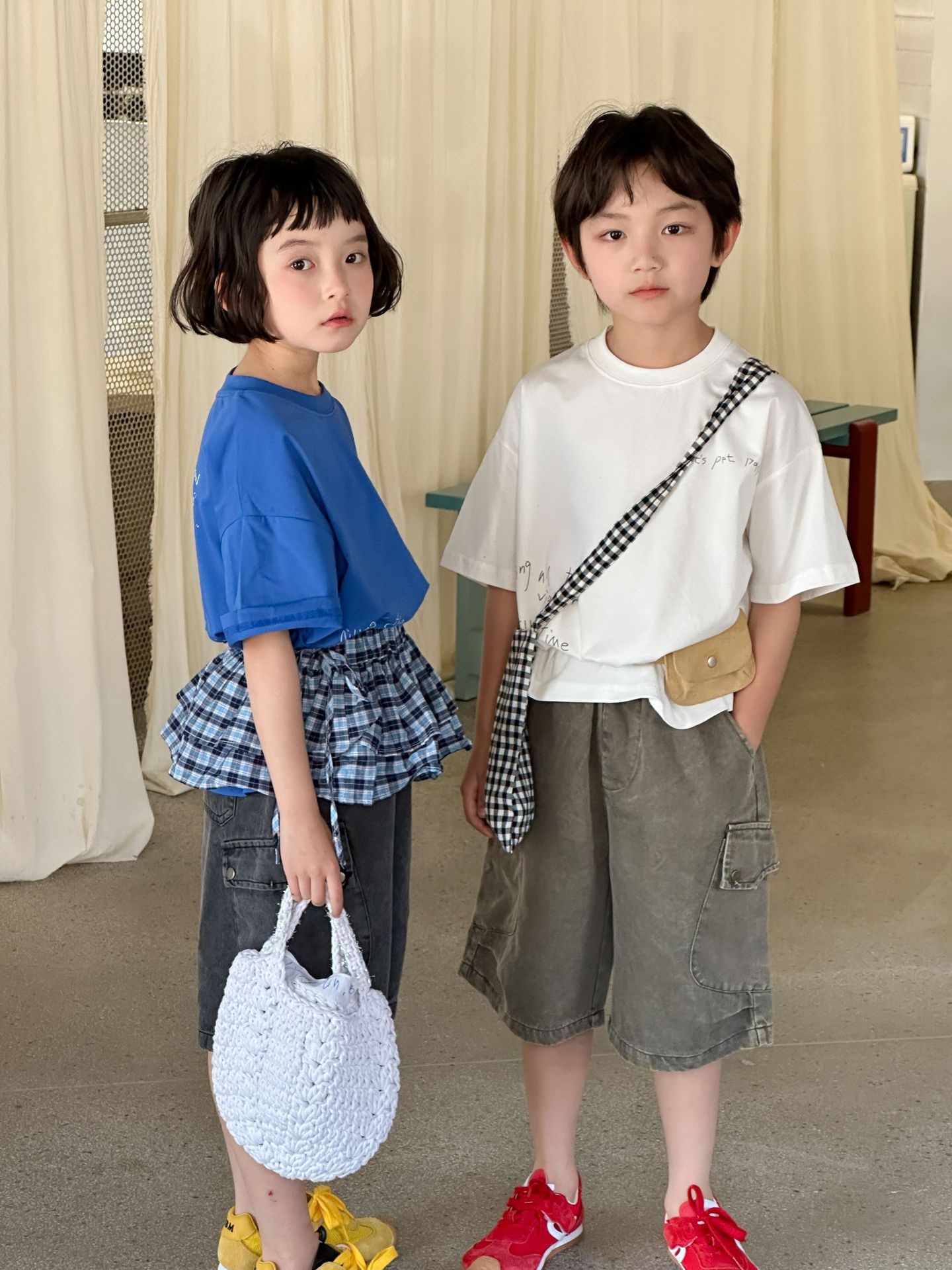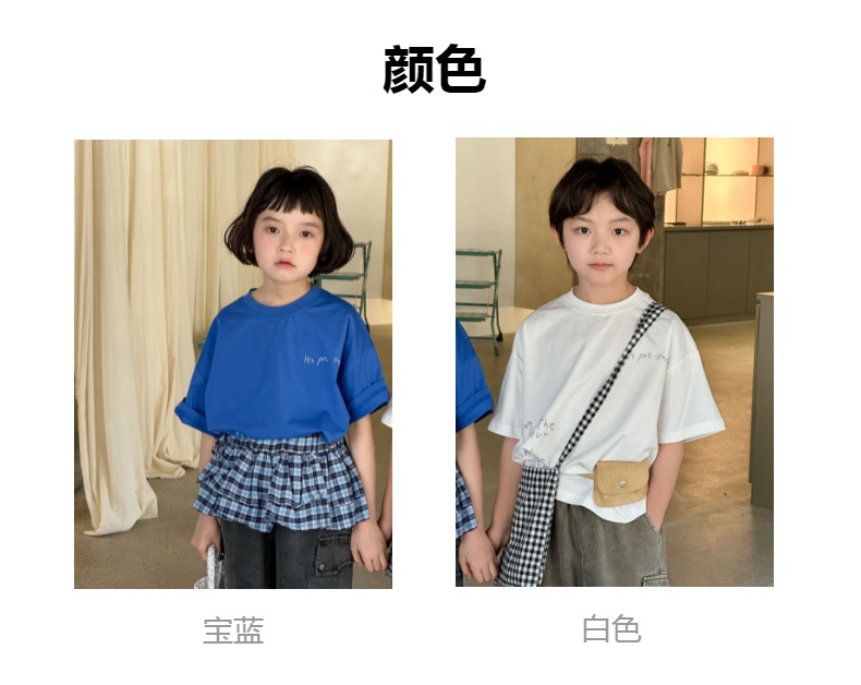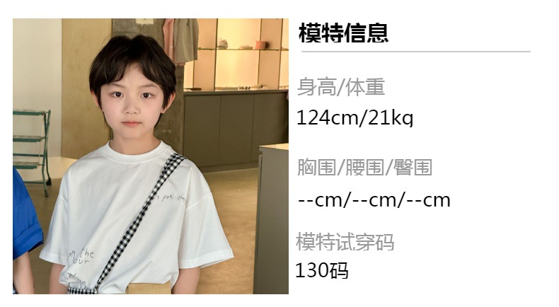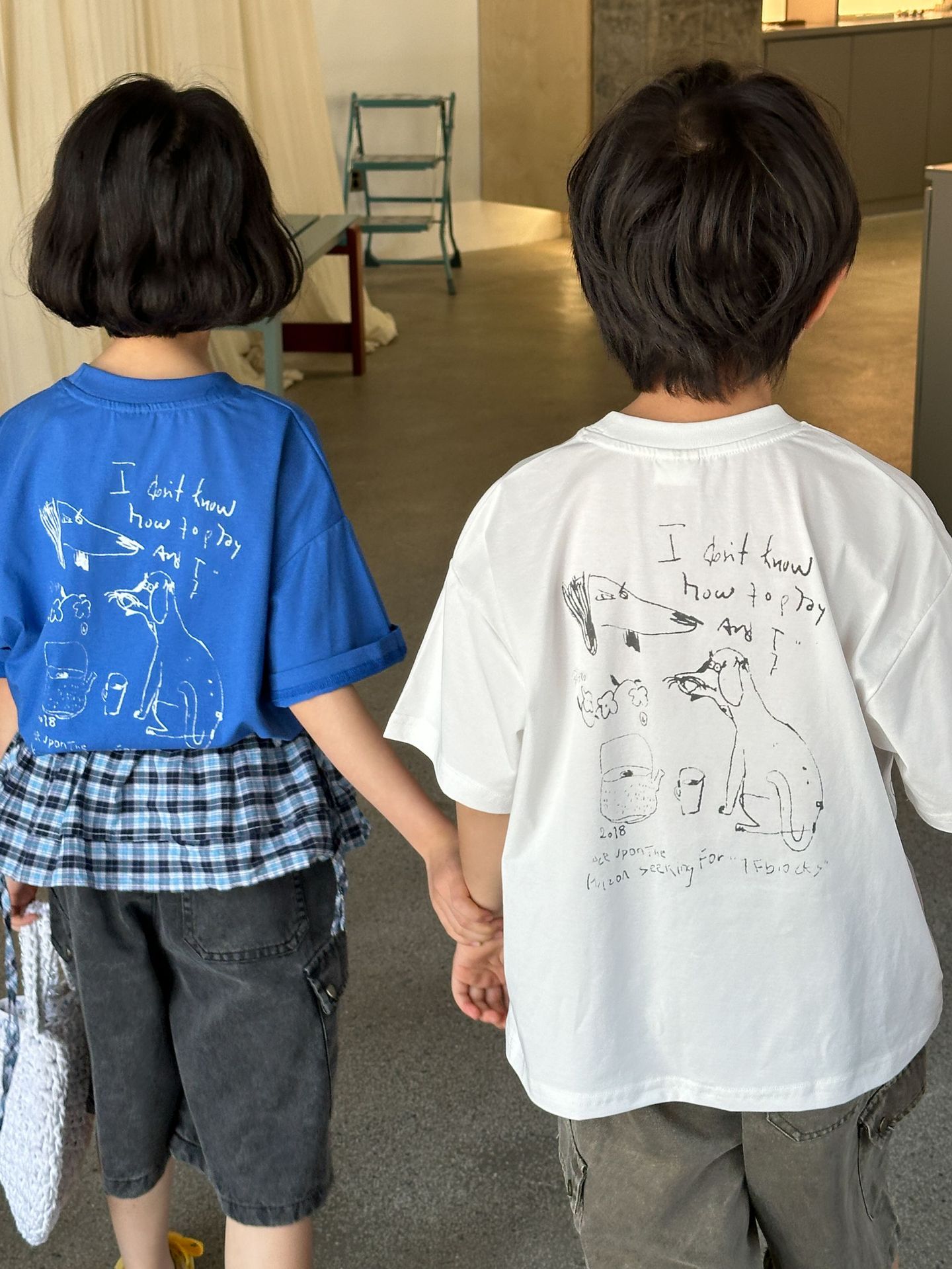 2025년 새로운 여름 한국식 어린이 앞면과 뒷면 프린트 반팔 흰색 사파이어 블루 라운드 넥 루즈 티셔츠 소년 소녀용스토어 가기