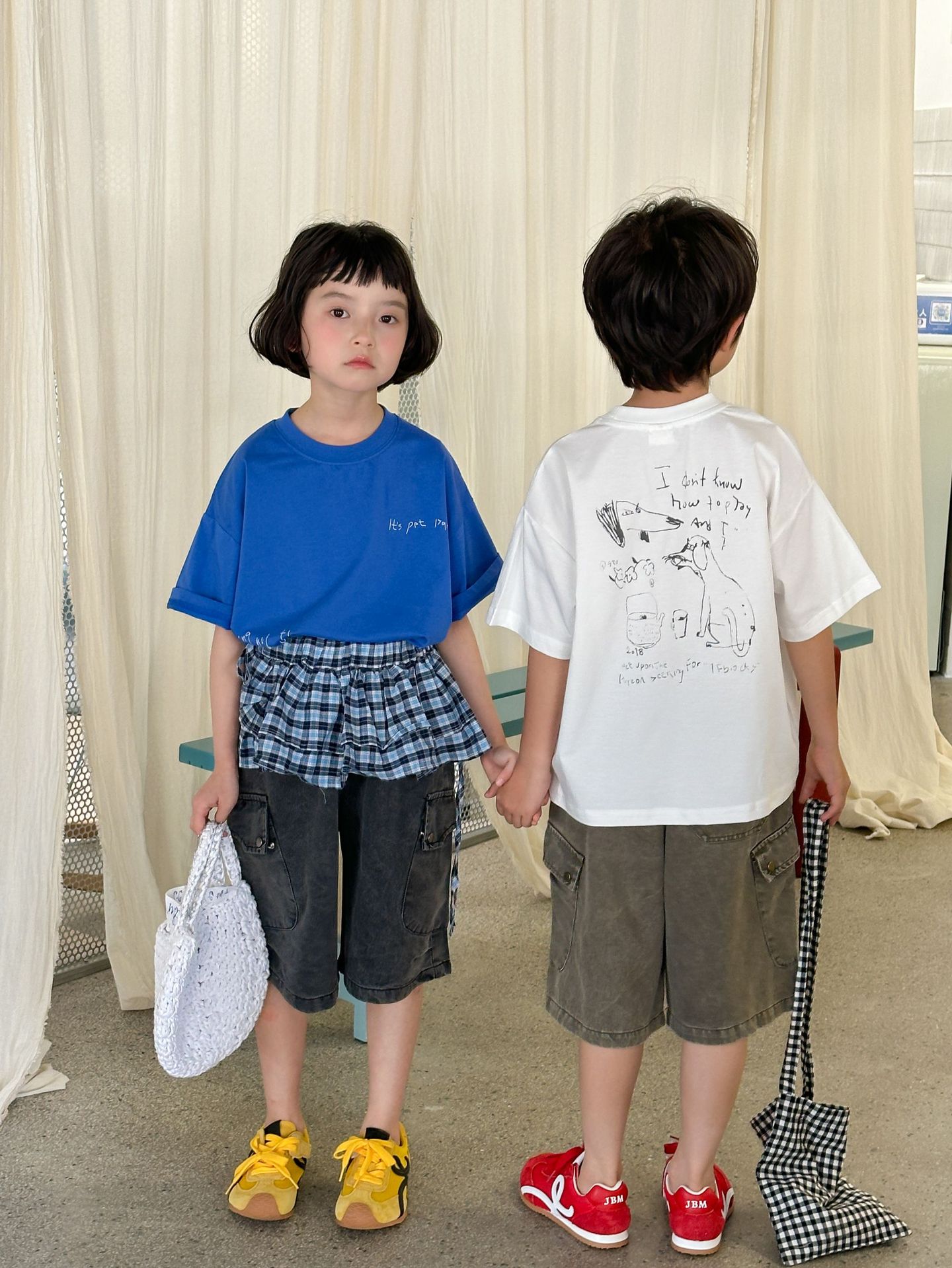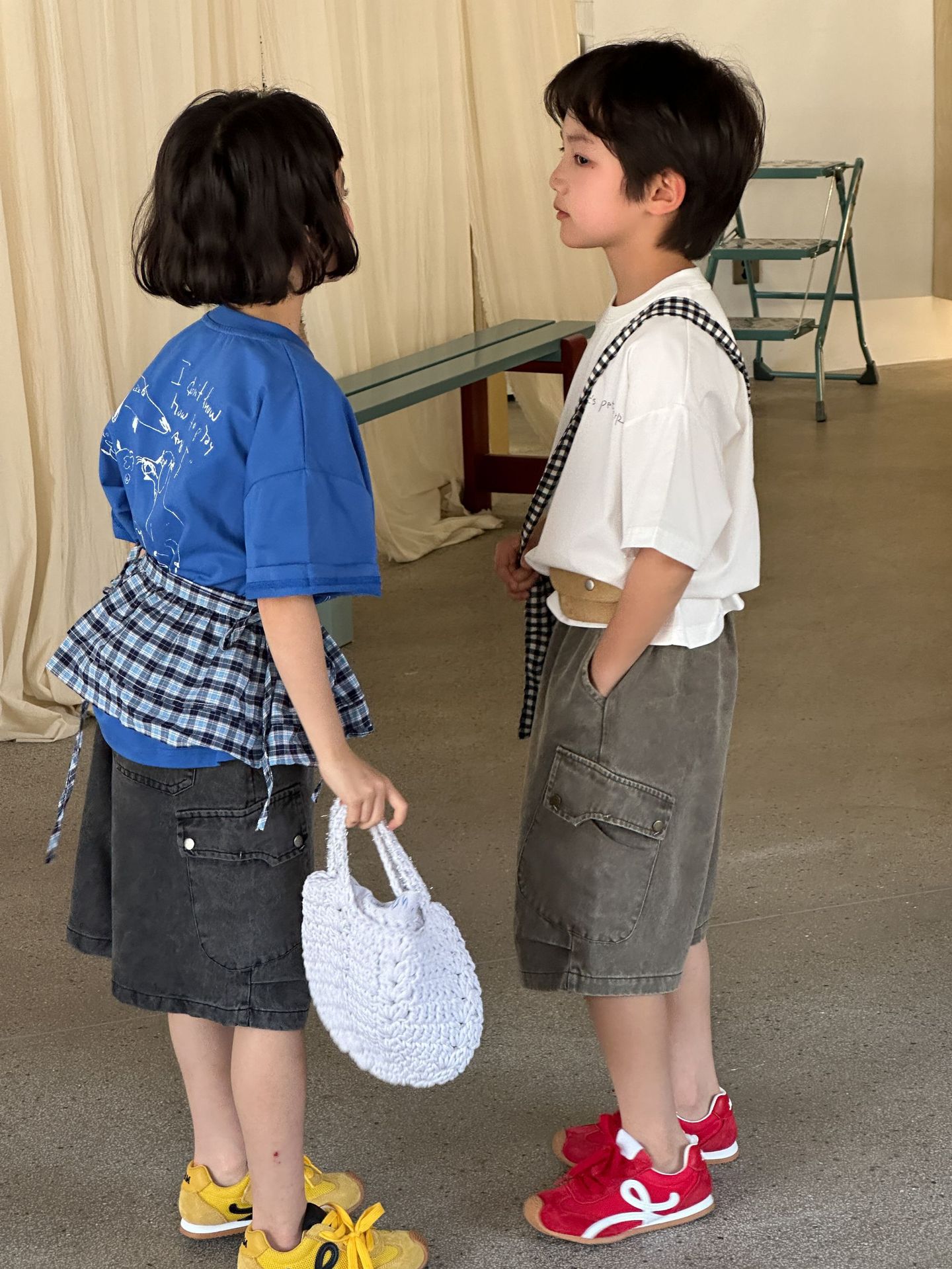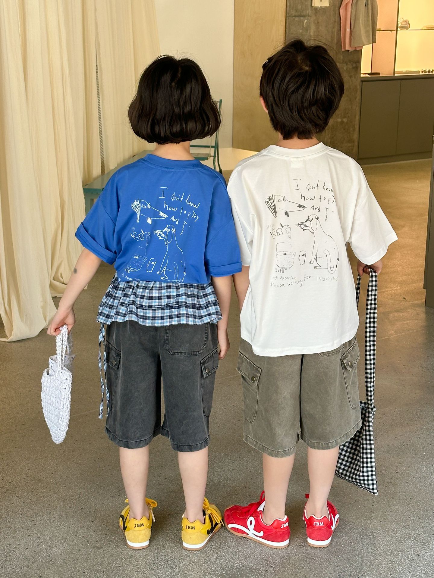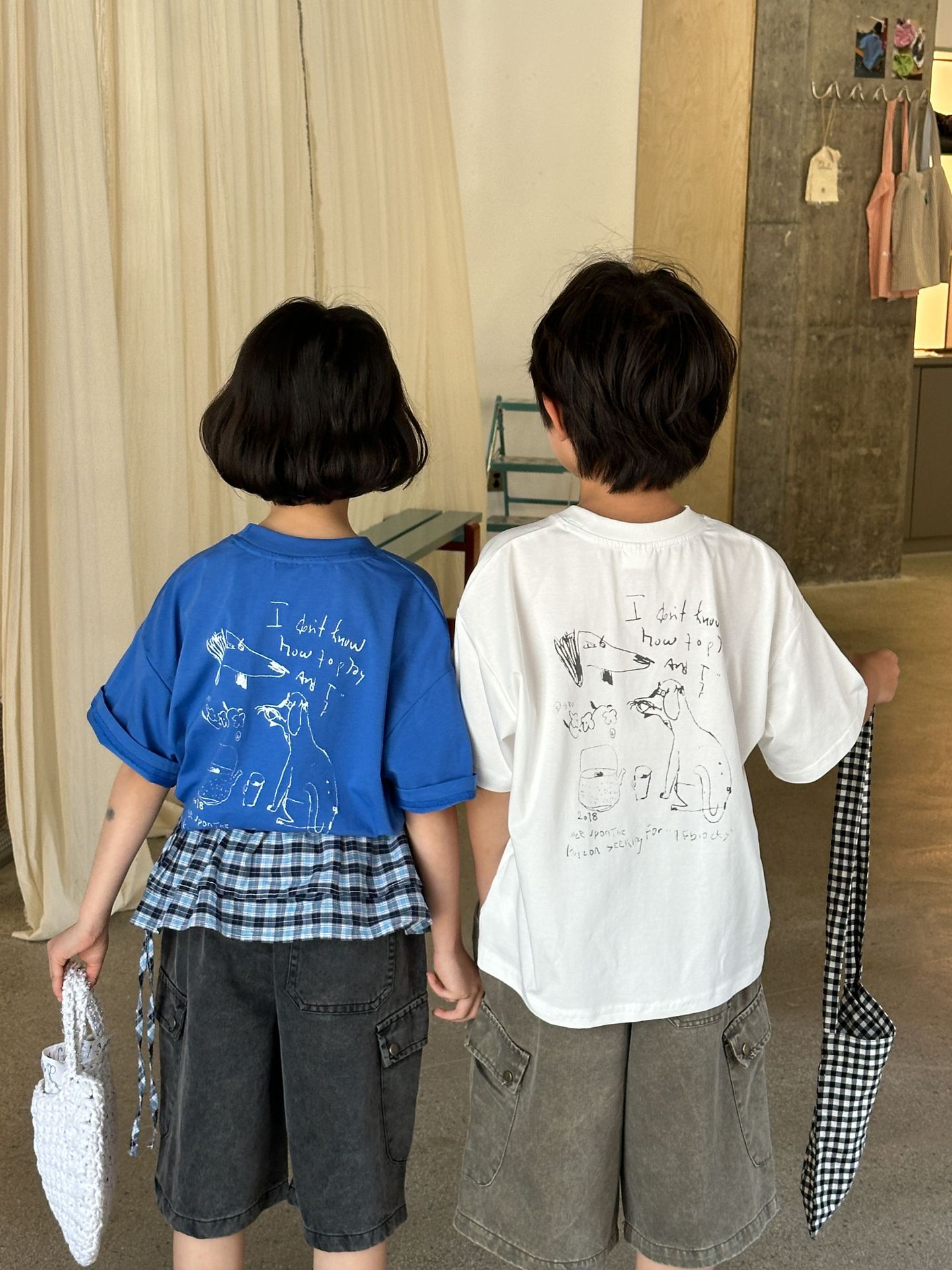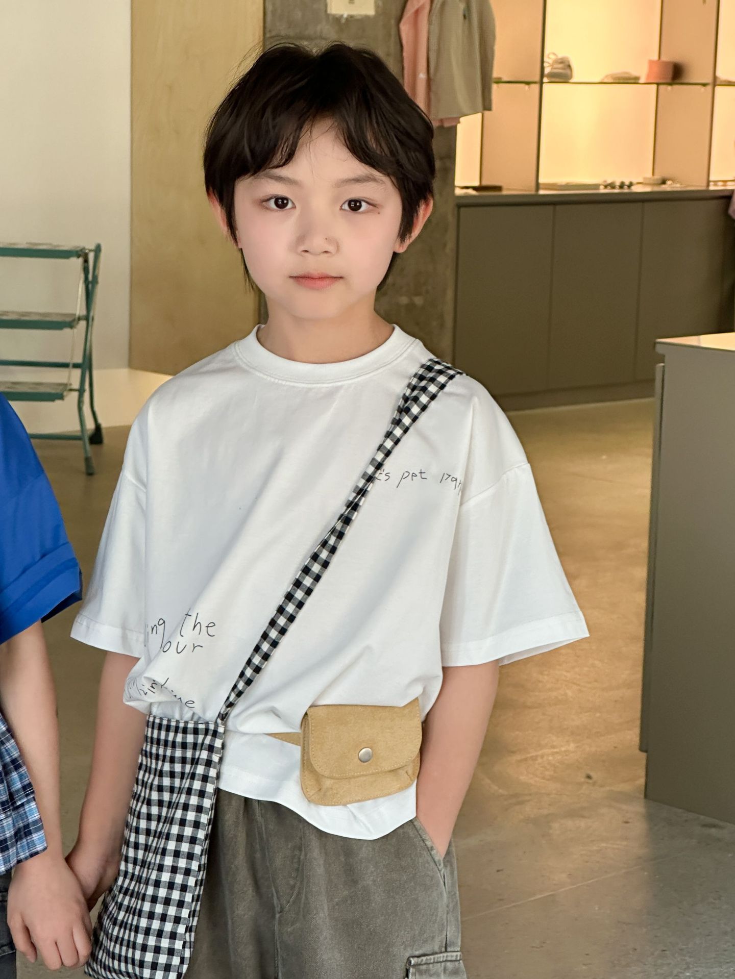 2025년 새로운 여름 한국식 어린이 앞면과 뒷면 프린트 반팔 흰색 사파이어 블루 라운드 넥 루즈 티셔츠 소년 소녀용스토어 가기