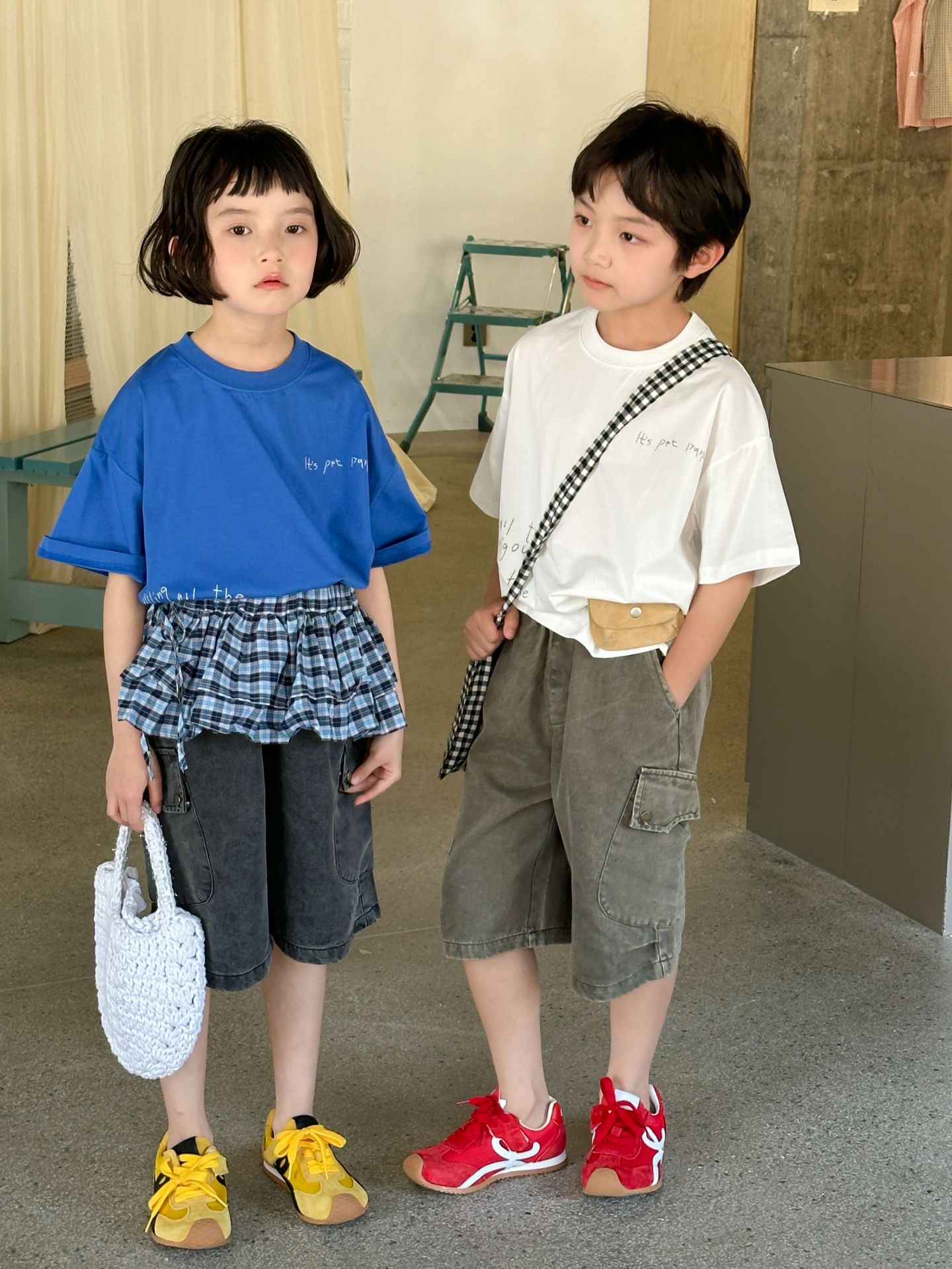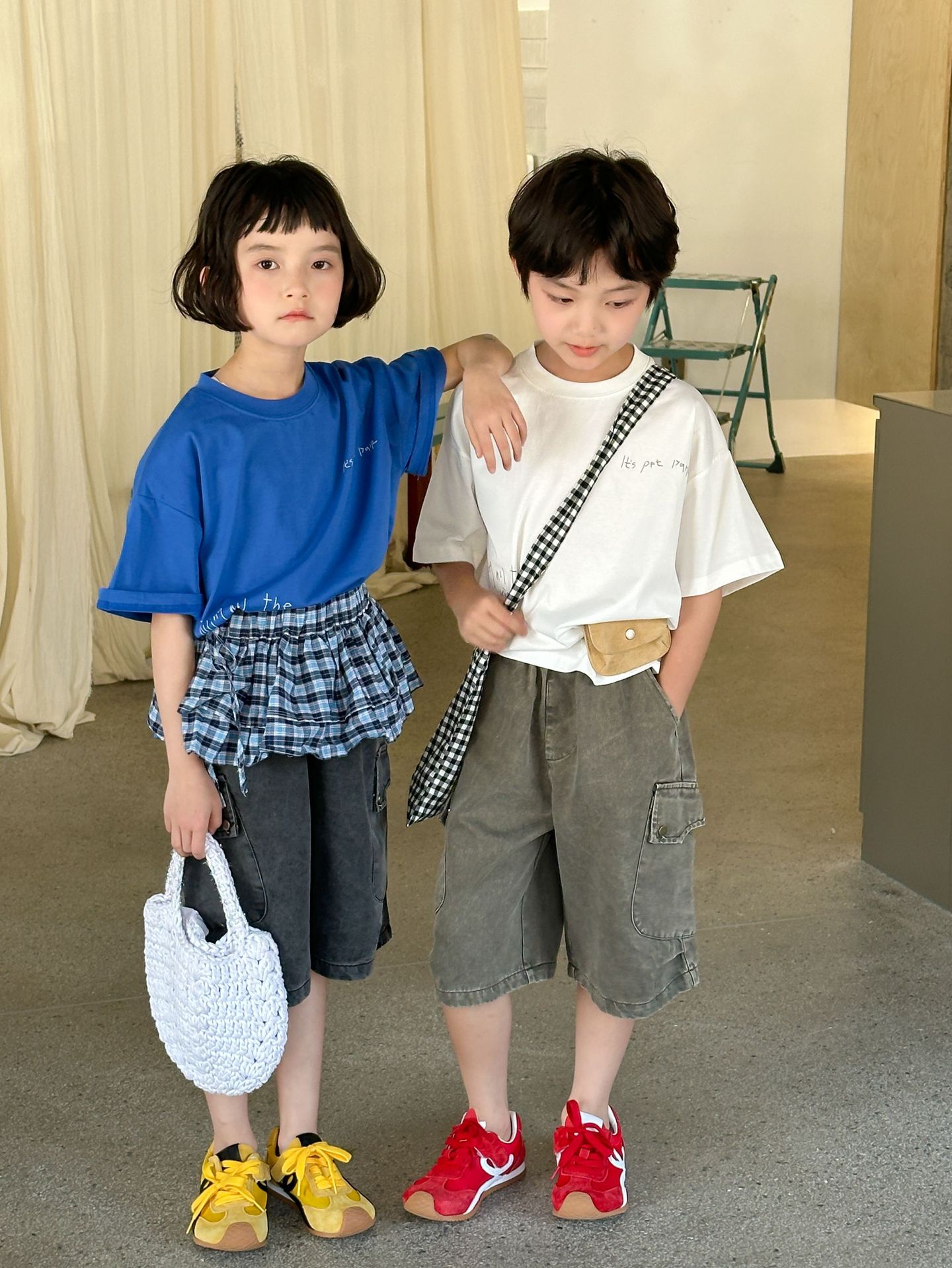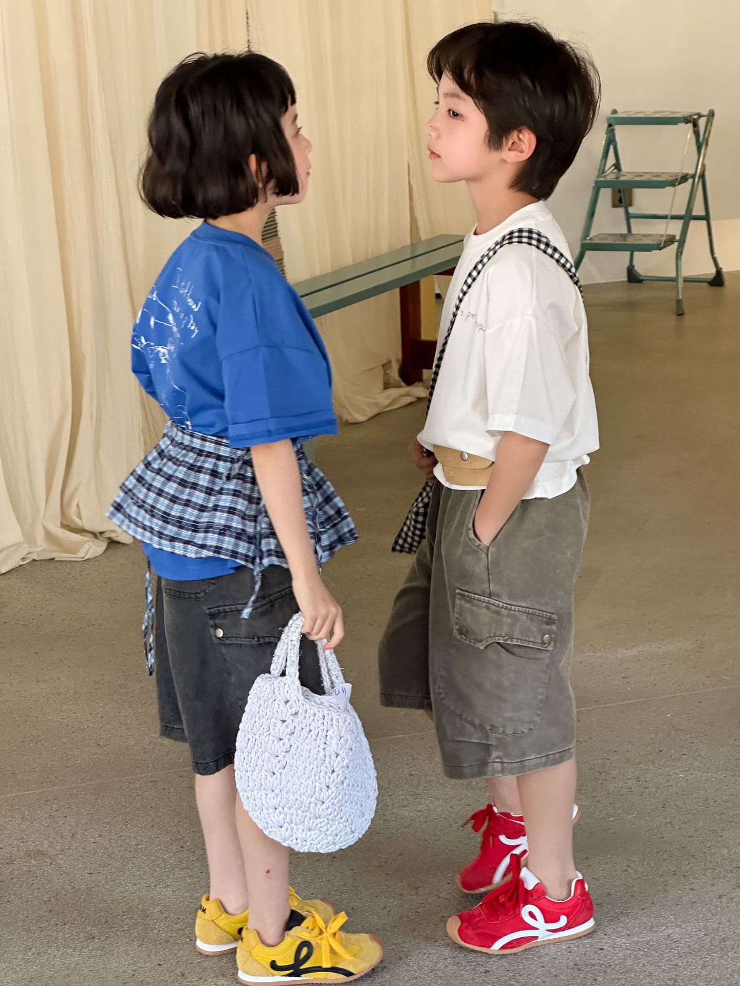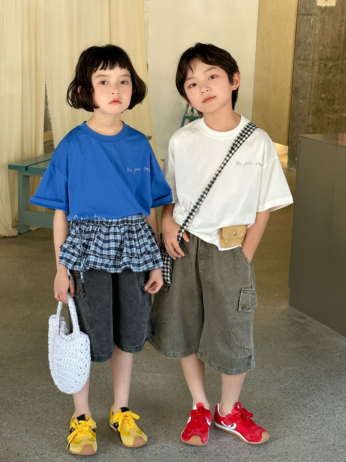 2025년 새로운 여름 한국식 어린이 앞면과 뒷면 프린트 반팔 흰색 사파이어 블루 라운드 넥 루즈 티셔츠 소년 소녀용스토어 가기