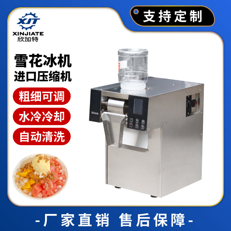 雪花冰机可用于做不同形状的雪花冰,面条冰,面皮冰,采用进口压缩机,水冷制冷,具有出冰速度快,速度可调,粗细可调的特点,机器整机使用304不锈钢,彩屏操作,且自带清洗功能,易于使用与维护。