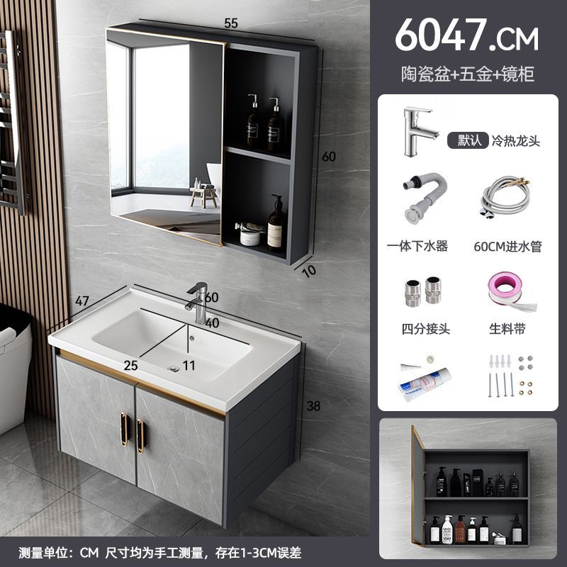 • 스톤 그레이 60CM 세라믹 세면대 캐비닛 + 수납 거울 캐비닛