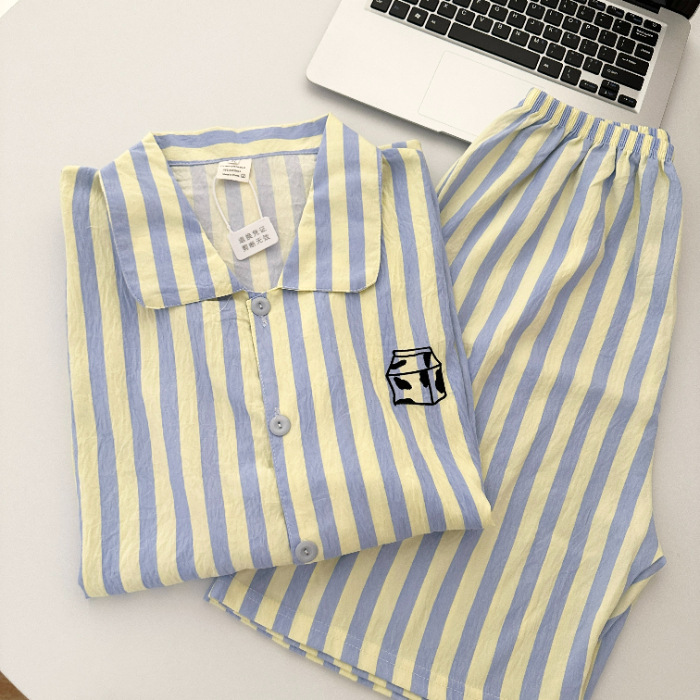 줄무늬 빵 커플 파자마 여름 얇은 카디건 Ins 게으른 파자마 여성의 새로운 구름 면화 홈 의류 남성스토어 가기