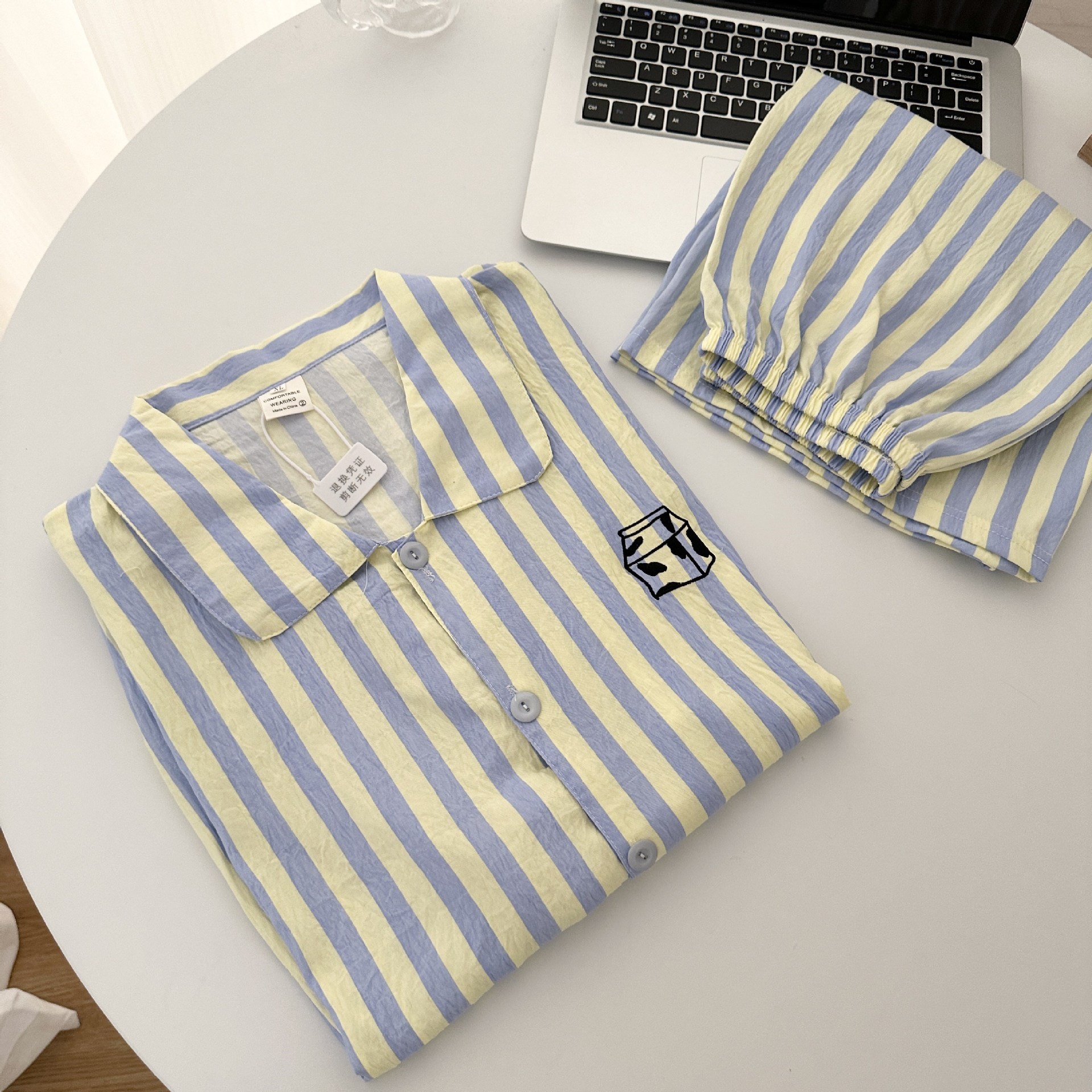 줄무늬 빵 커플 파자마 여름 얇은 카디건 Ins 게으른 파자마 여성의 새로운 구름 면화 홈 의류 남성