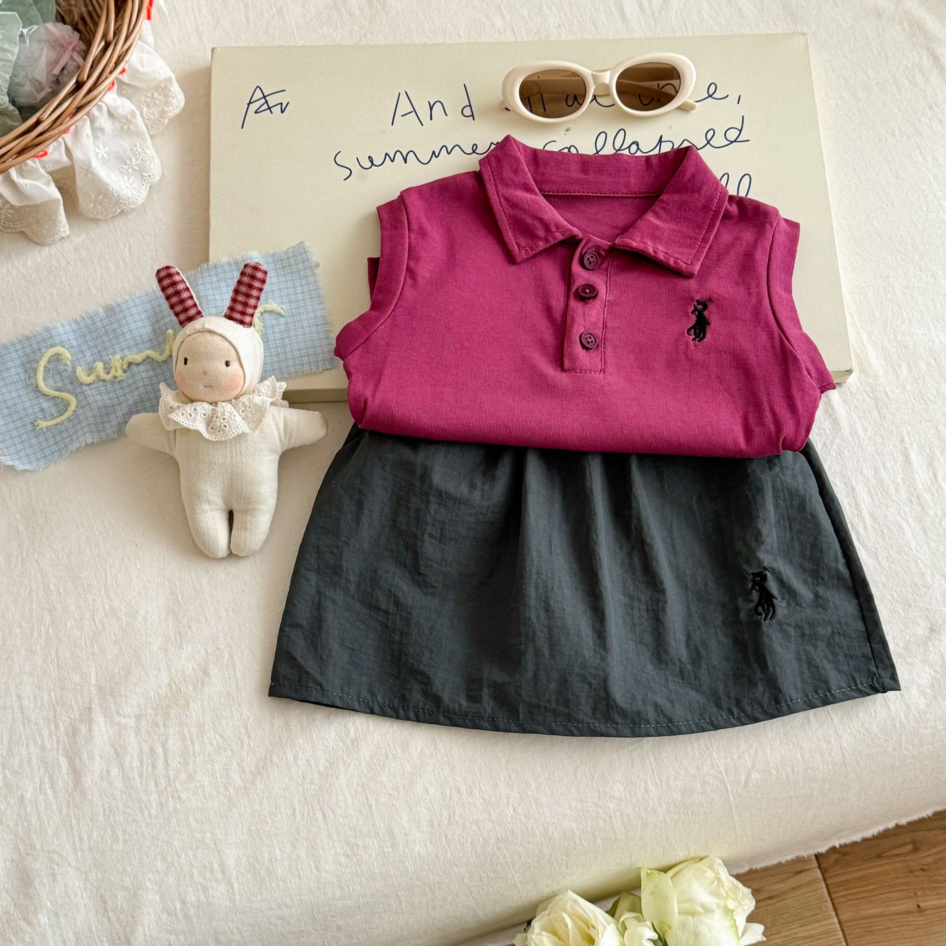 핑크 하우스 소녀 여름 정장 2025 여름 스타일 아기 소녀 폴로 칼라 조끼 탑 스커트 어린이스토어 가기